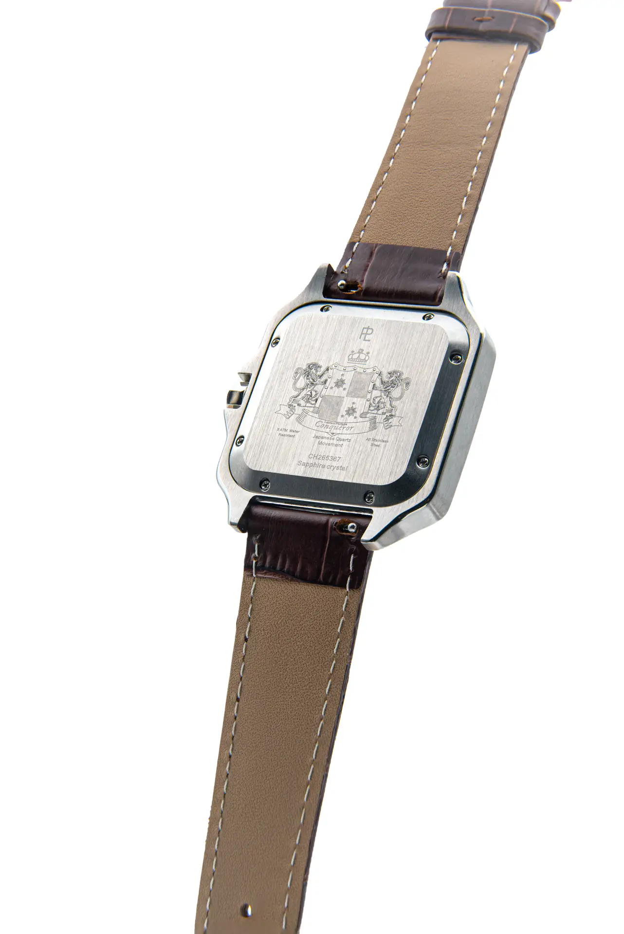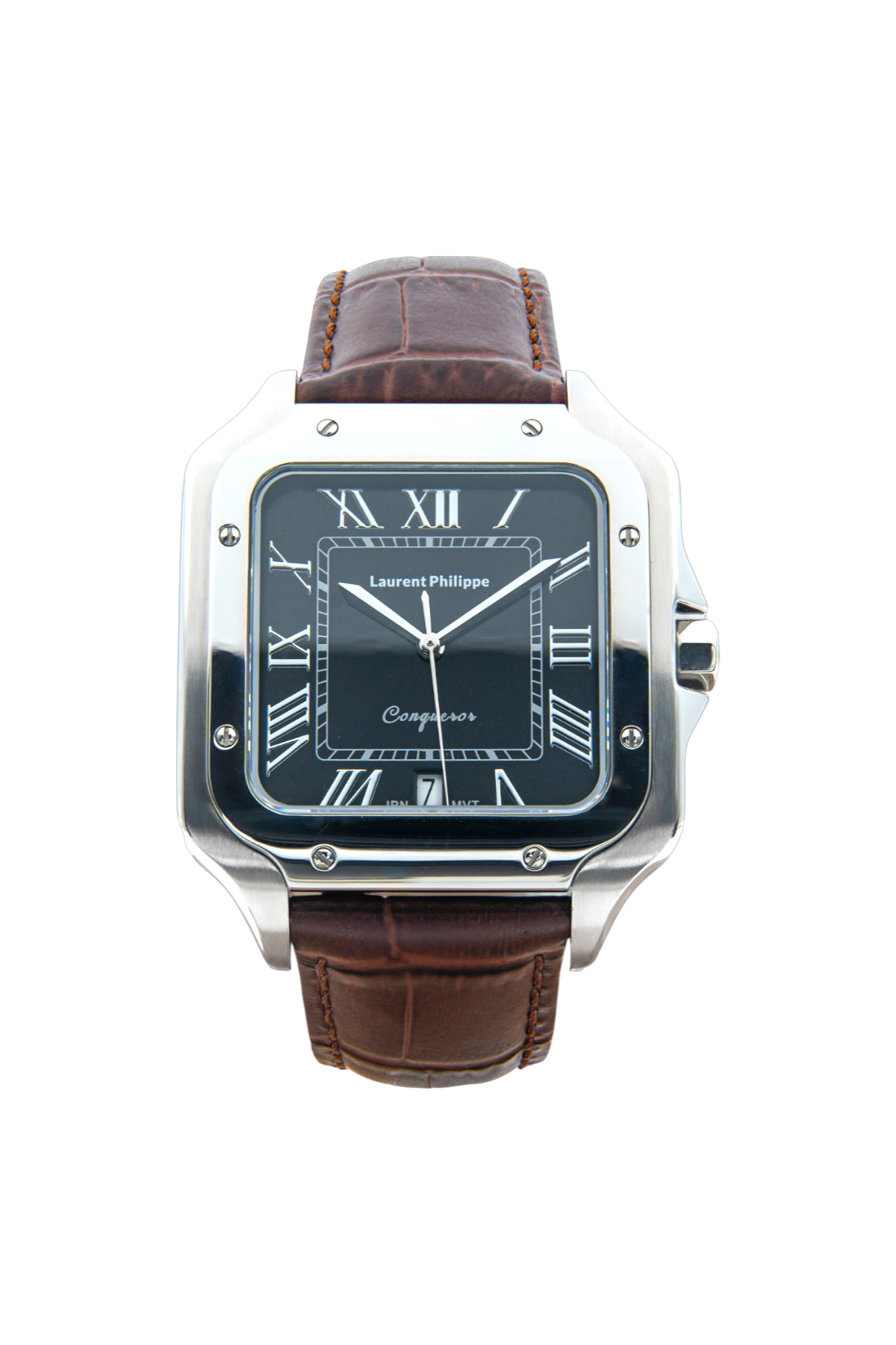 Silver watch with a deep black dial and embossed brown cowhide leather strap — sober, classic, and defined by timeless refinement.