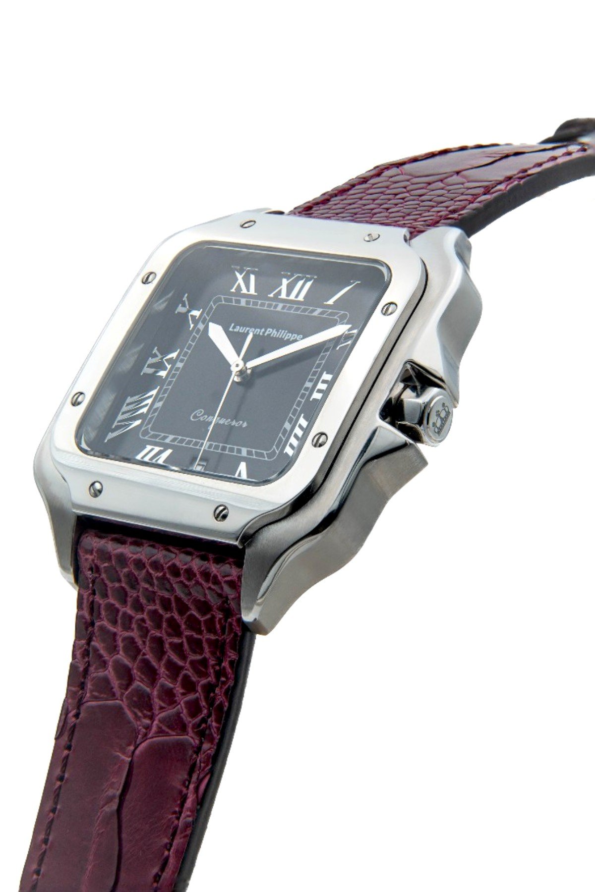 Polished steel watch with black dial and red-violet ostrich leather strap — bold, enigmatic, and unapologetically refined.