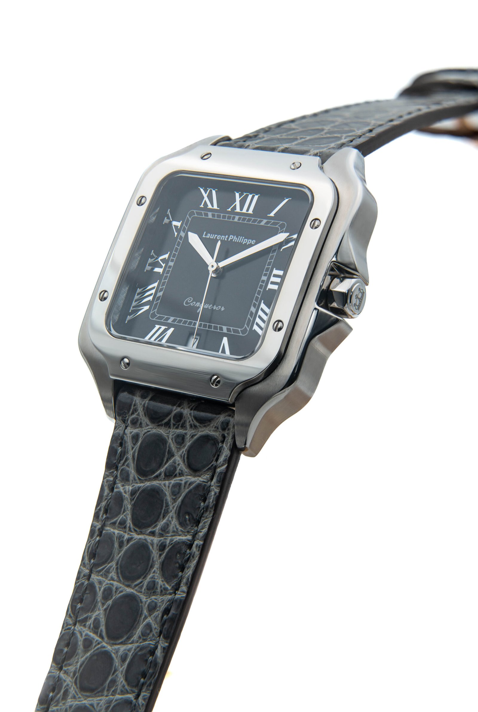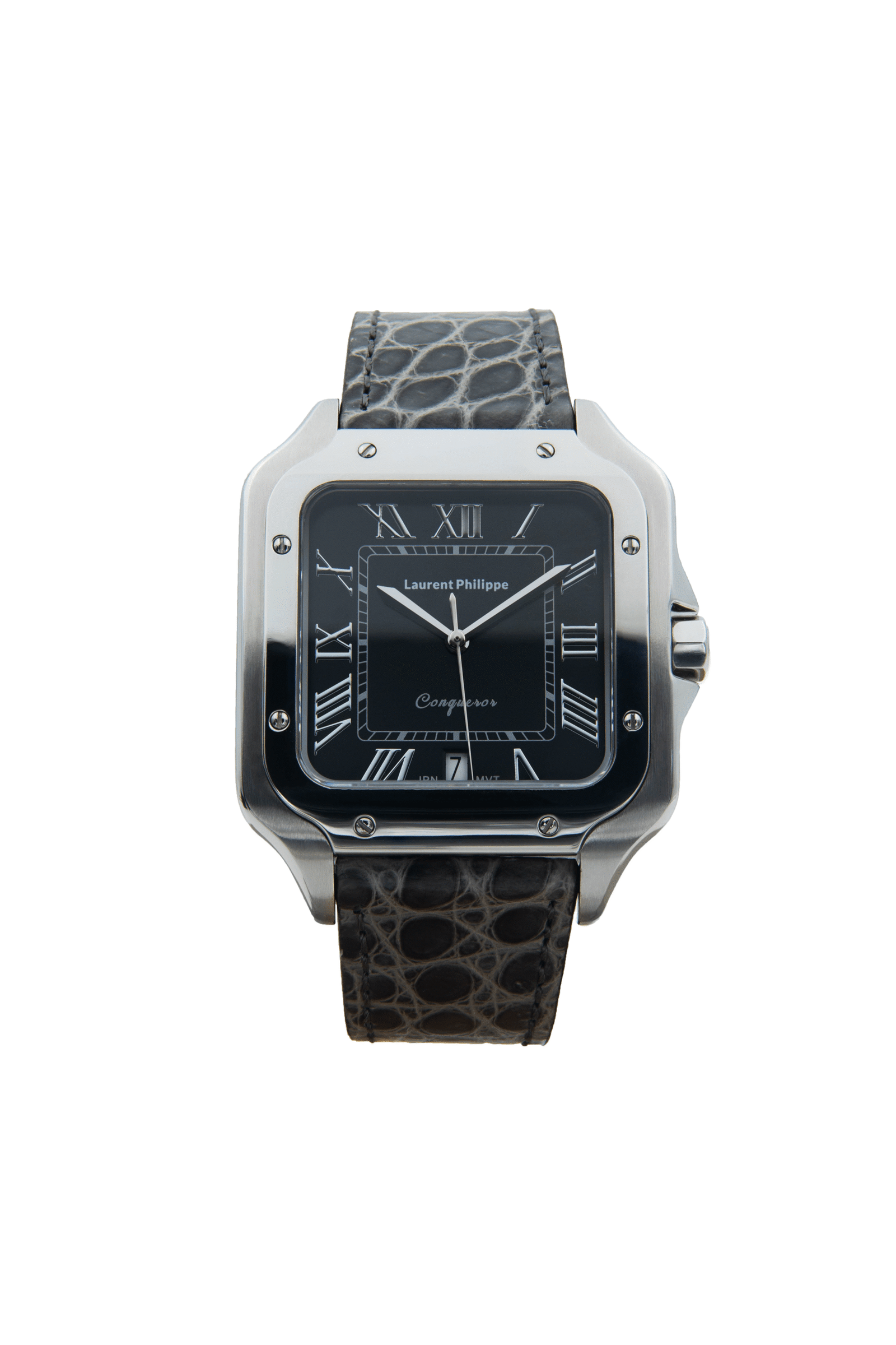 Polished steel watch with black dial and grey crocodile leather strap — stark, sculptural, and dangerously composed.