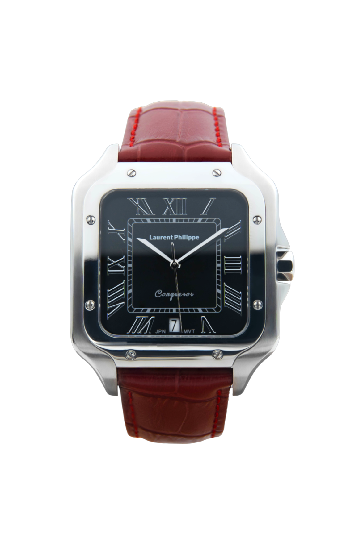 The dial sets the tone: a deep, mirror-black surface framed by polished steel — cold, reflective, and unmistakably precise. Silver Roman numerals and sword-like hands carve out a sense of control, composure, and quiet dominance. That foundation meets its counterpart in the Rouge Sauvage strap: handcrafted from crimson cow leather, it doesn’t soften the silhouette — it amplifies it. Bold in tone, tactile in texture, and designed for presence, not approval.