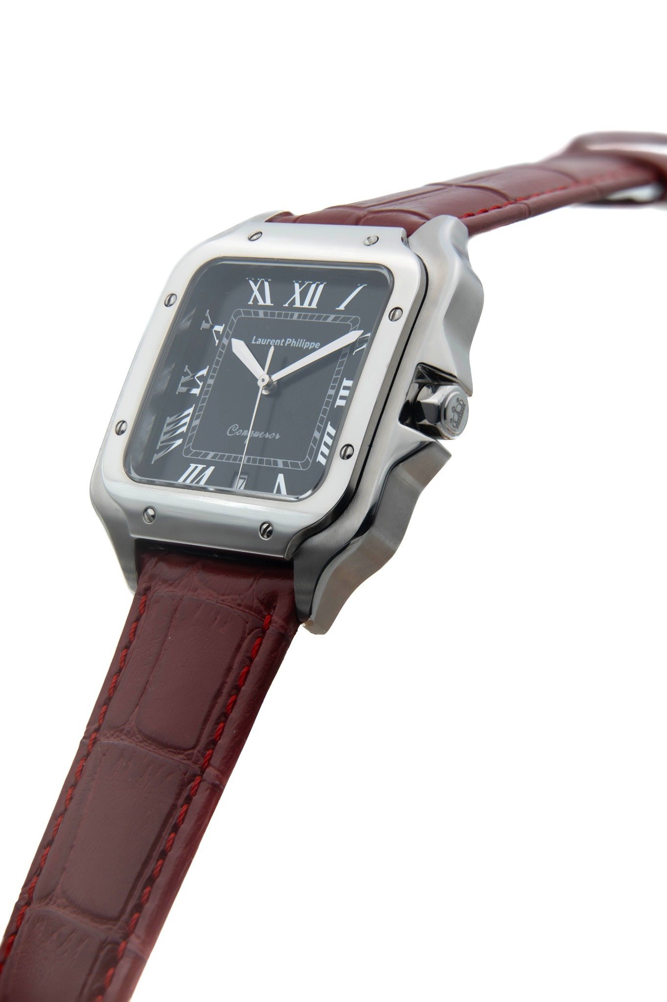 Steel watch with black dial and crimson cow leather strap — sleek, assertive, and uncompromising in attitude.