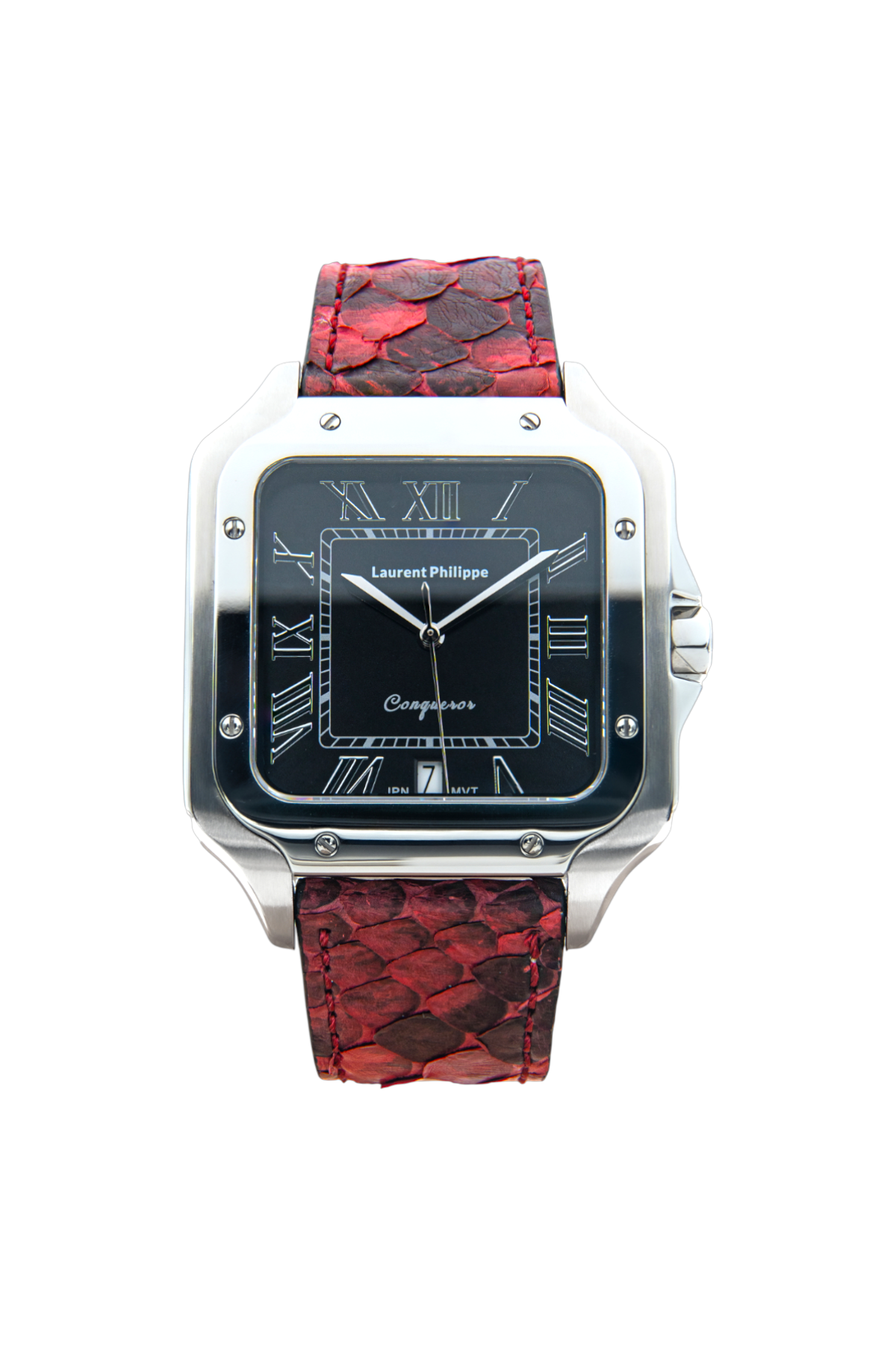 Silver-tone watch with black dial and red exotic snakeskin strap — intense, sensual, and dangerously refined.