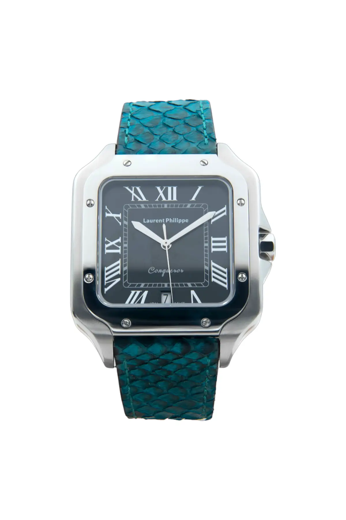The dial is deep black, mirror-like and cold, marked by silver Roman numerals and pale hands that slice through the surface. The case is polished steel — sculptural, severe, and without warmth. The Blue Venin strap, handcrafted from exotic snakeskin in a saturated teal-blue, brings contrast and bite. Every edge is clean. Every choice is intentional. Nothing here fades into the background.