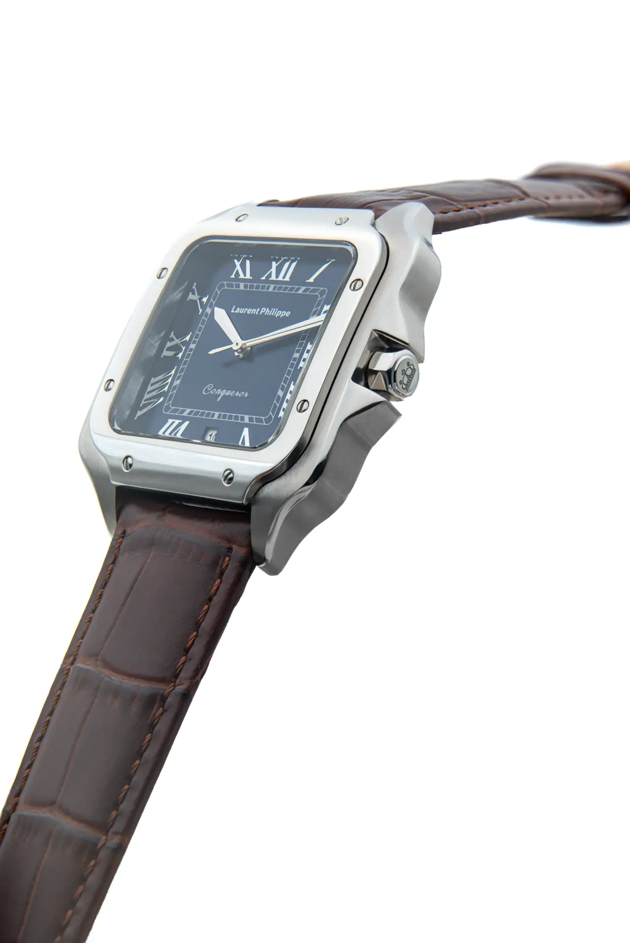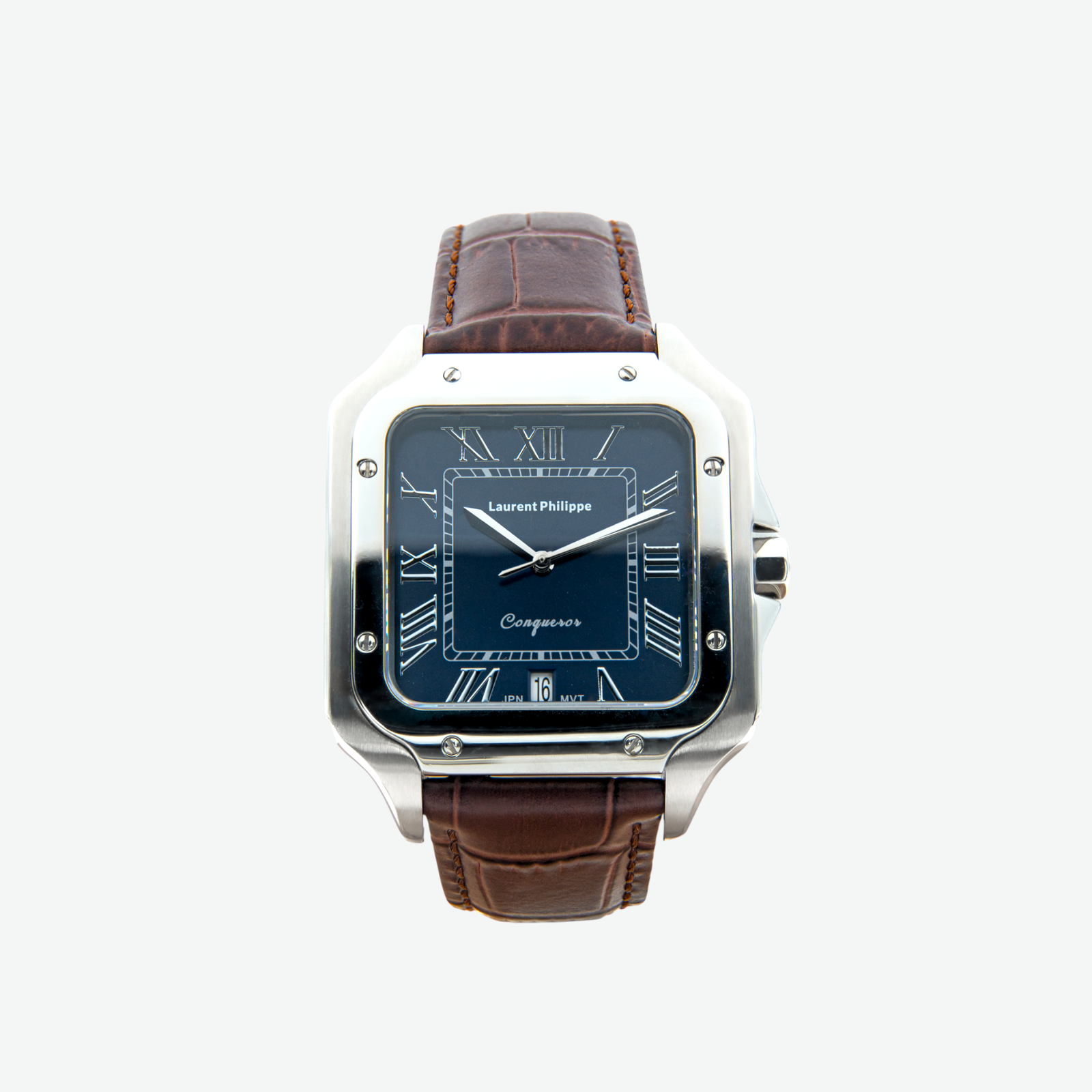 Silver-tone watch with sapphire blue dial and dark brown cow leather strap — elegant, intense, and unapologetically refined.