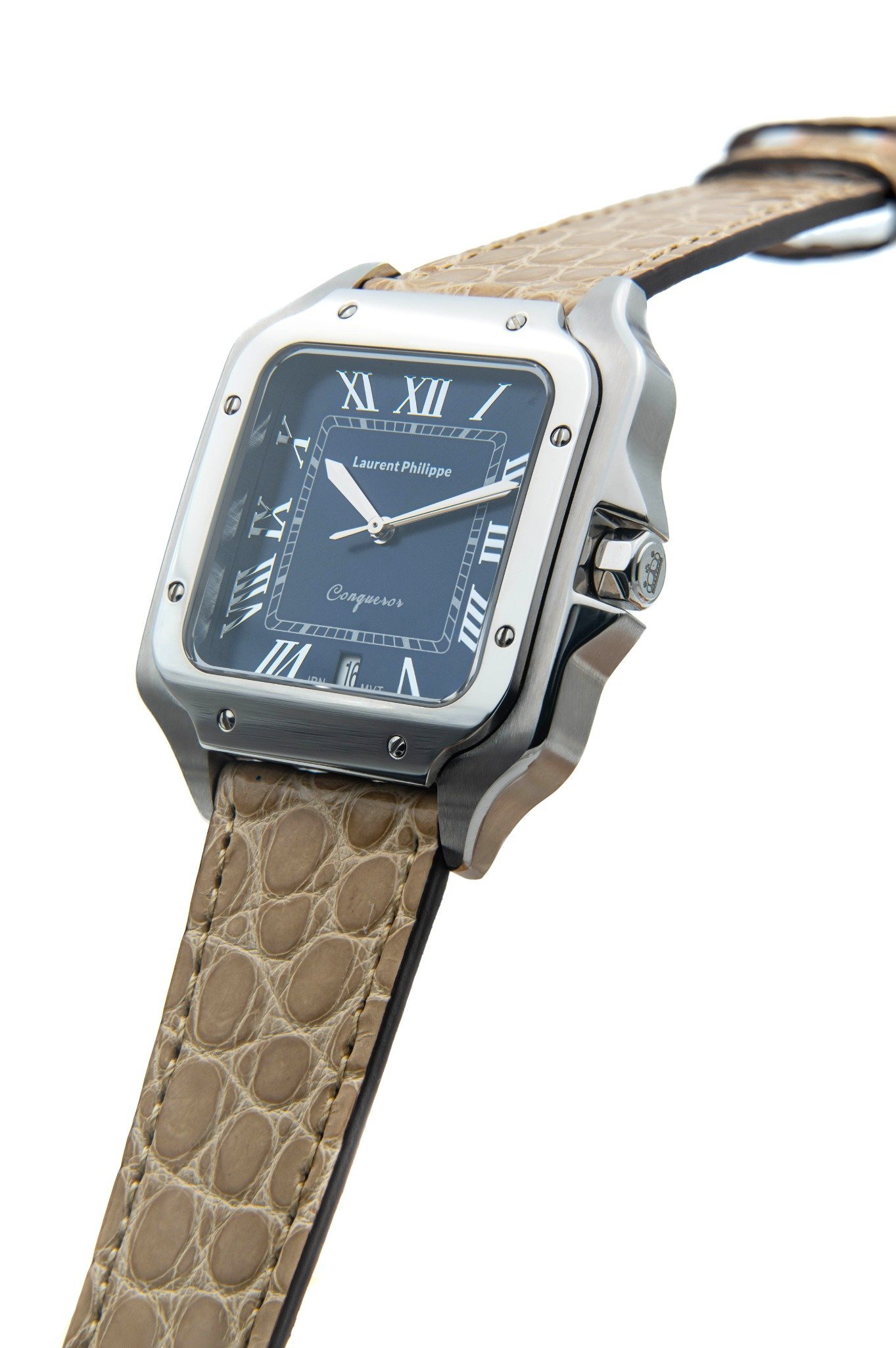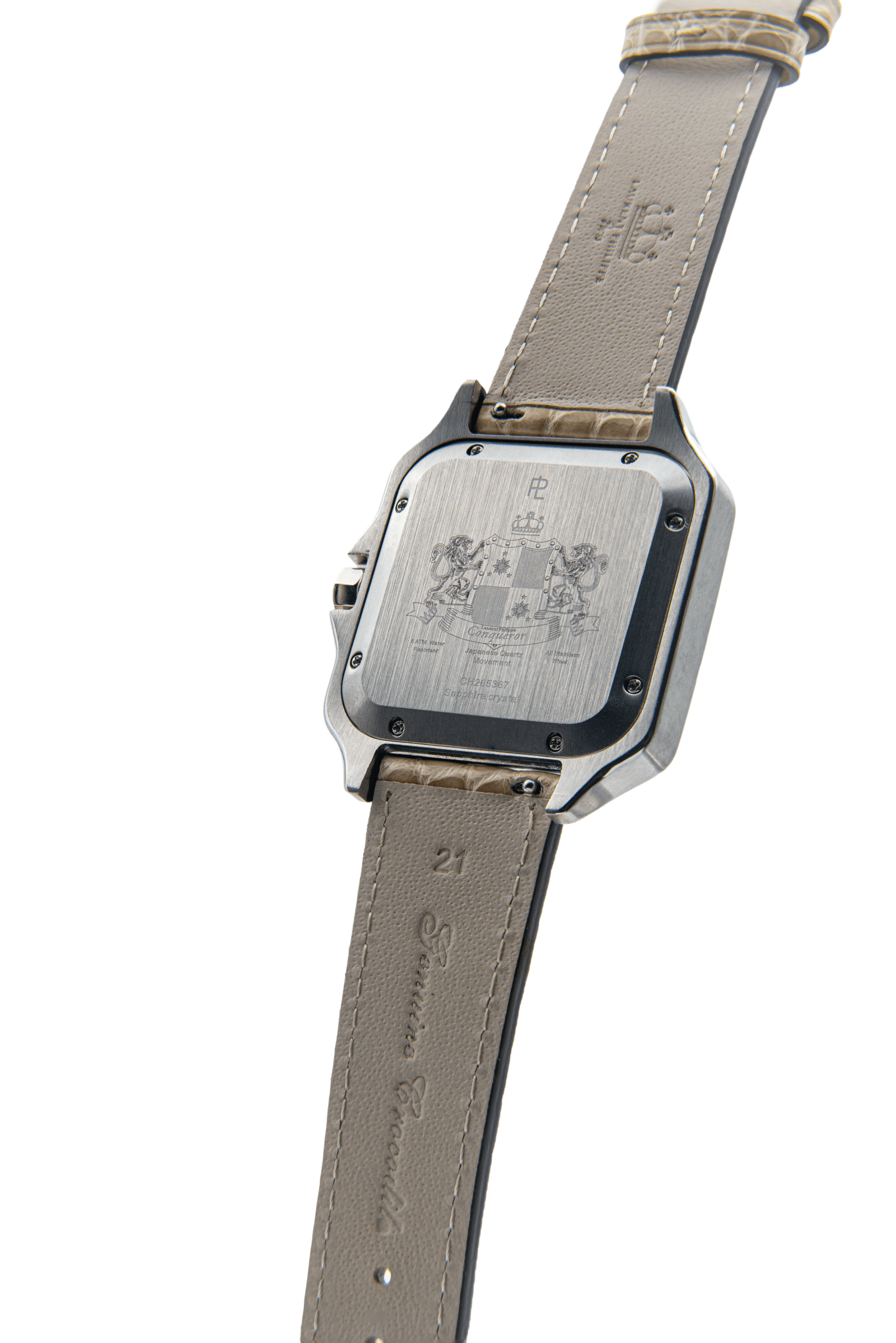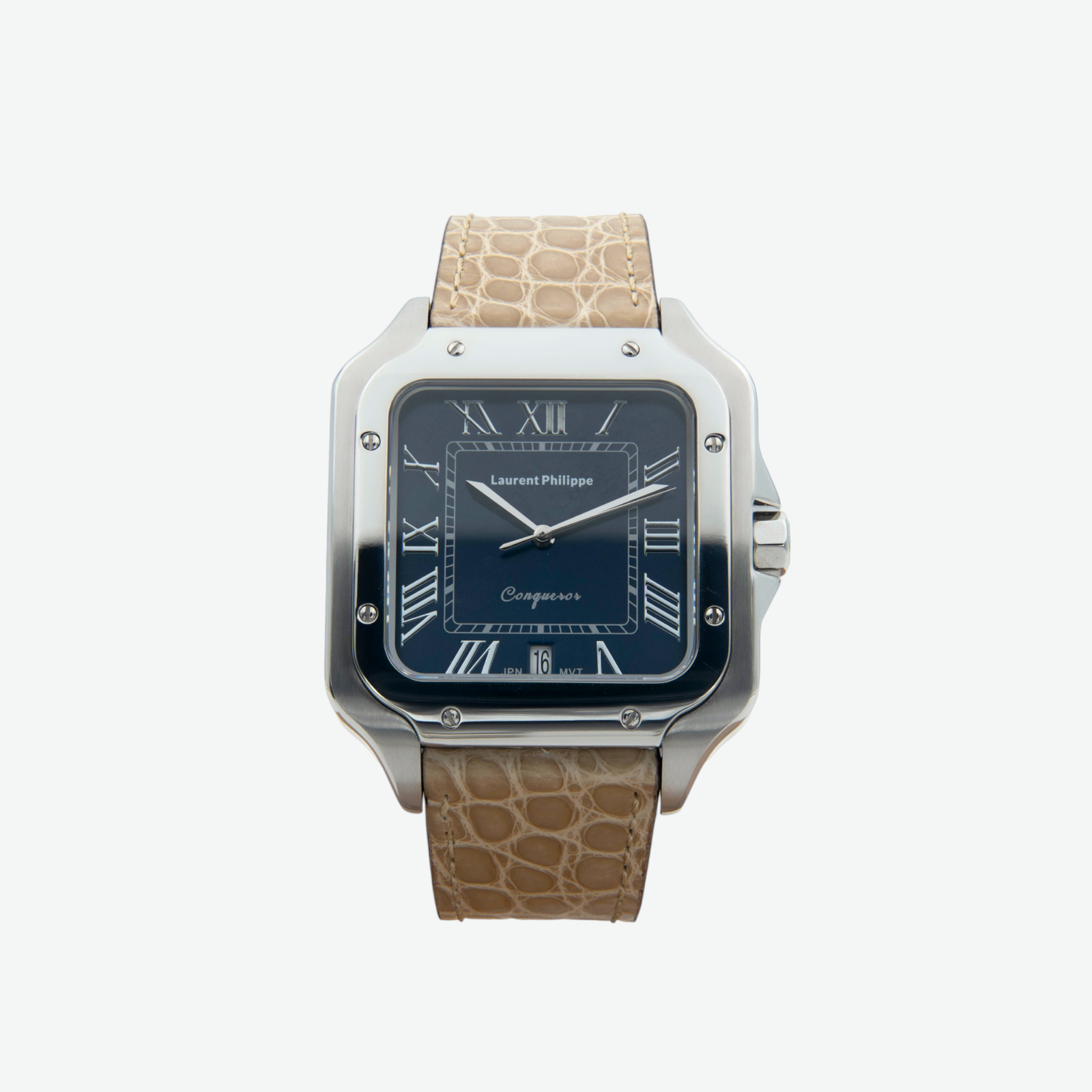 The dial is a sharp, luminous blue — rich and unapologetically deep. Framed by cold steel, it commands light with a mirrored intensity. The Desert Pearl strap, crafted from genuine crocodile leather, brings in an unexpected softness of tone, but never of character. Together, they create an impression that’s sculpted, seductive, and emotionally exact.