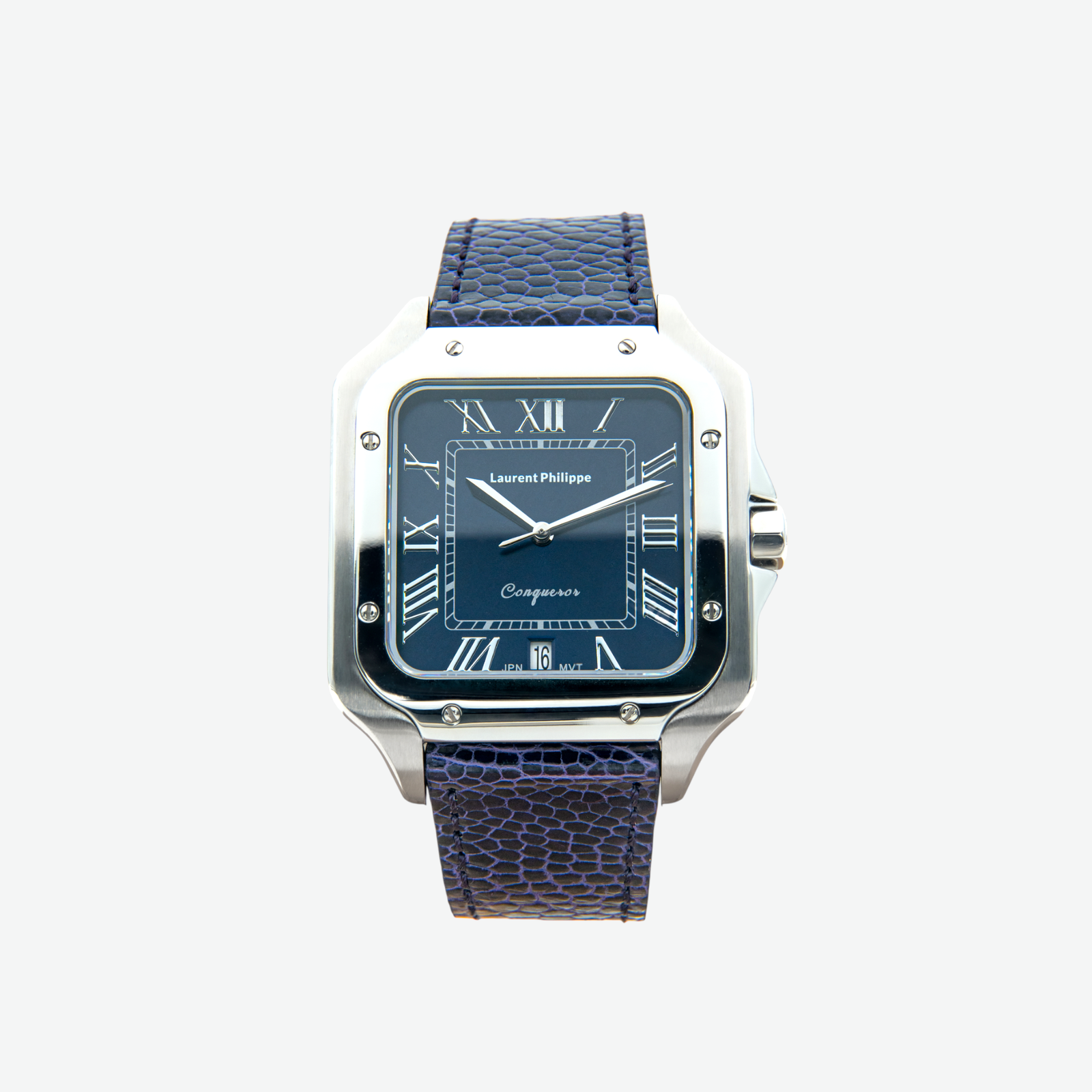 Silver-tone watch with sapphire blue dial and textured ostrich leather strap — intense, refined, and charged with attitude.