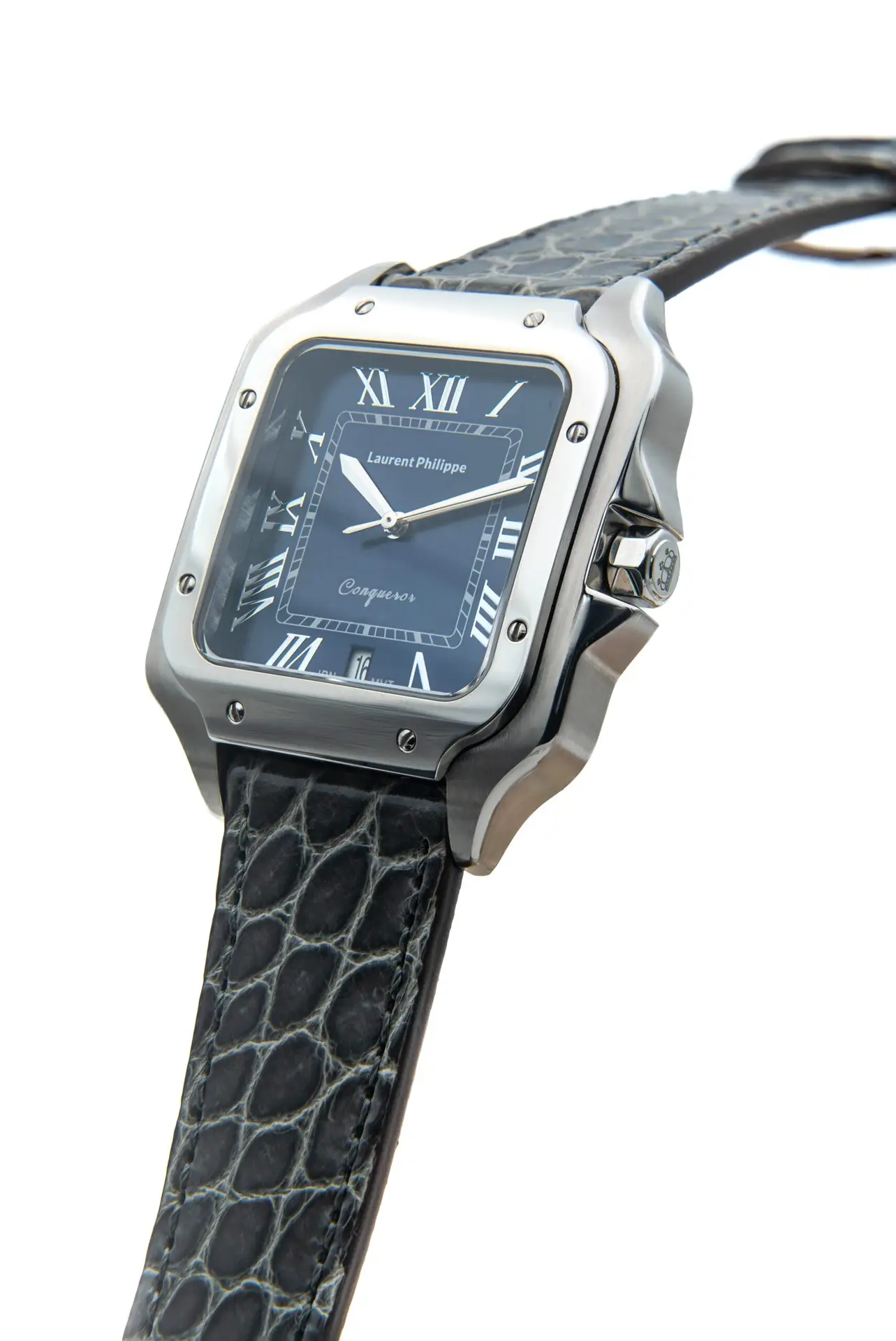 The dial is a dense sapphire blue — sharp, cold, and luminous under light. It’s held in place by polished steel and anchored by the Platinum Veins strap: genuine crocodile leather in a metallic grey tone, with a pattern that feels organic, yet engineered. There’s nothing soft here — only clarity, contrast, and a controlled form of seduction.