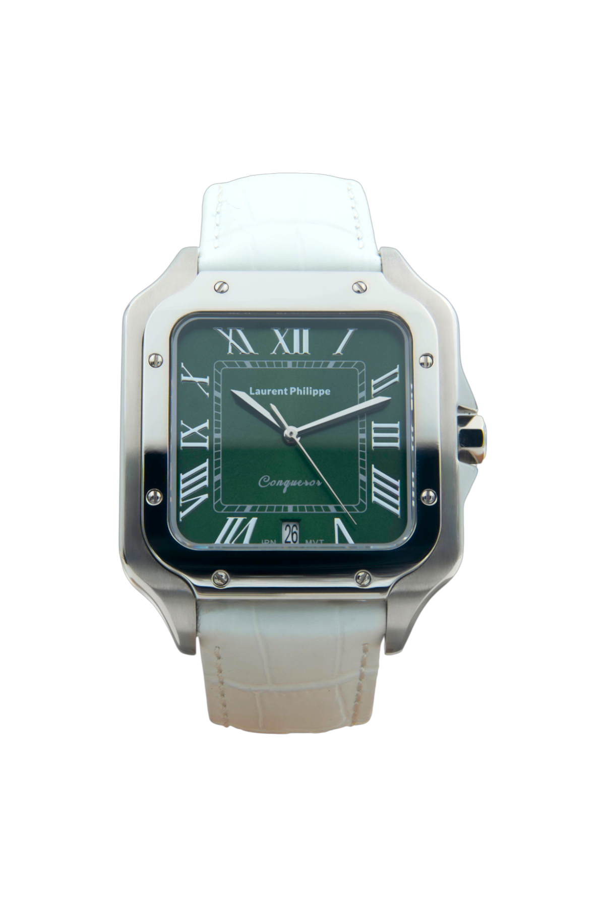 Men €550.00Add to cartLuxury steel watch with white dial and dark green ostrich leather strap — a magnetic blend of regal clarity and nocturnal sophistication.