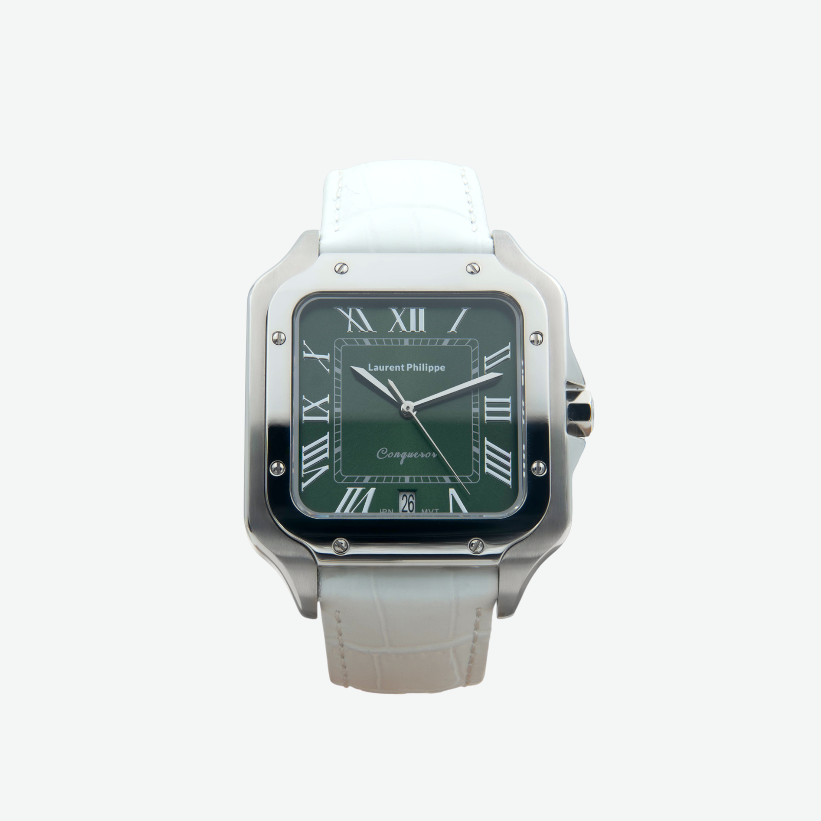 Silver-tone watch with emerald green dial and white cow leather strap — radiant, provocative, and sculpted with contrast.