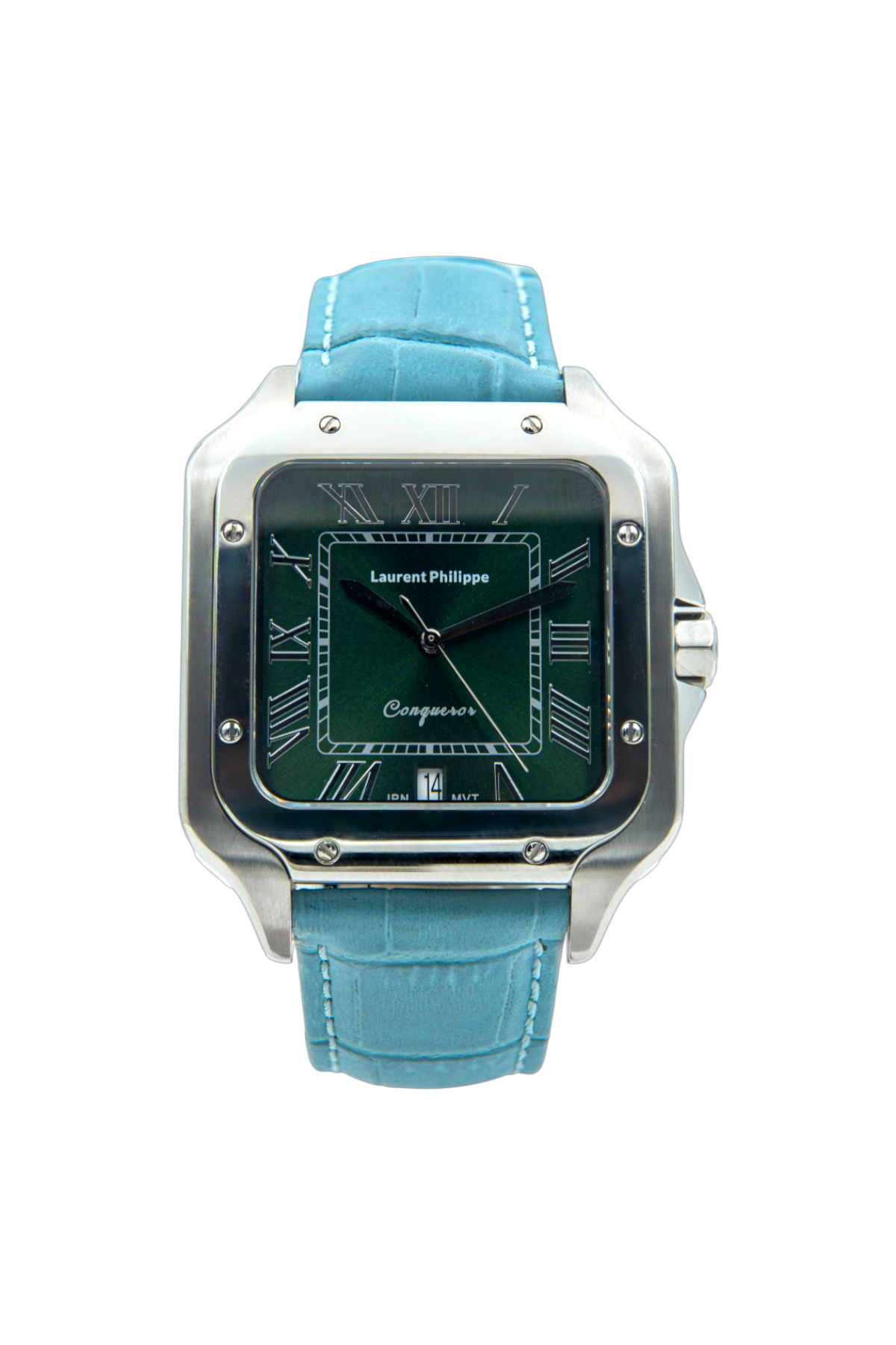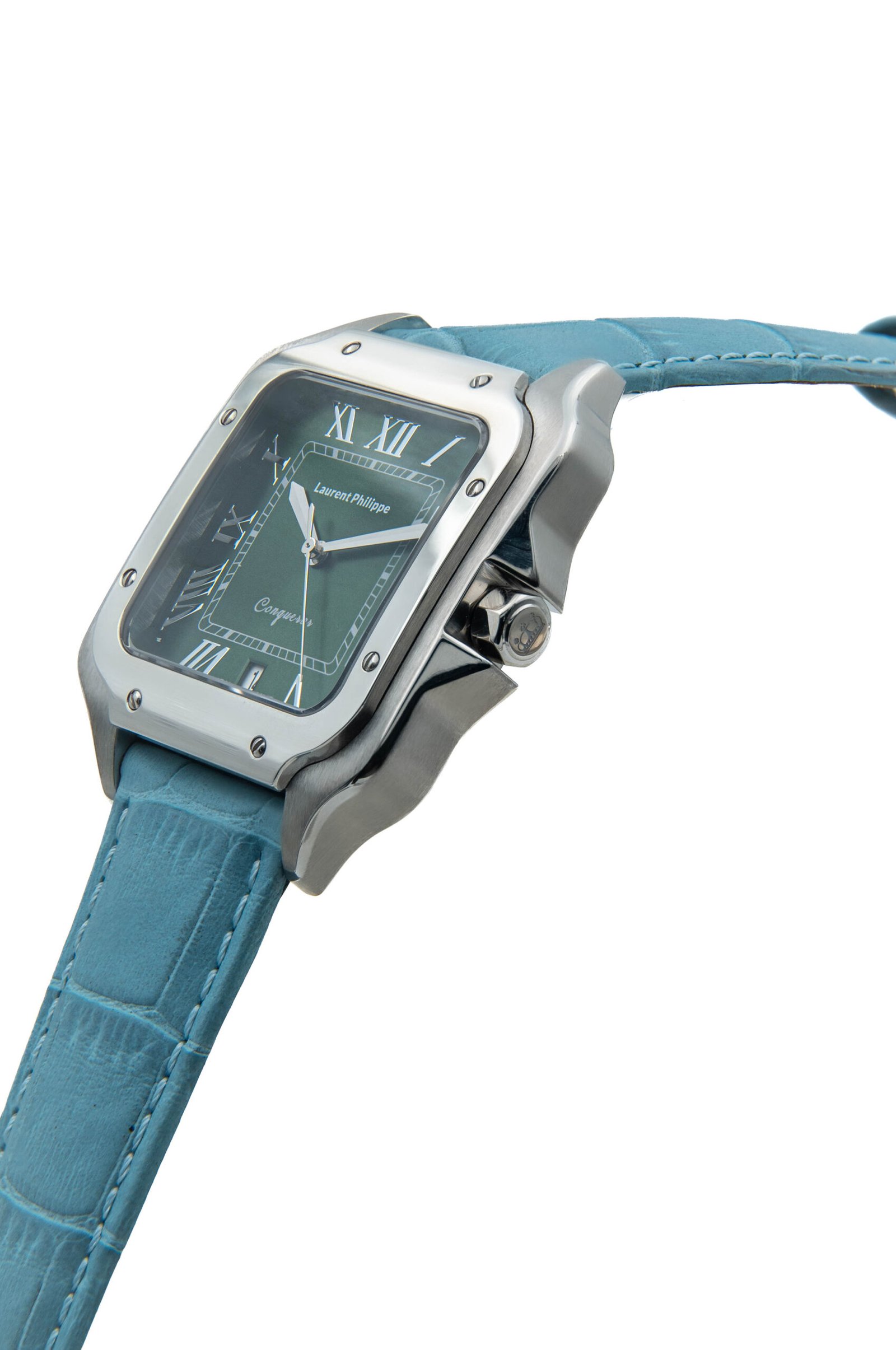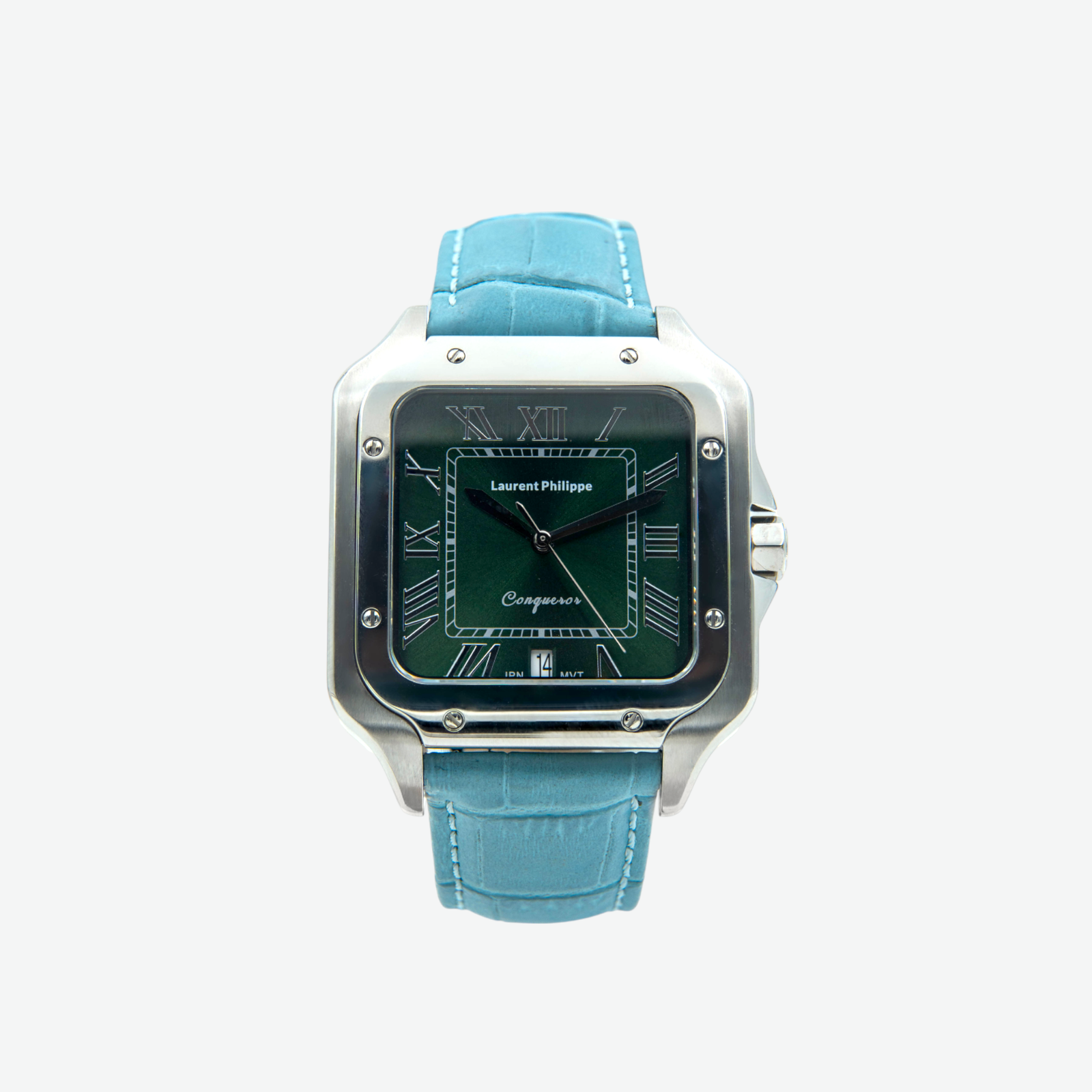 Silver-tone watch with emerald green dial and pale blue cow leather strap — refined contrast with delicate bite.