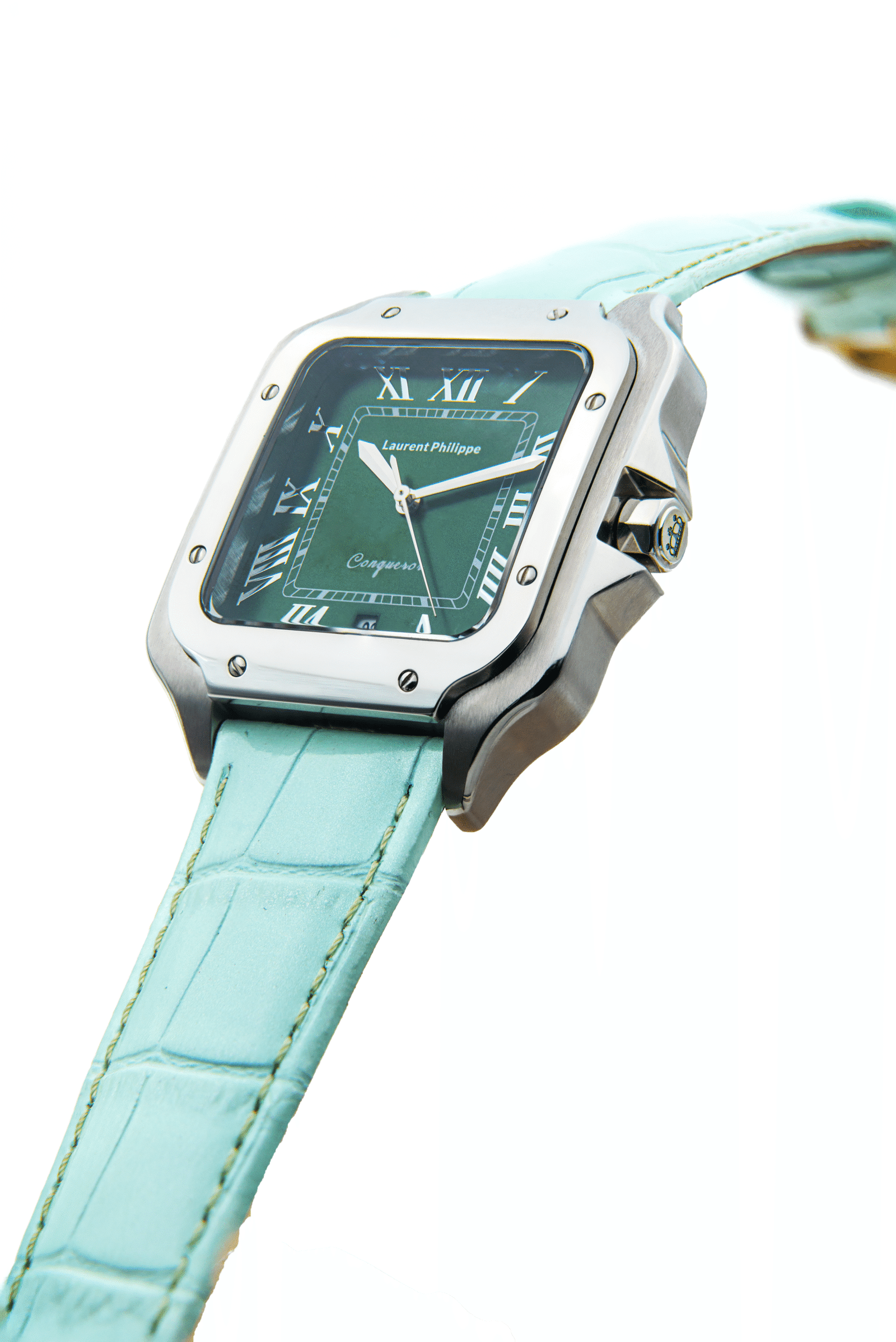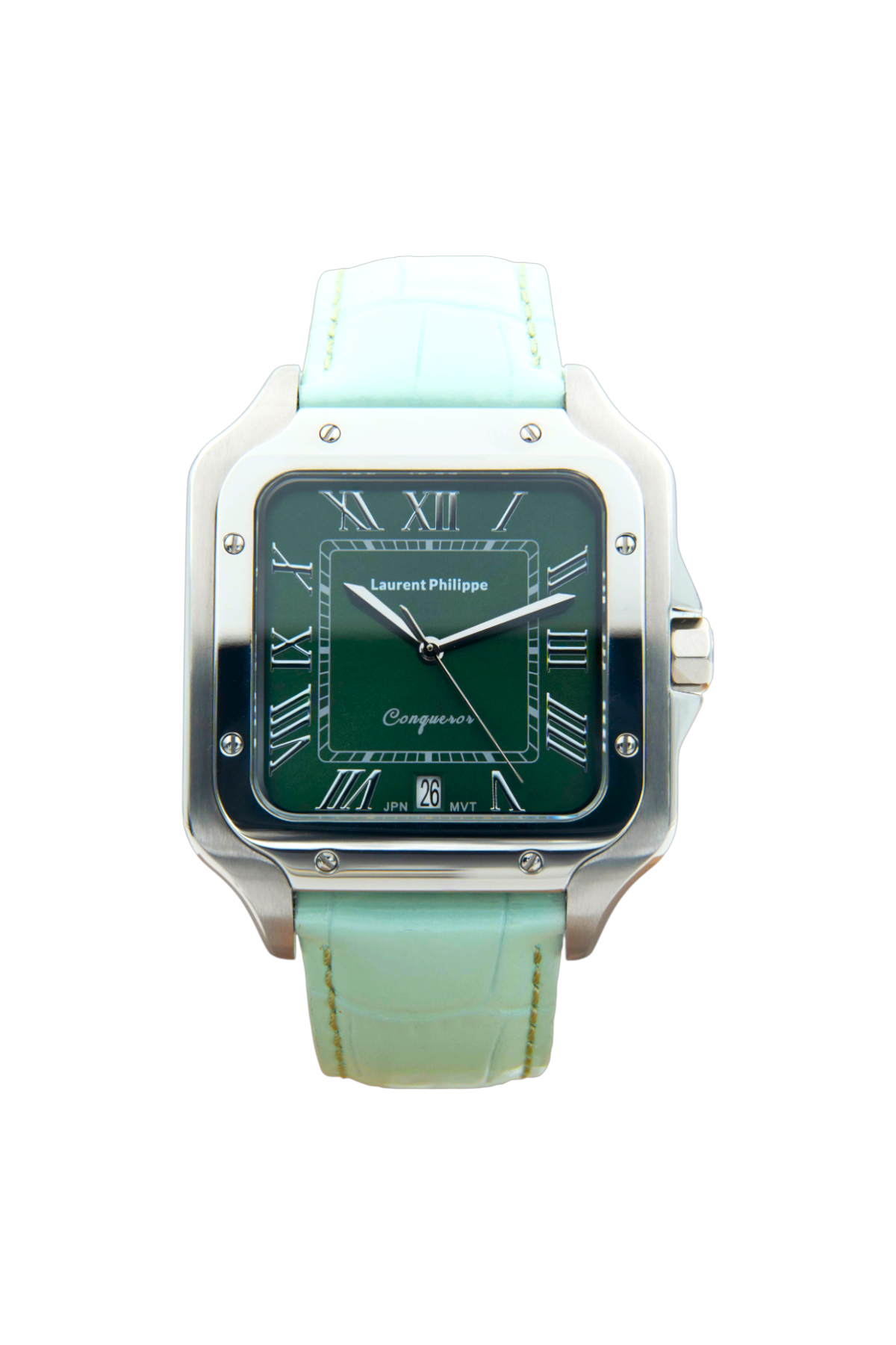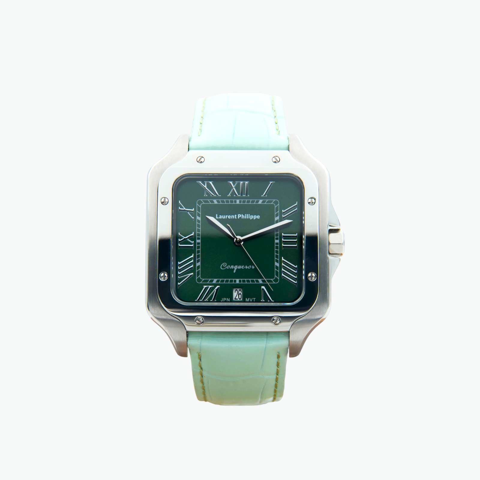 Steel watch with emerald dial and mint-colored cow leather strap — bright, sharp, and quietly provocative.