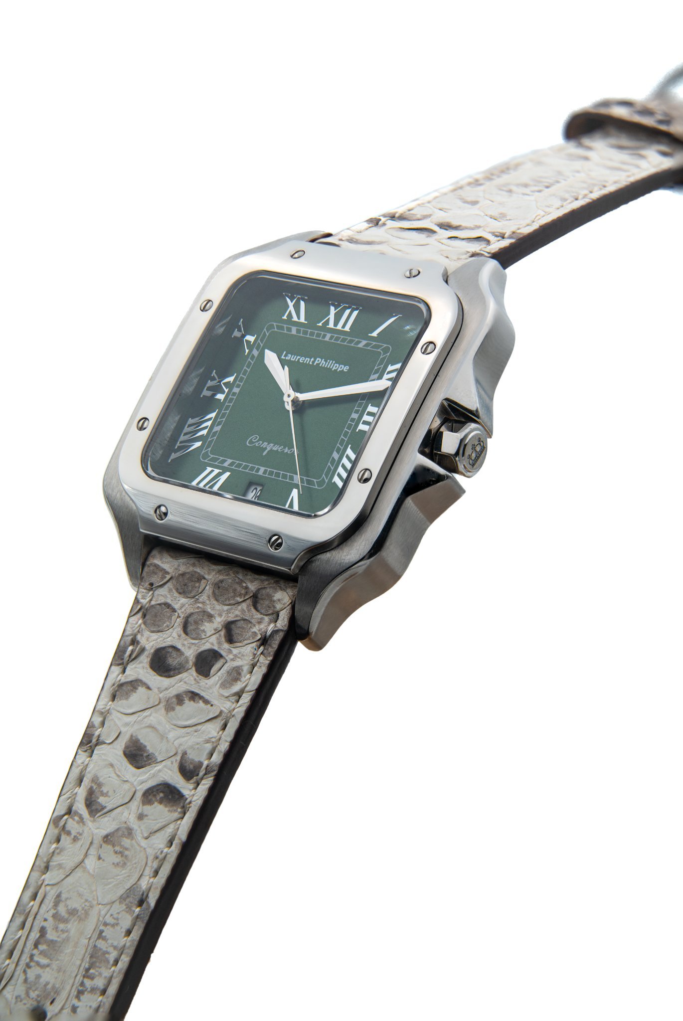 Men €500.00Add to cartLuxury watch with white dial, steel case, and handcrafted chartreuse python leather strap — a bold statement of danger, desire, and control.