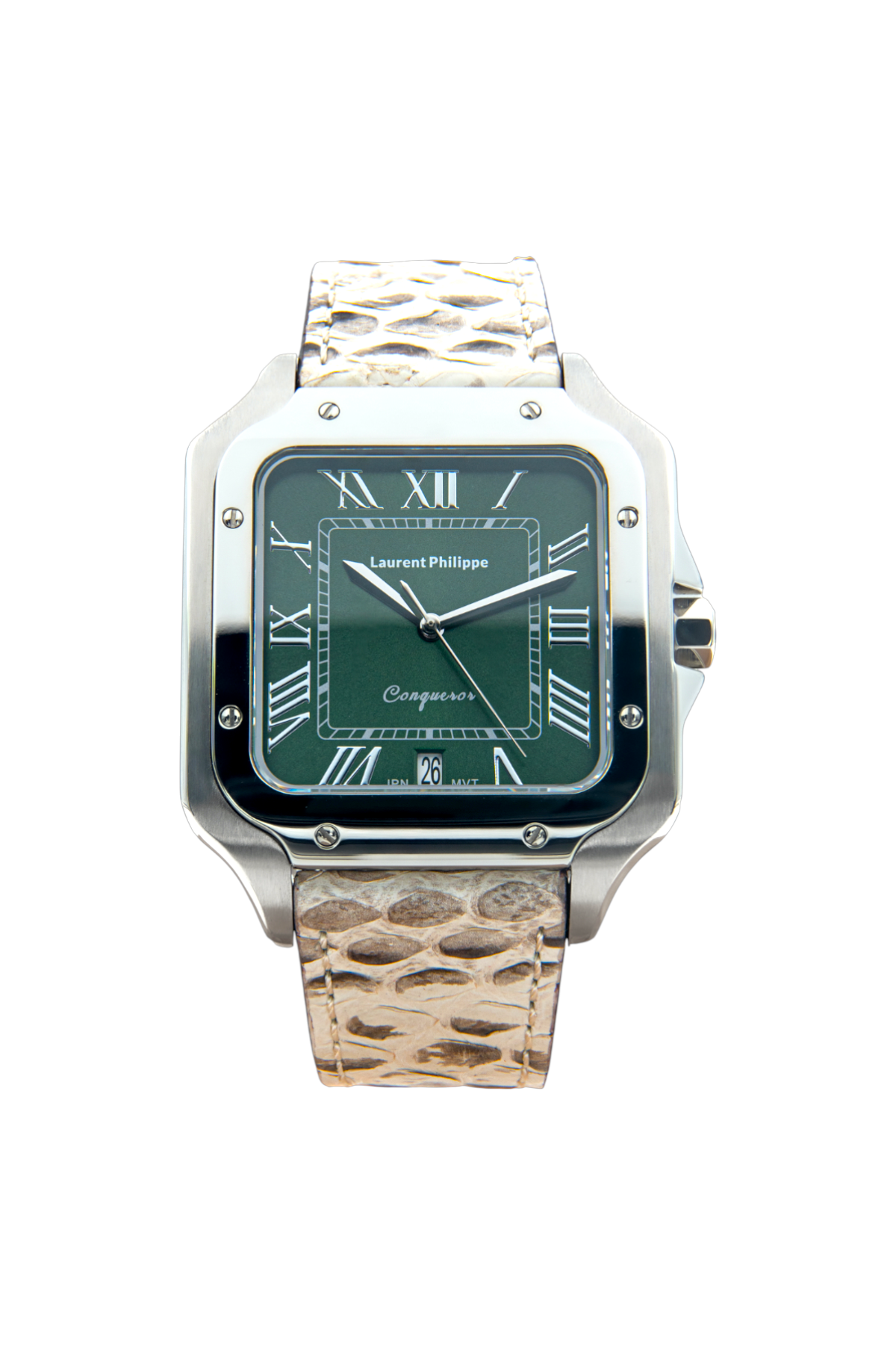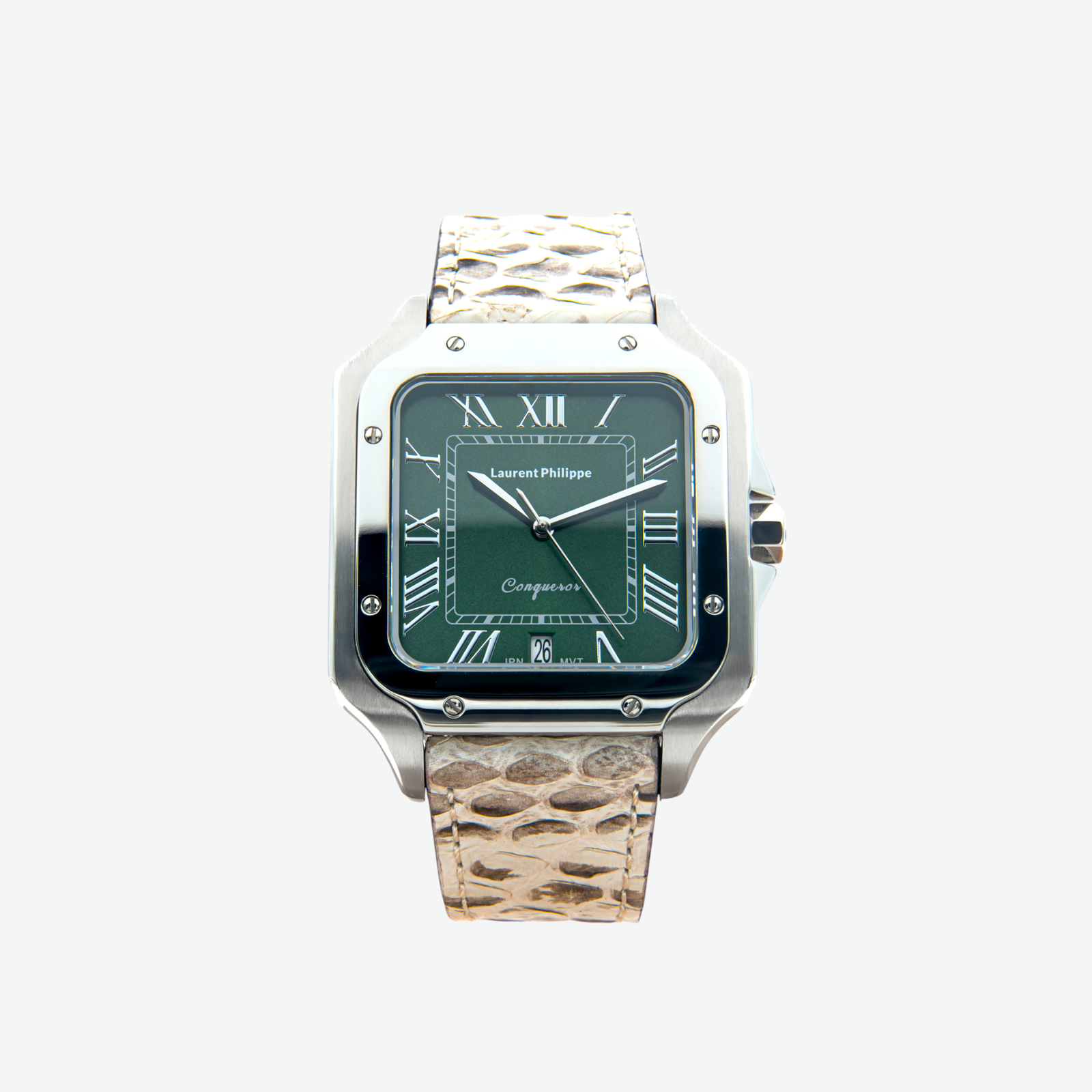 Silver-tone watch with emerald green dial and ivory python leather strap — refined, dangerous, and undeniably seductive.