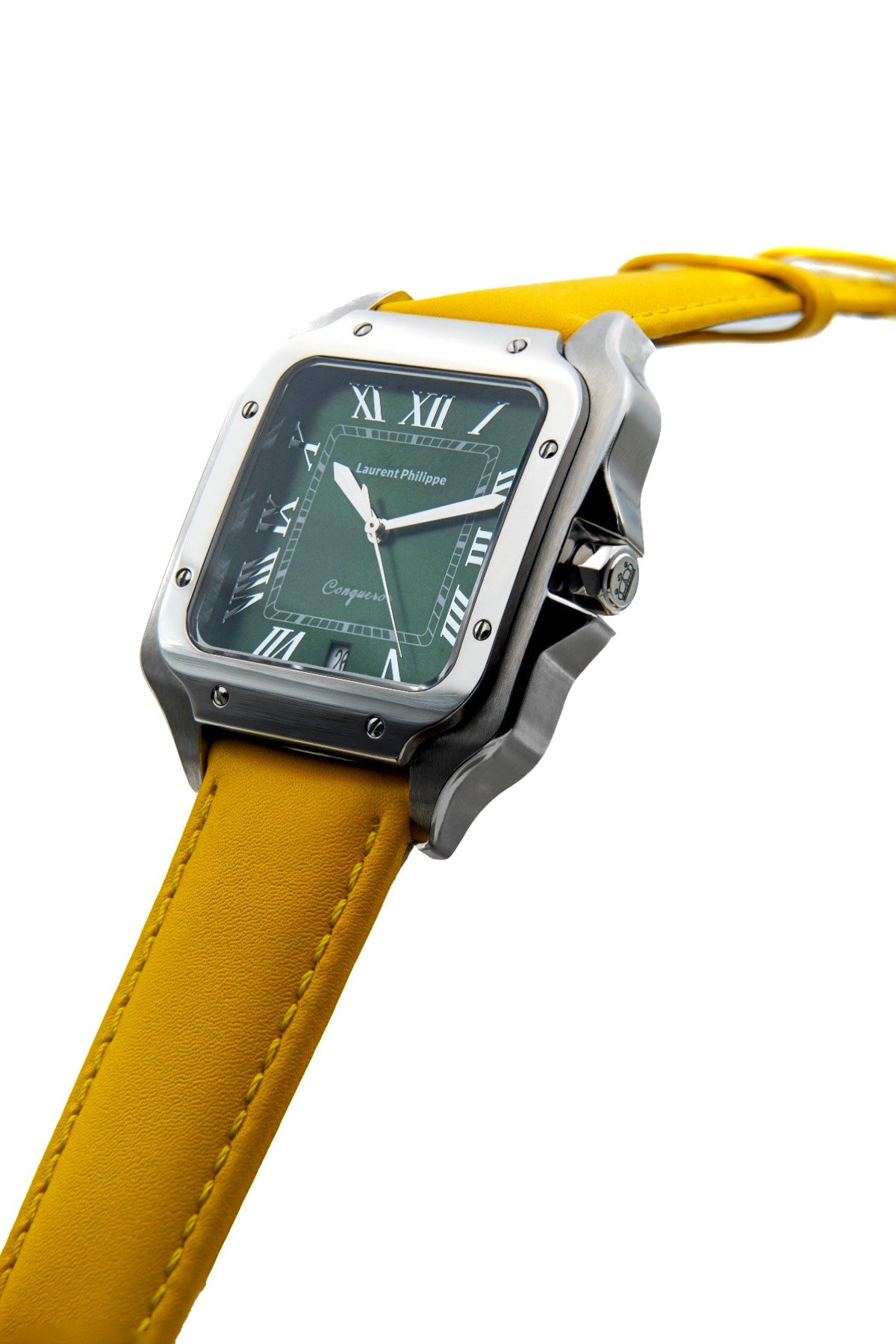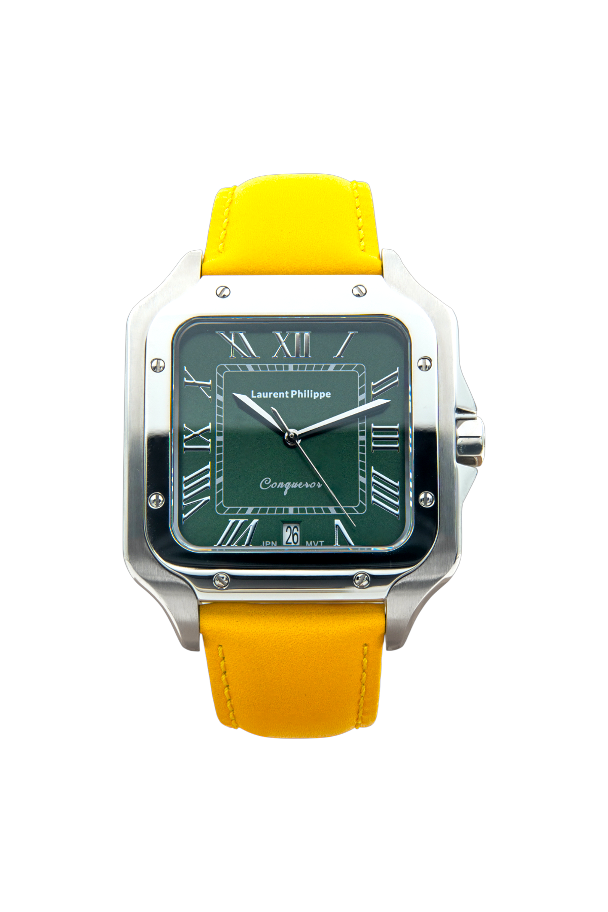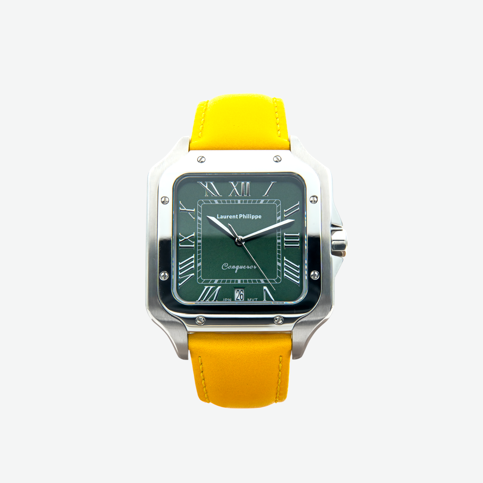 Silver-tone watch with emerald green dial and bright yellow cow leather strap — electric, sharp, and impossible to ignore.