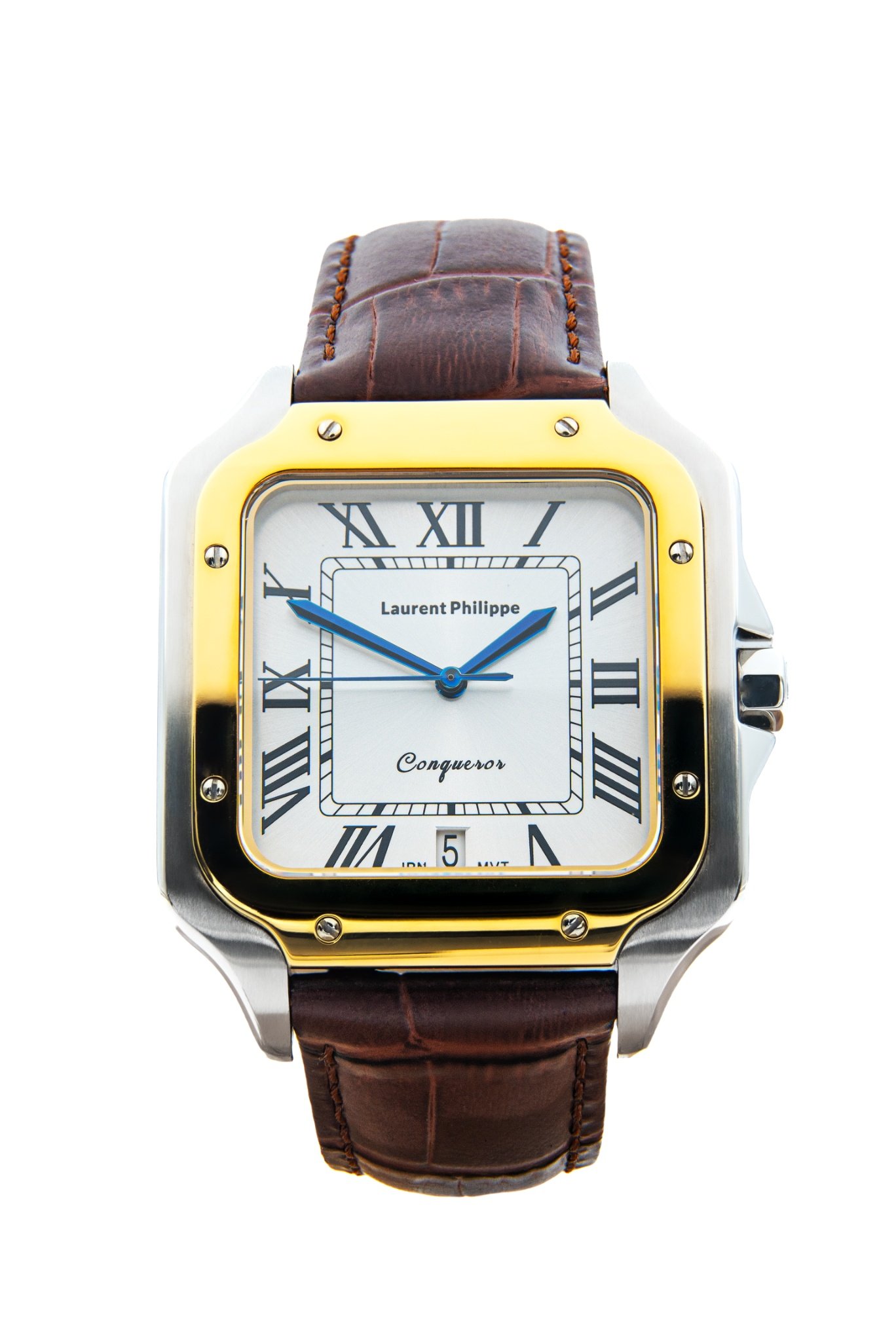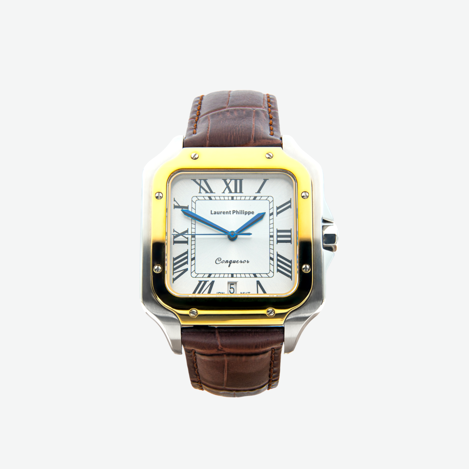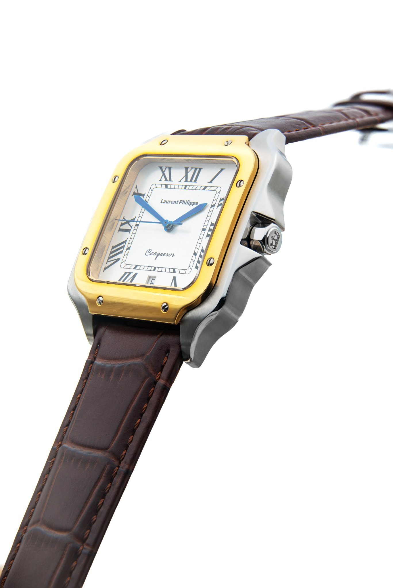 Two-tone watch with white dial and dark brown cow leather strap — classic opulence, redefined with bold finesse.