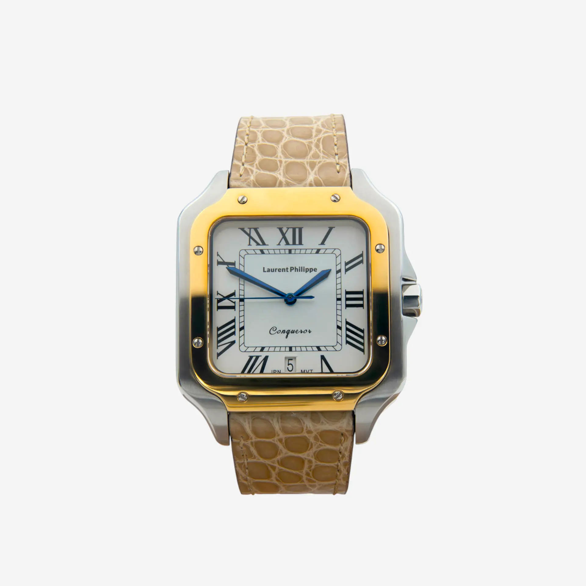 Two-tone luxury watch with white dial and light sand crocodile leather strap — a radiant composition of desert heat and defiant sensuality.