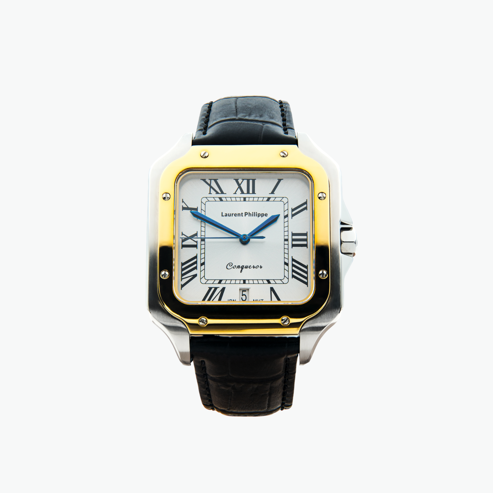 Two-tone watch with white dial and black cow leather strap — magnetic, lucid, and charged with black energy.