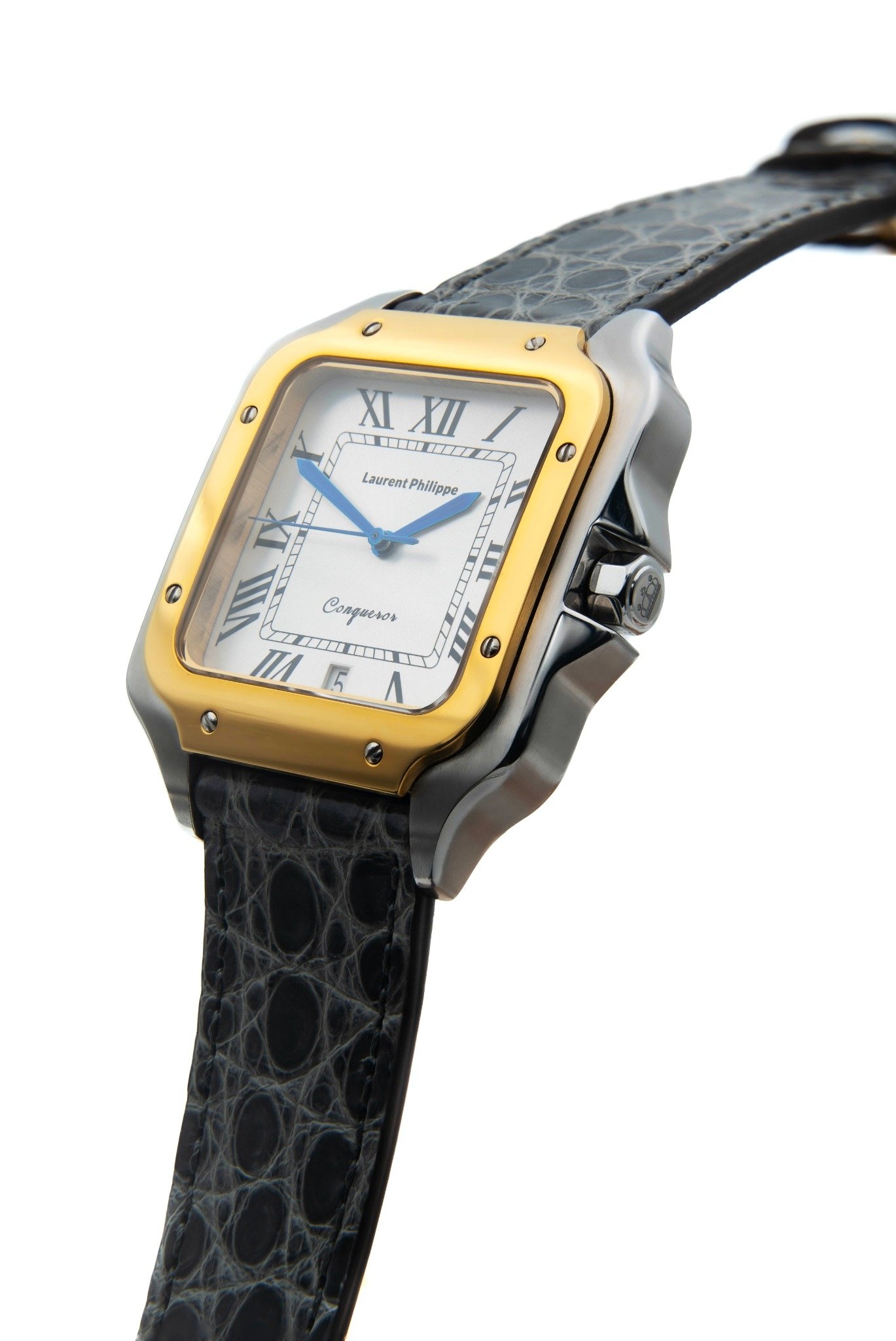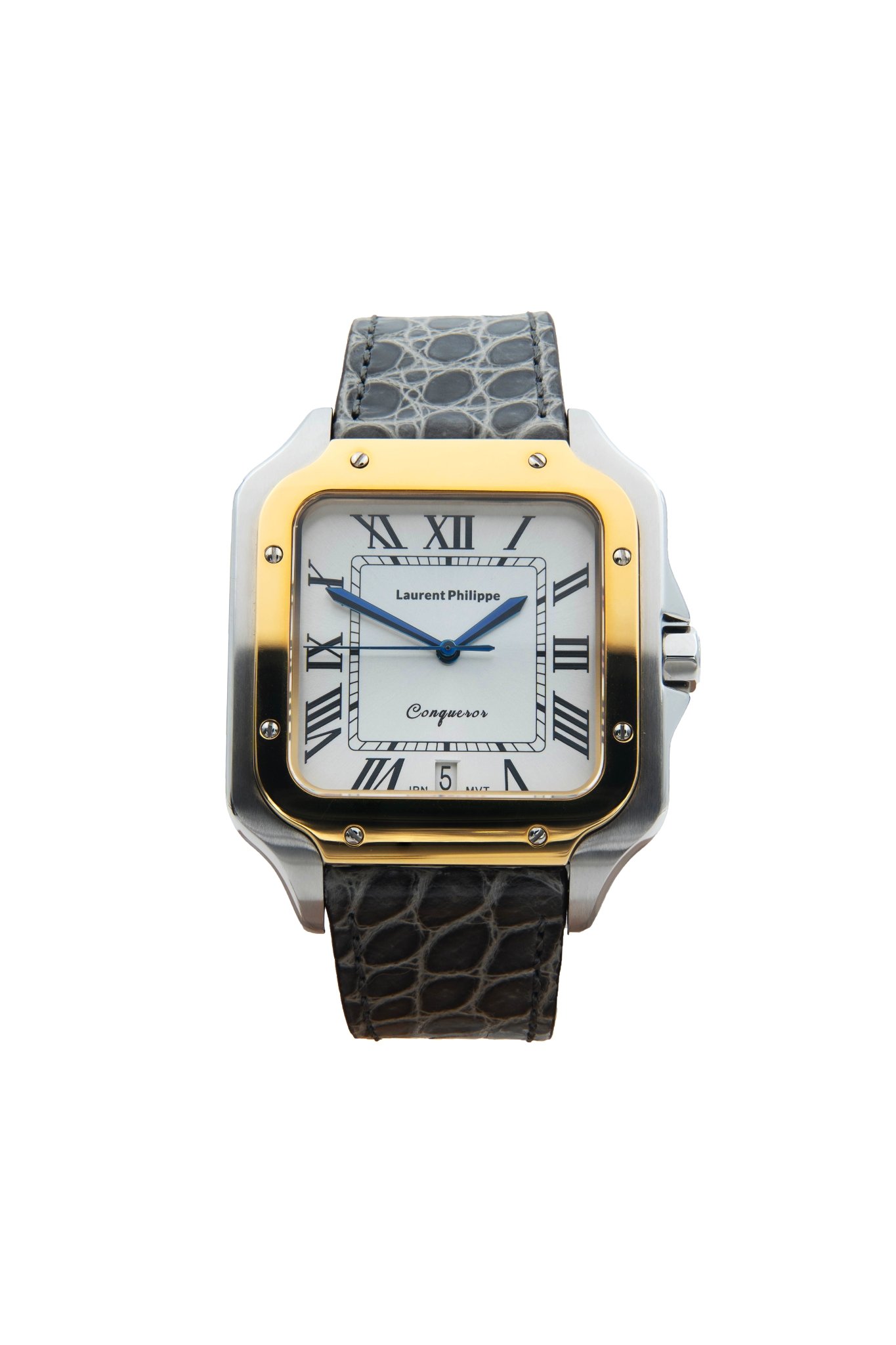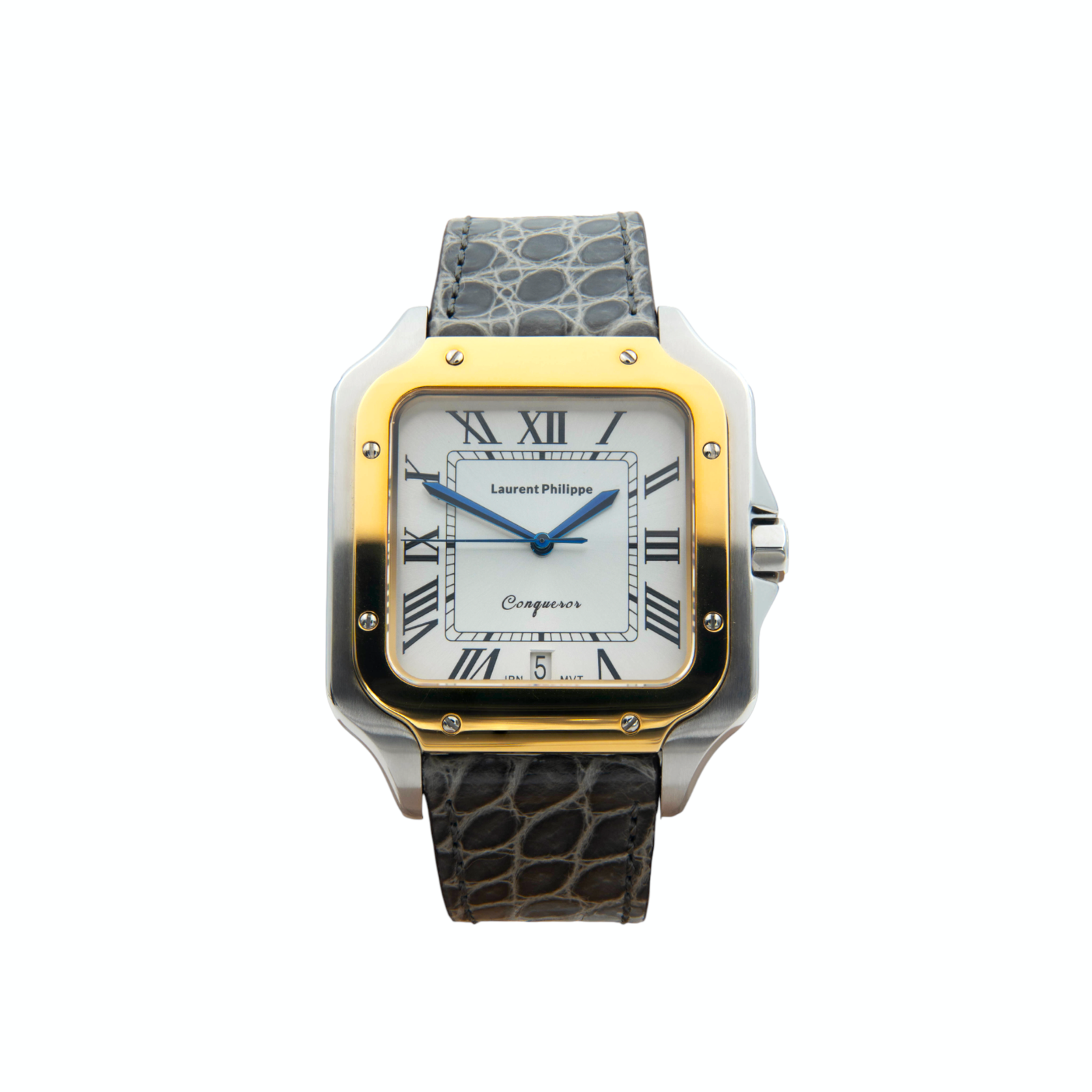 Two-tone luxury watch with white dial and textured platinum grey crocodile leather strap — a balance of gold warmth and reptilian restraint.