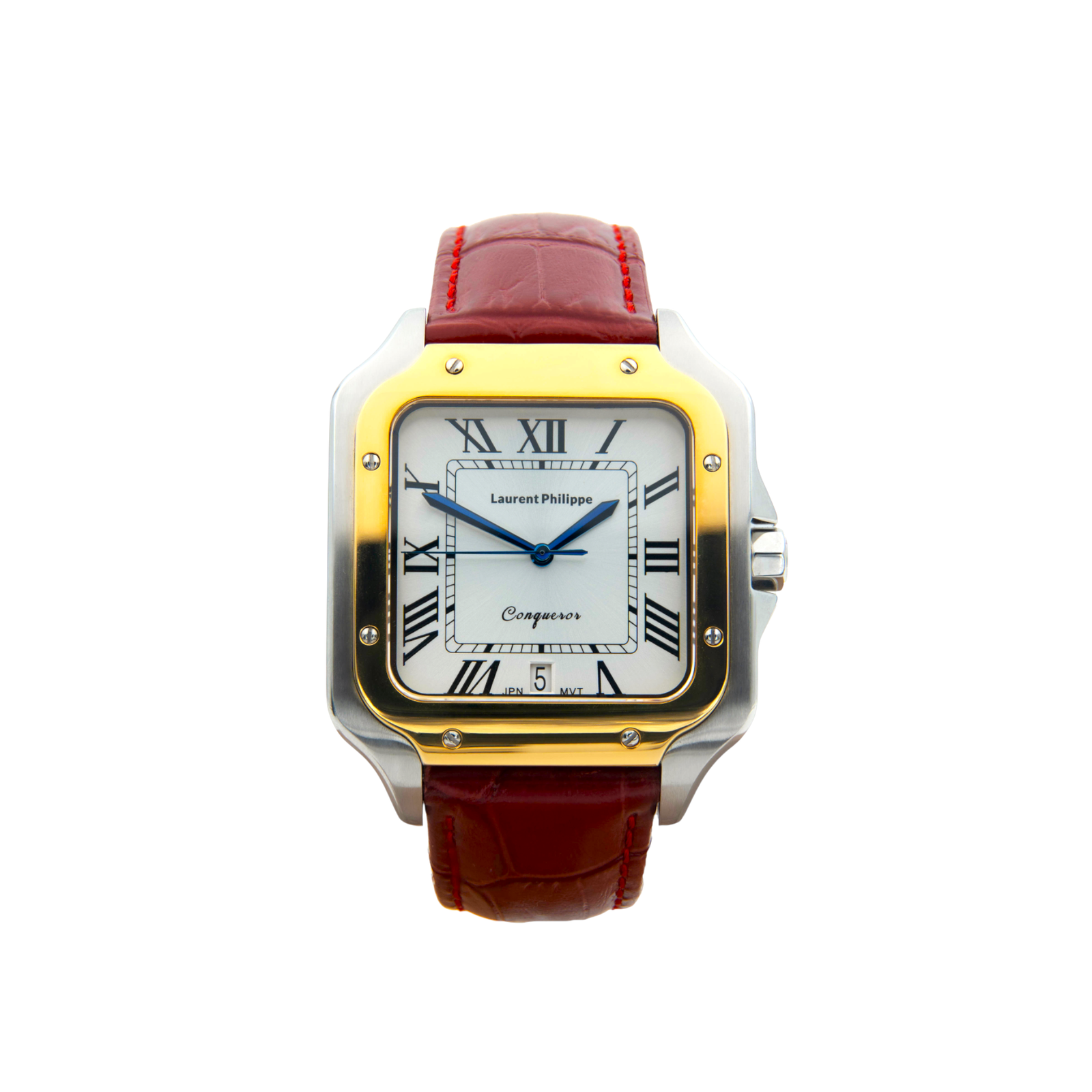 Two-tone luxury watch with white dial and bold red cow leather strap — a composition of gold serenity and raw, carnal provocation.