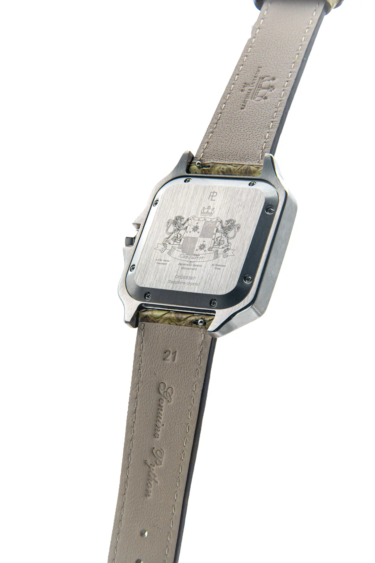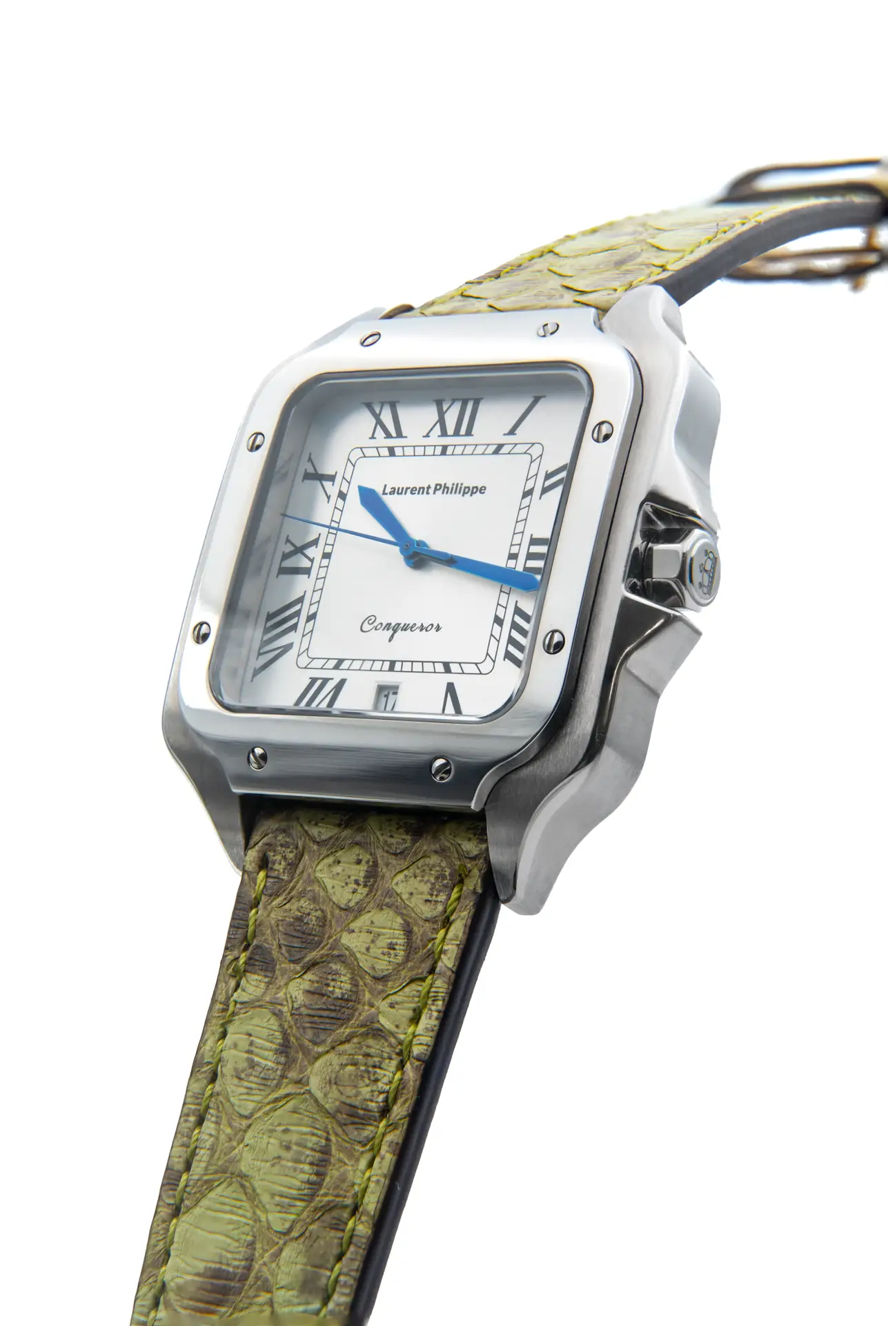 An audacious fusion of classic luxury and primal tension. This model contrasts the refined geometry of the white dial and polished steel case with the raw, almost electric energy of the Toxic Lizard strap — handcrafted from genuine python leather, tinted in a venomous chartreuse tone. The scaly texture, aggressive pattern, and acid glow awaken something untamed. Not for the careful — but for the dangerous.