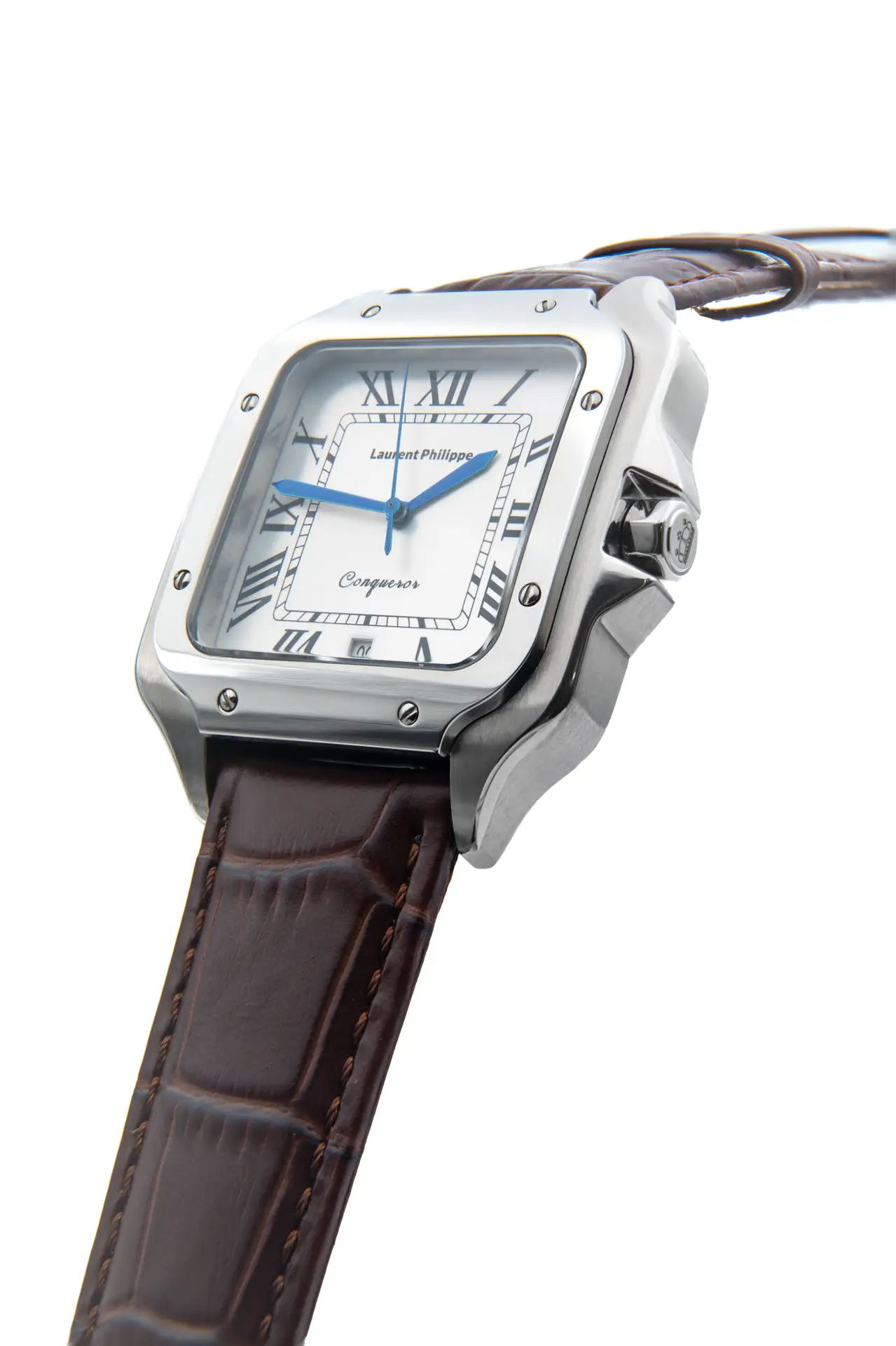 Luxury watch with white dial, stainless steel case, and handcrafted brown cow leather strap — a classic blend of heritage, texture, and noble understatement.