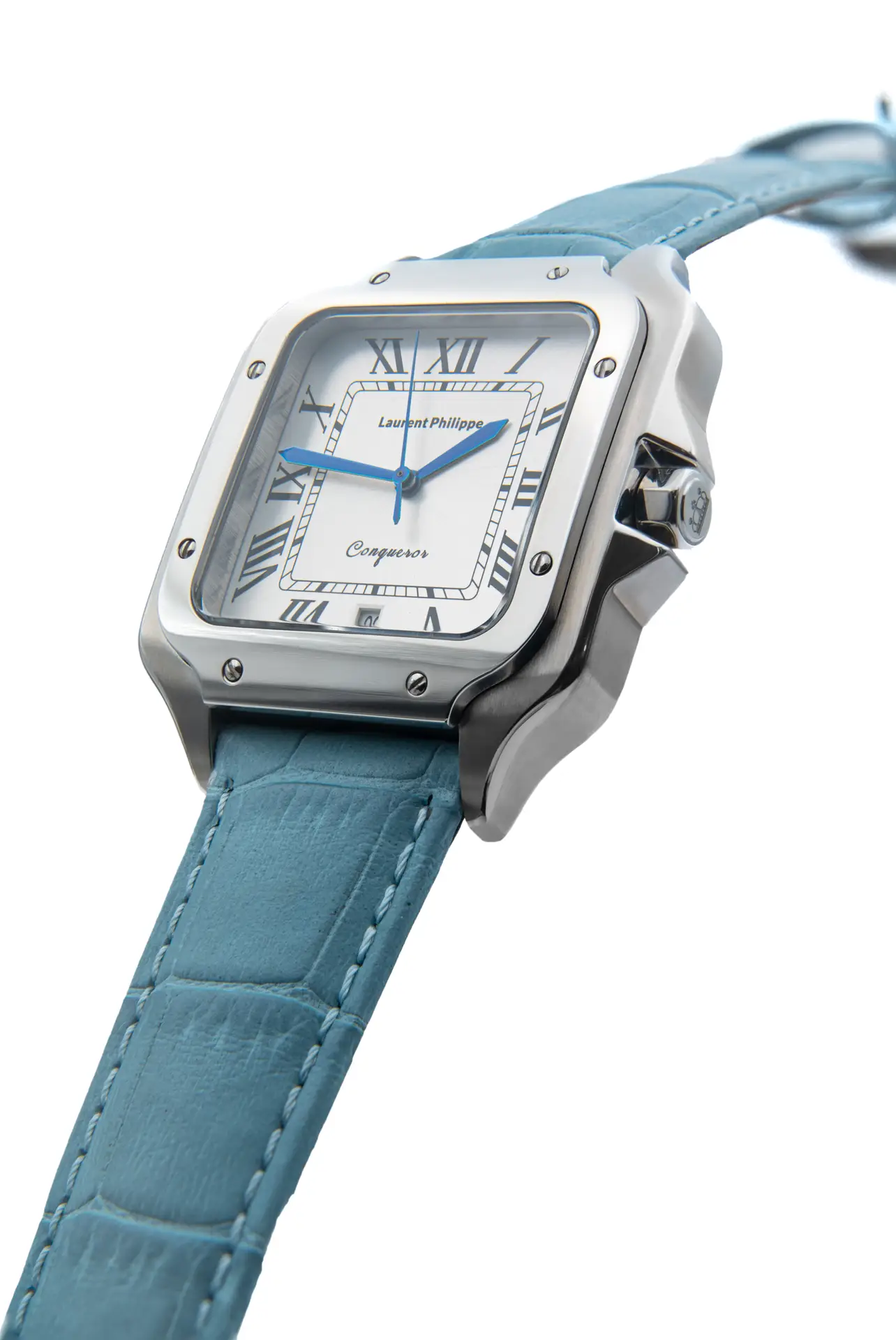 Luxury watch with a white dial, stainless steel case, and light blue cowhide leather strap — a crisp fusion of icy elegance and floral poise.