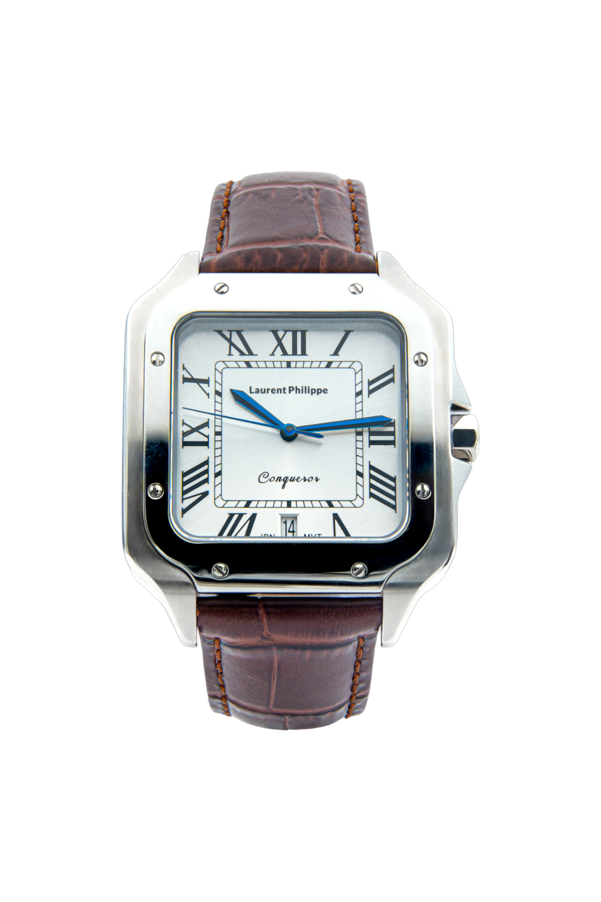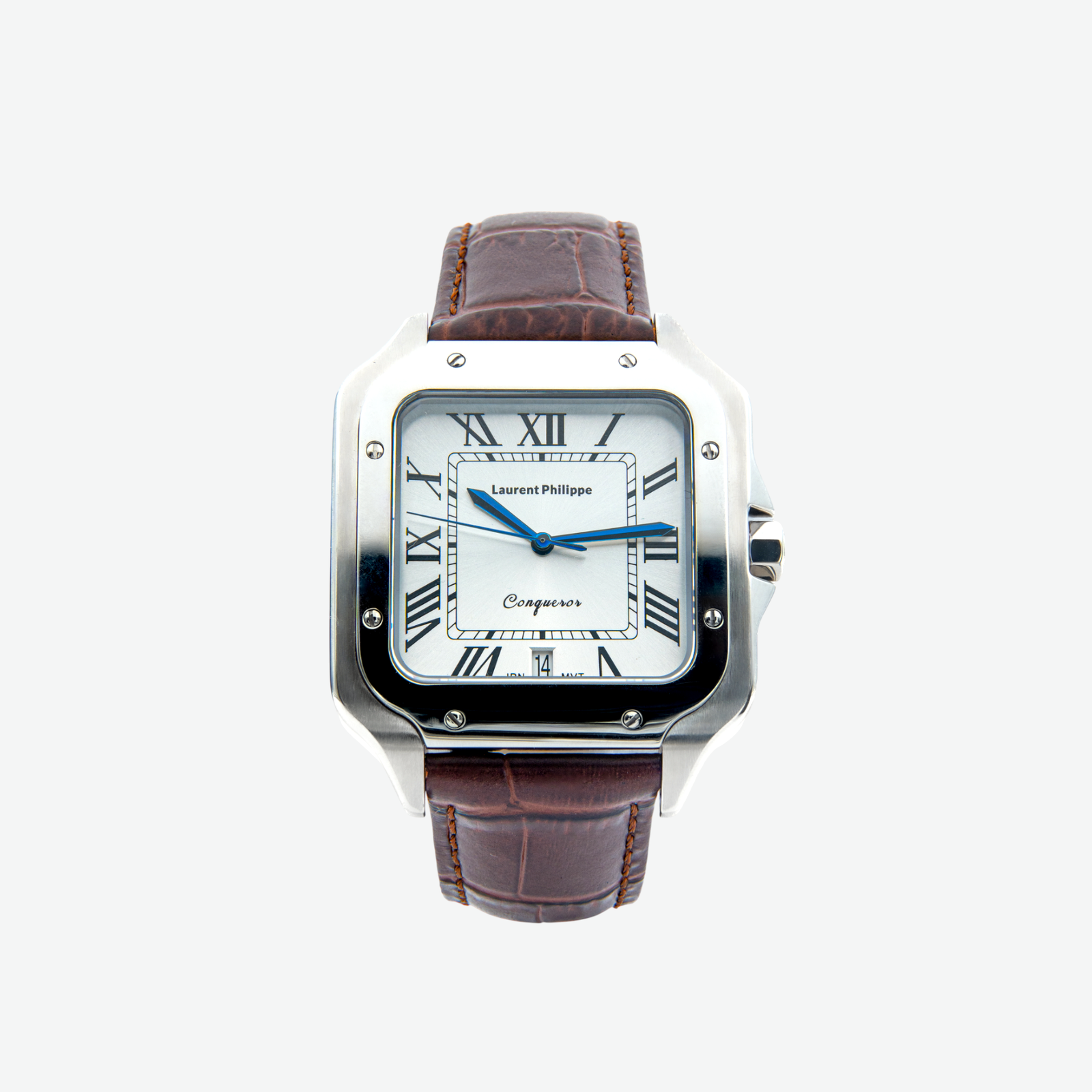 Luxury watch with white dial, stainless steel case, and handcrafted brown cow leather strap — a classic blend of heritage, texture, and noble understatement.
