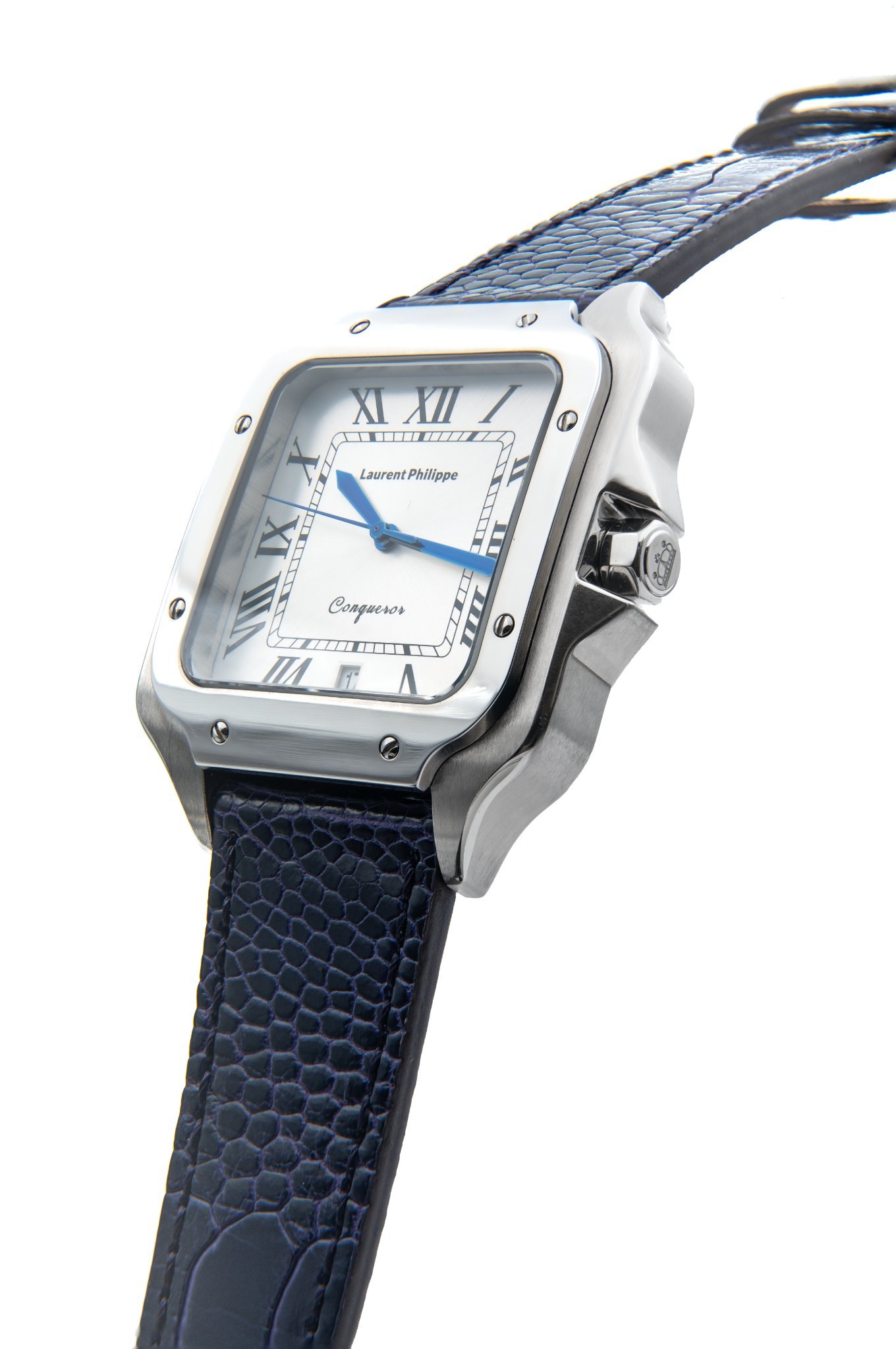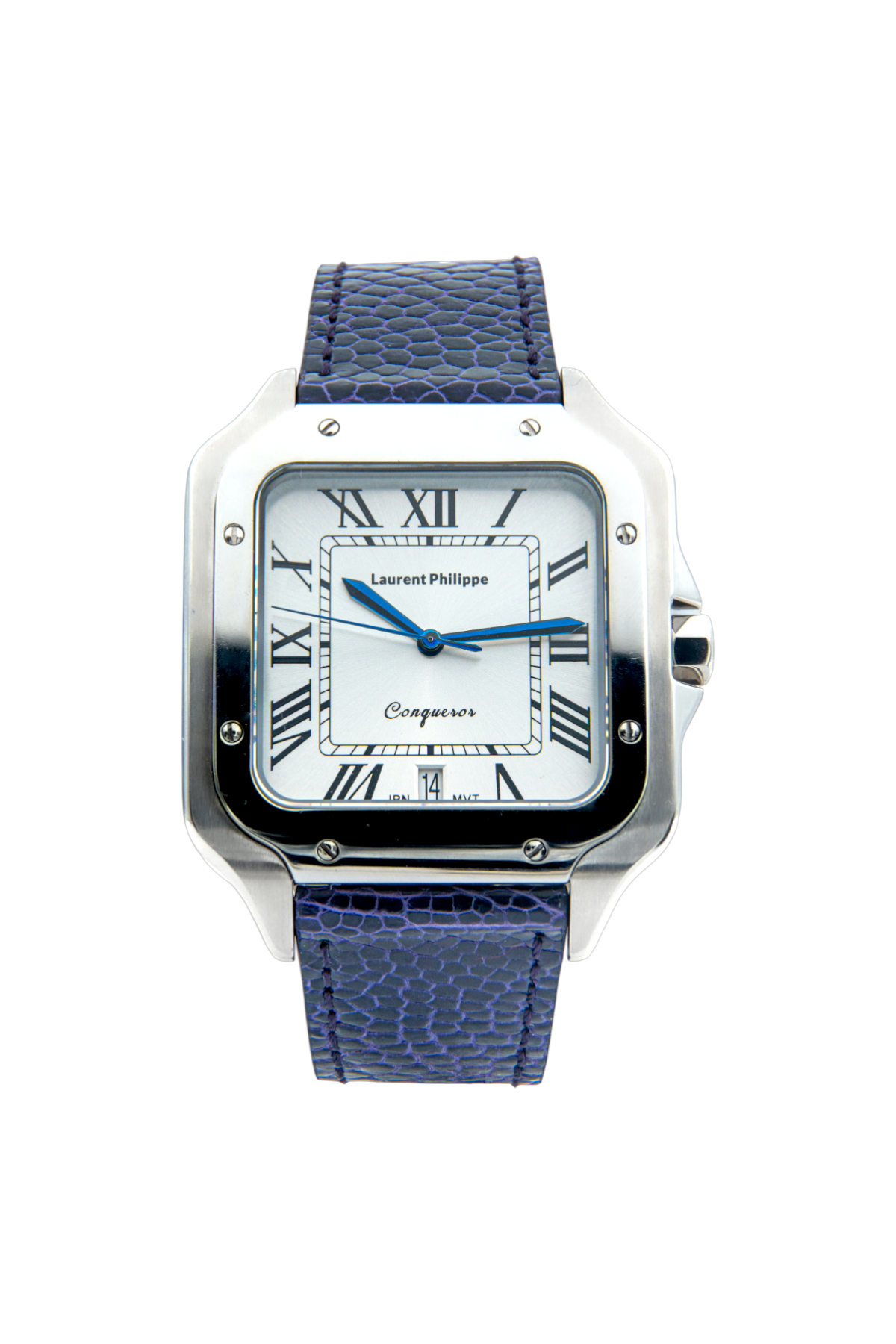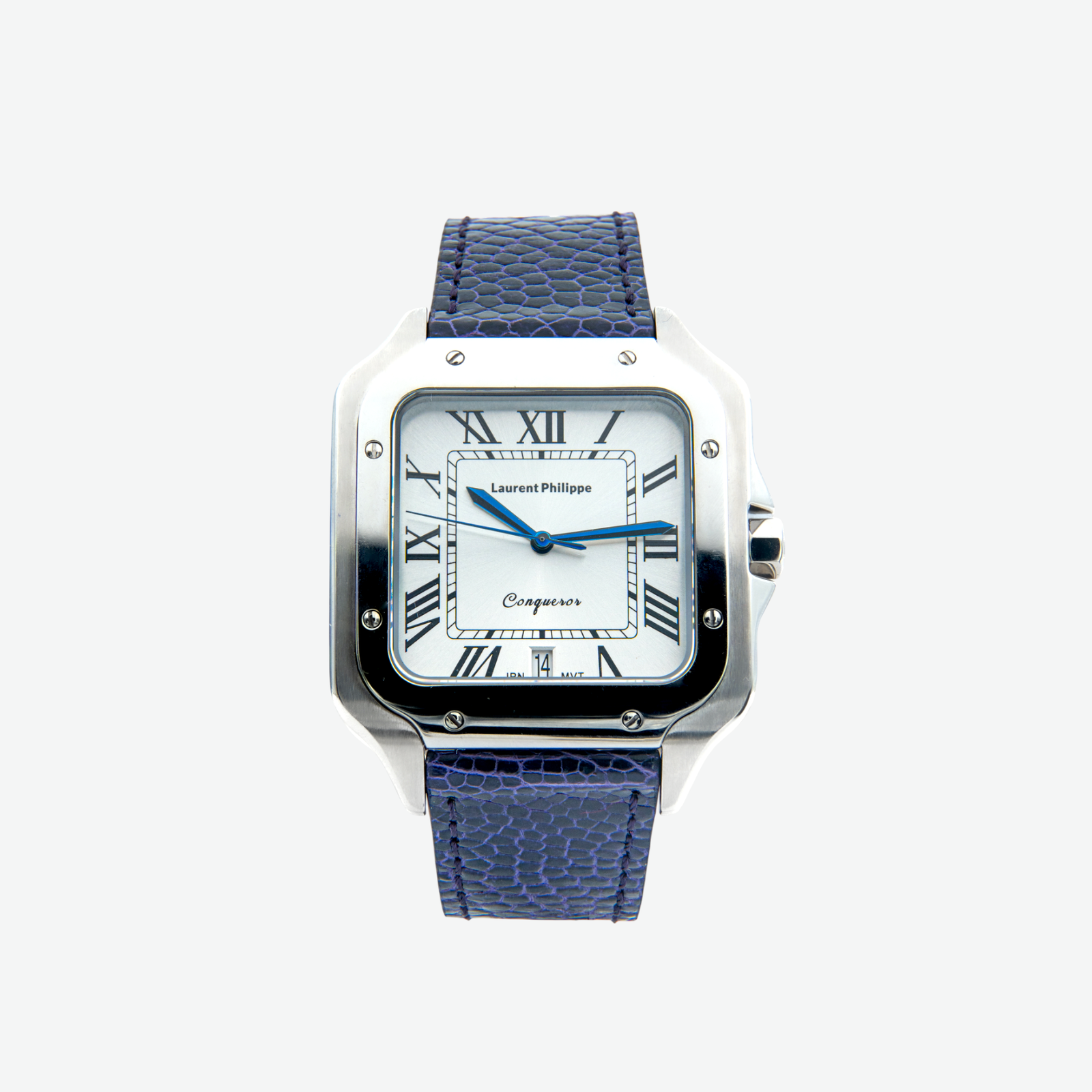 Luxury steel watch with white dial and indigo ostrich leather strap — a blend of regal restraint and hypnotic texture.