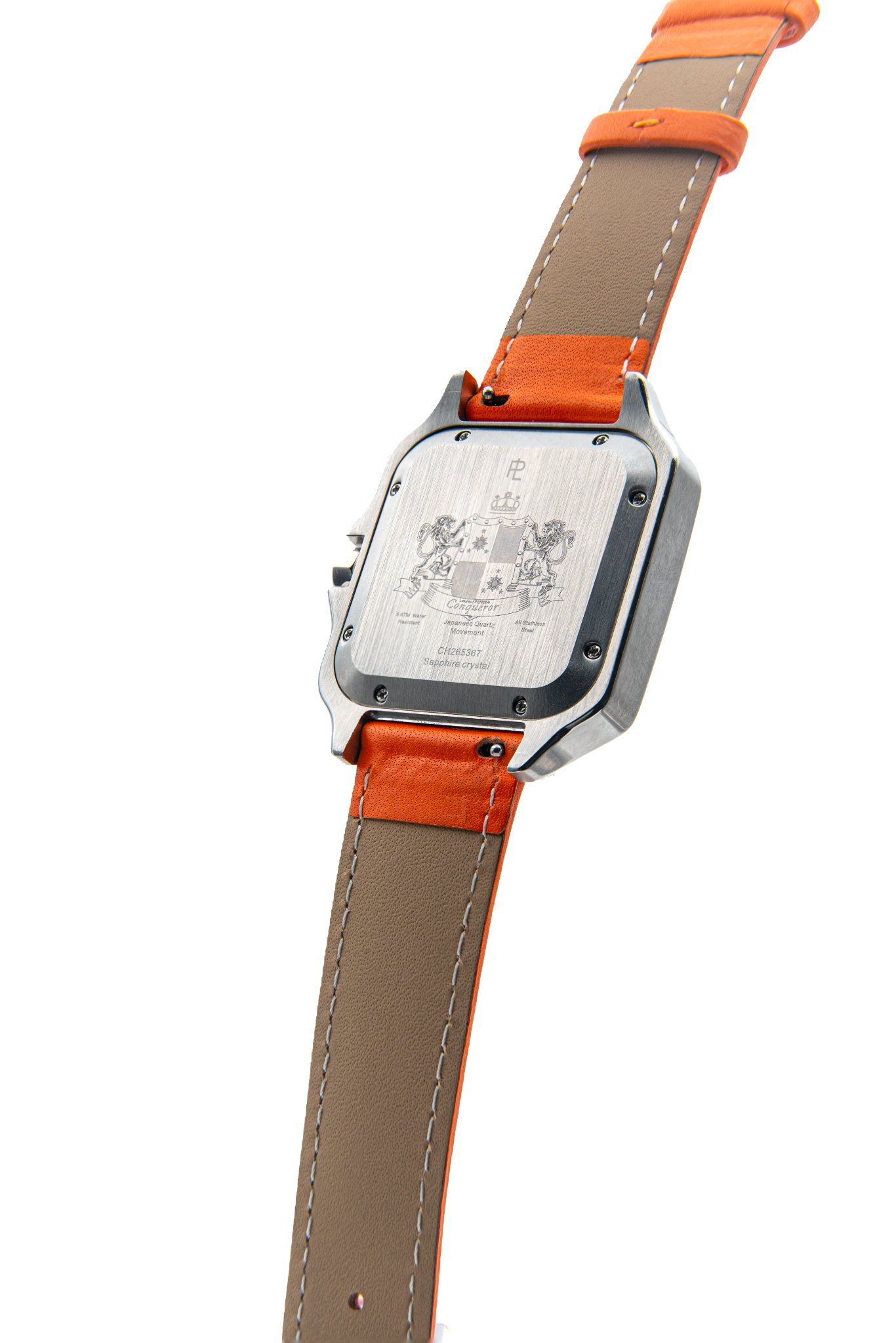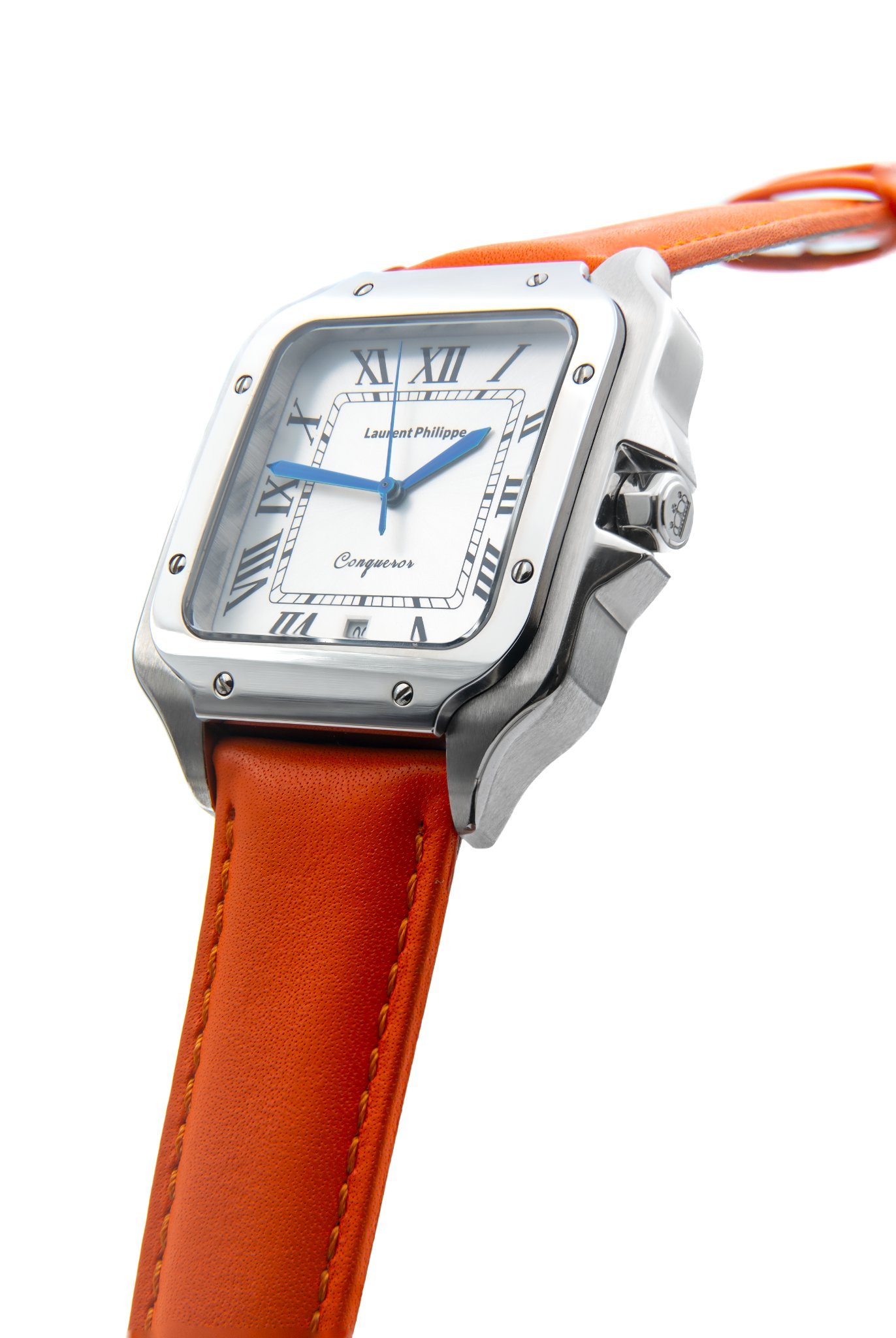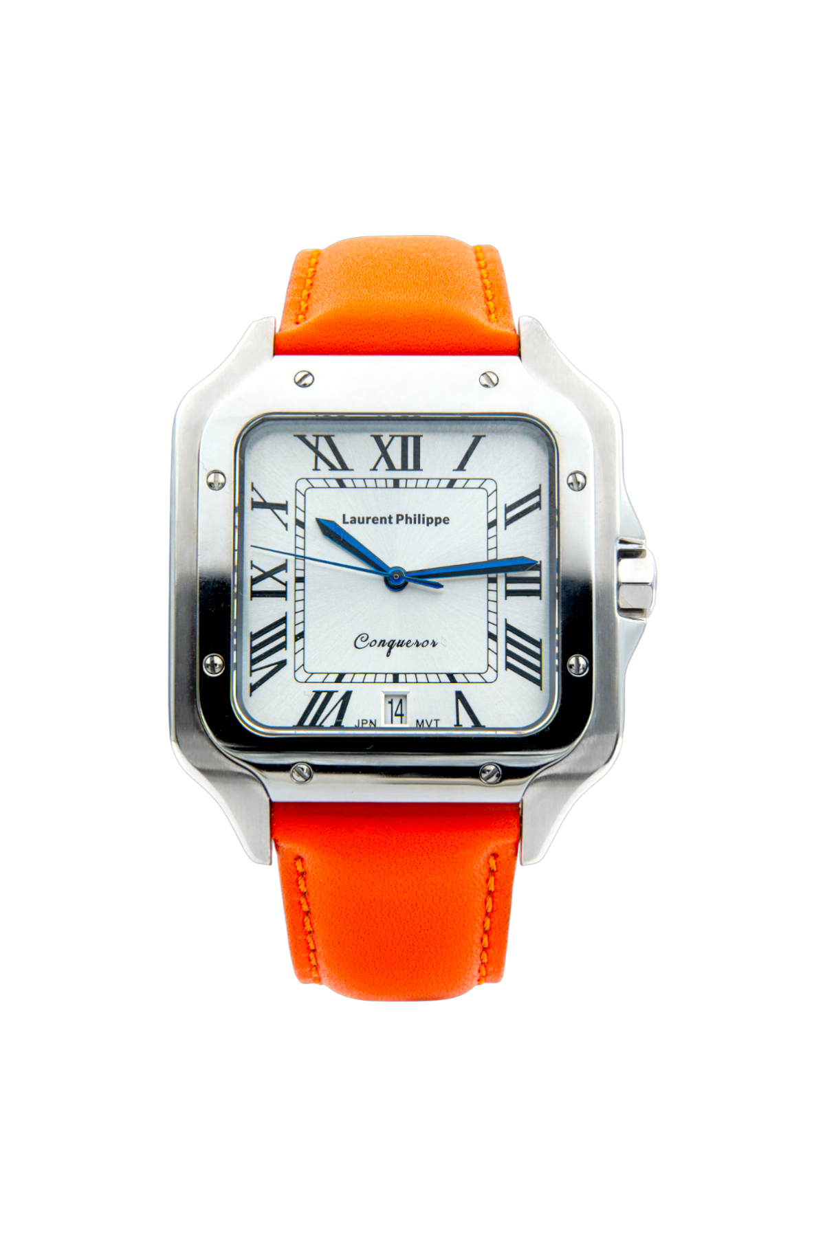 Luxury watch with white dial, stainless steel case, and handcrafted orange cow leather strap — a vibrant collision of clarity and raw energy.