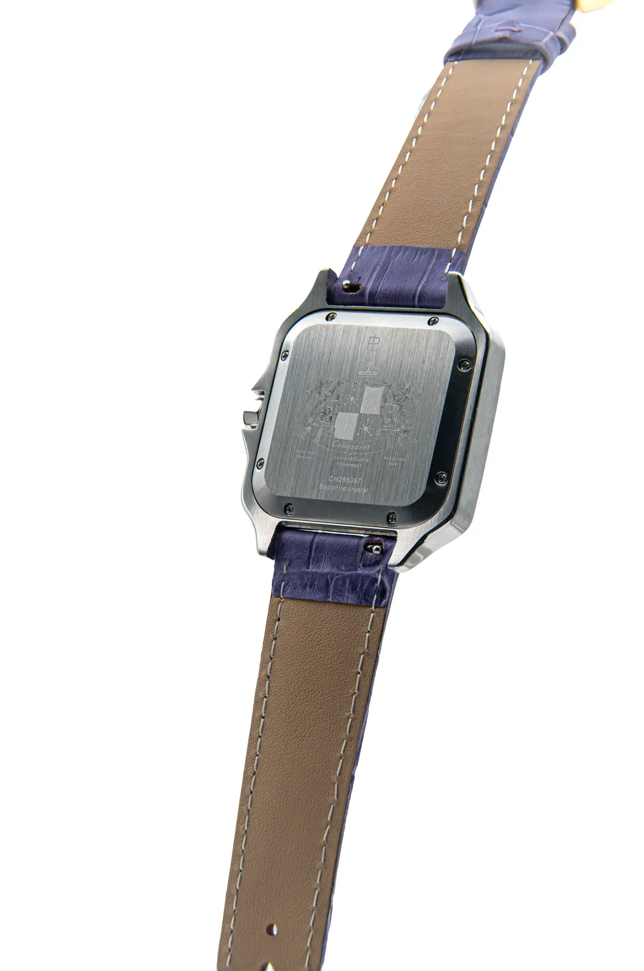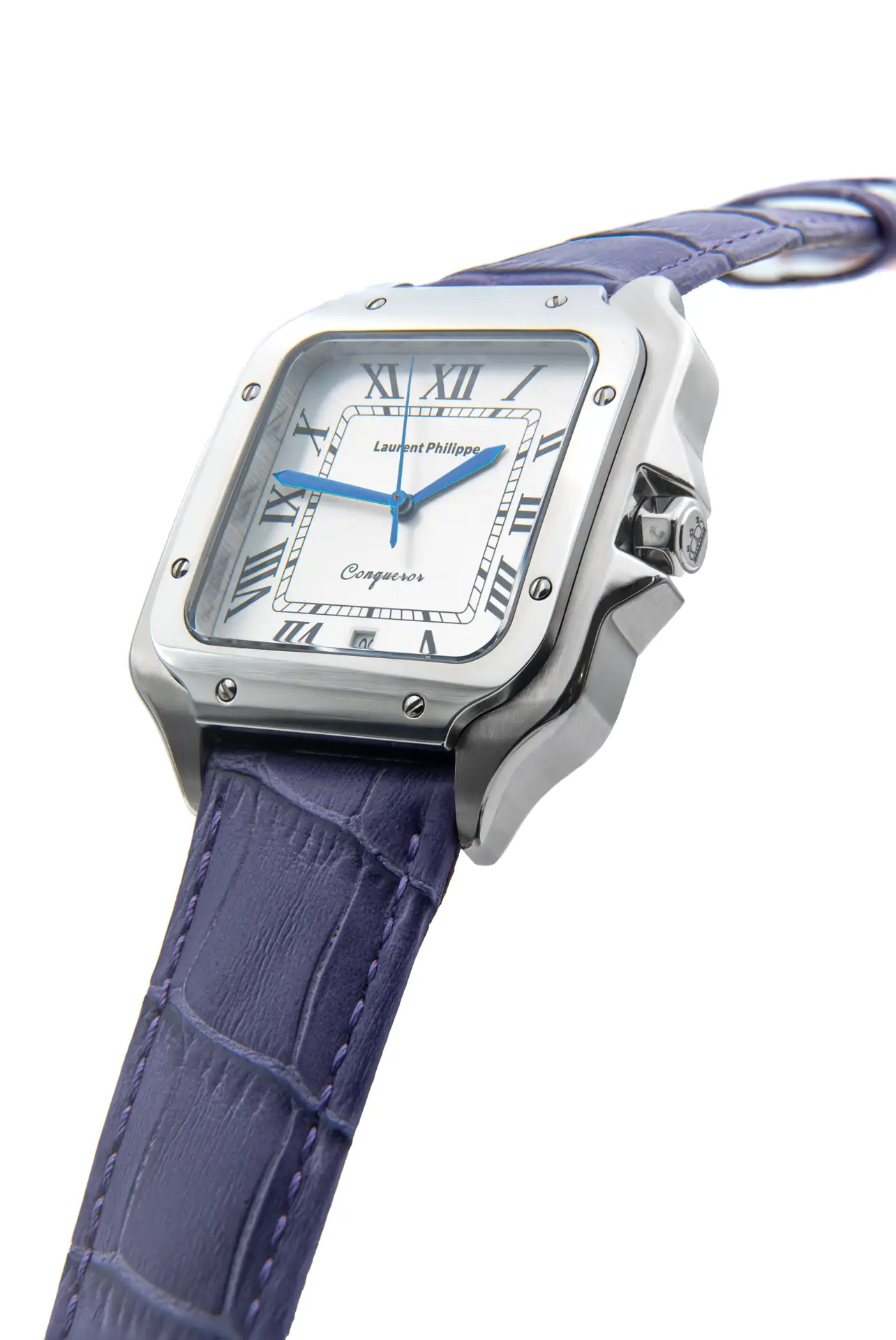 Luxury watch with white dial, stainless steel case, and handcrafted violet leather strap — a striking harmony of mystery, refinement, and quiet power.