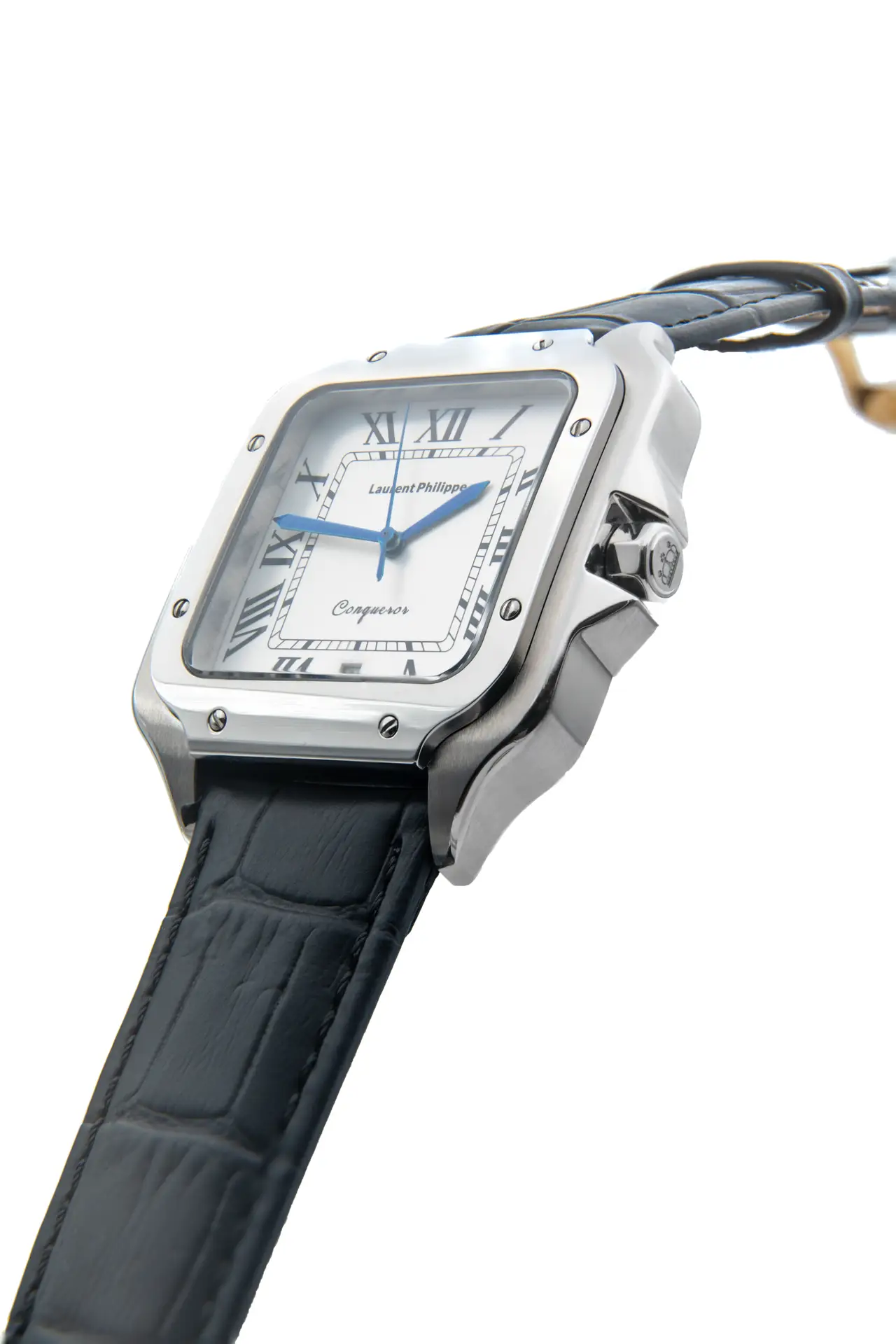 Luxury watch with white dial, stainless steel case, and handcrafted black cow leather strap — a clean expression of silent power and timeless precision.