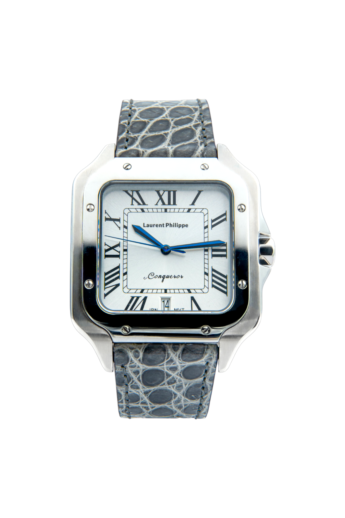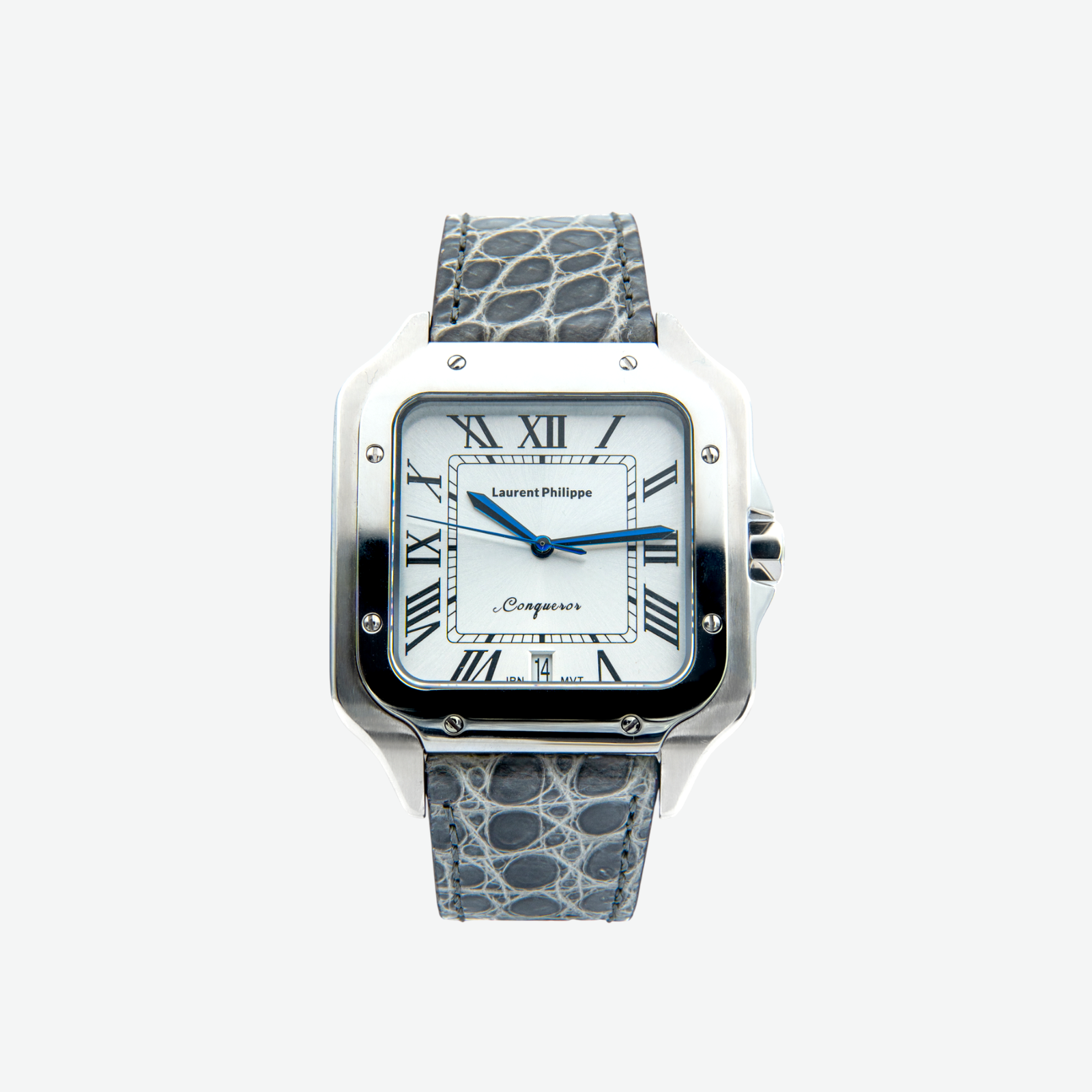 Luxury steel watch with white dial and grey crocodile leather strap — a sleek composition of mineral strength, rare patterning, and elevated presence.