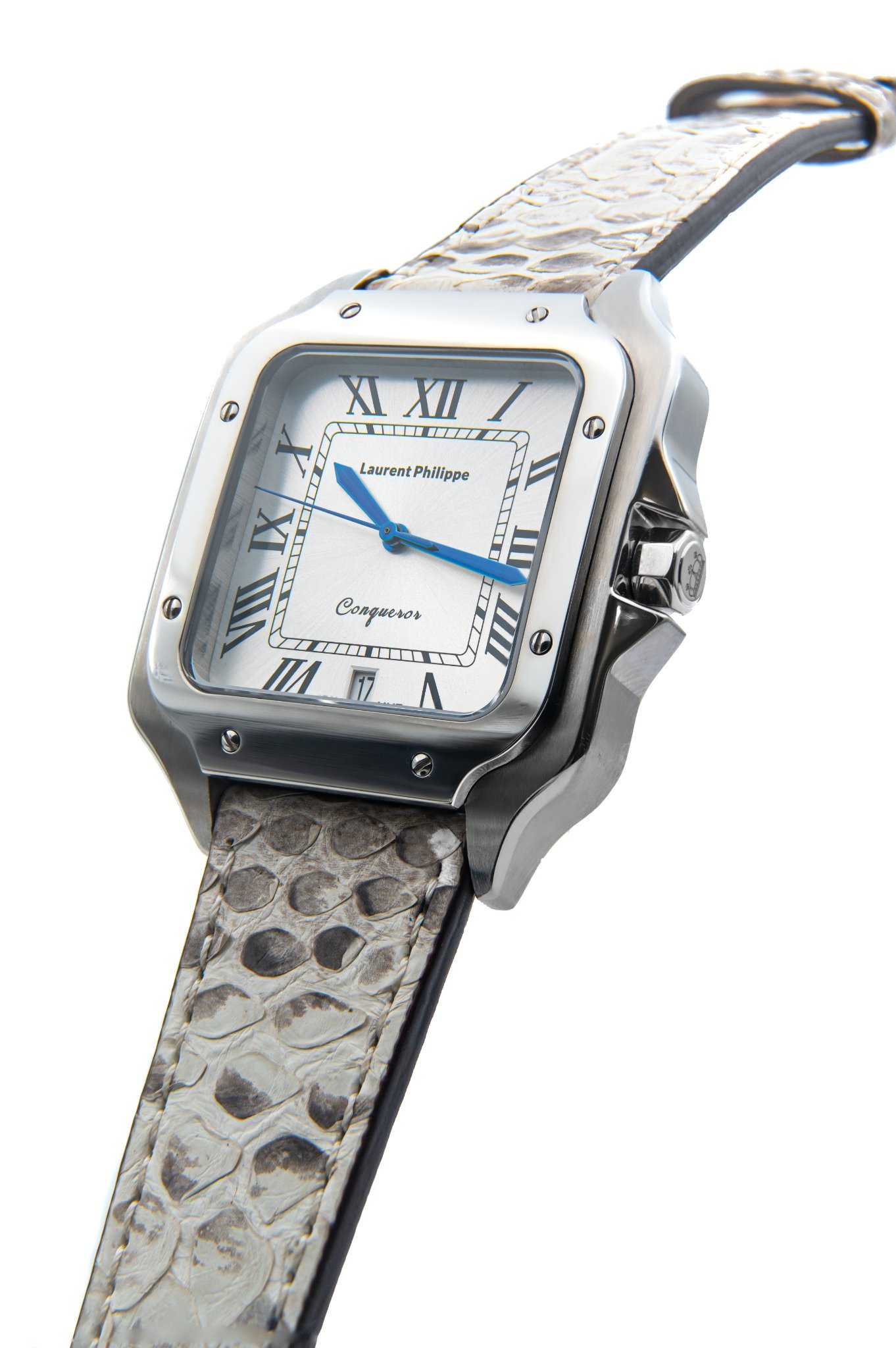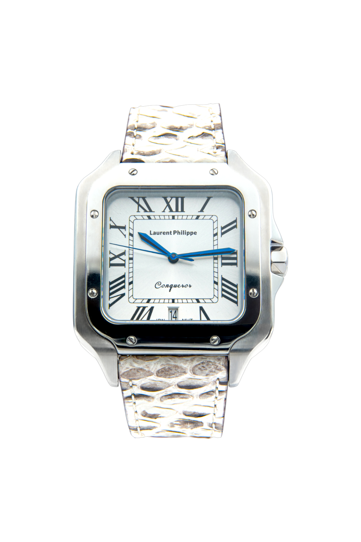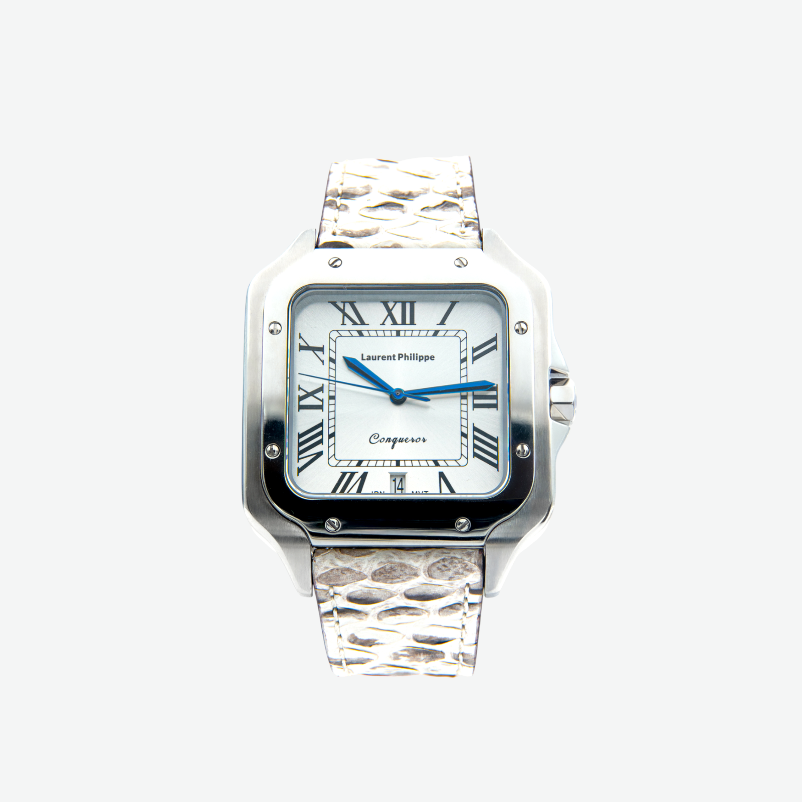 Men €530.00Add to cartLuxury steel watch with white dial and handcrafted cyan-blue python leather strap — a bold contrast of clarity and instinctual power.