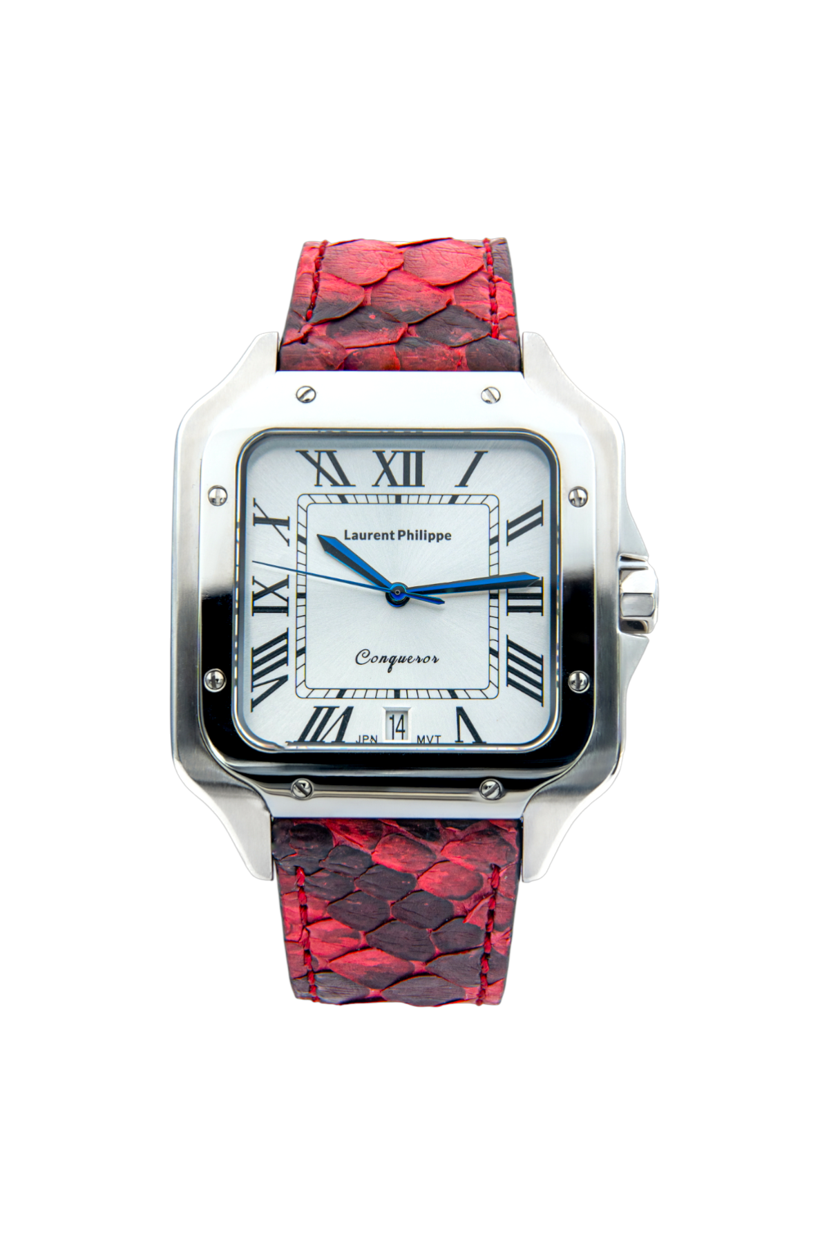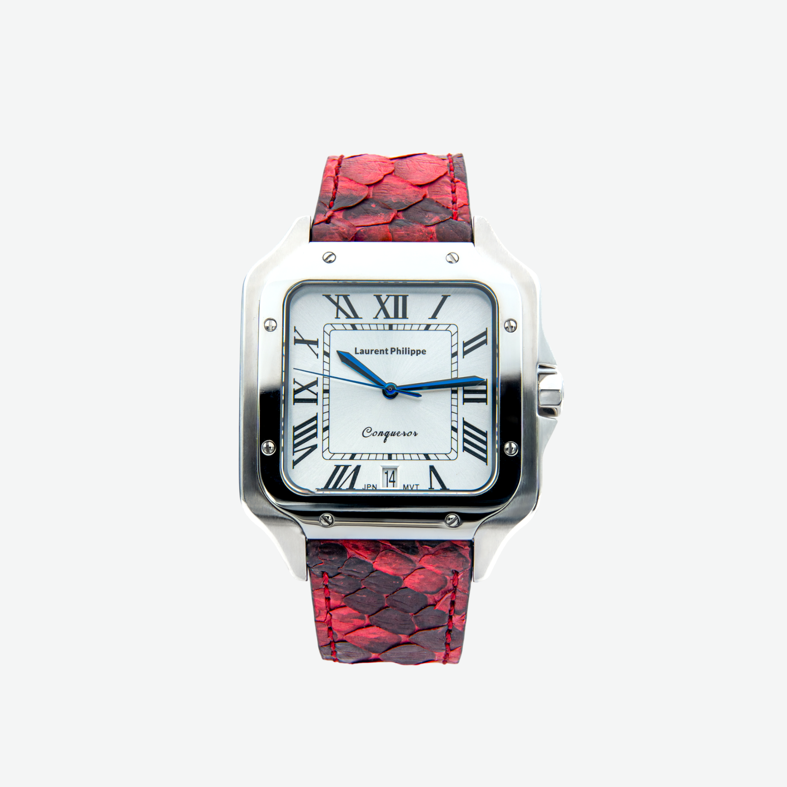 Luxury watch with white dial, stainless steel case, and handcrafted red-black python leather strap — a provocative fusion of precision, danger, and allure.