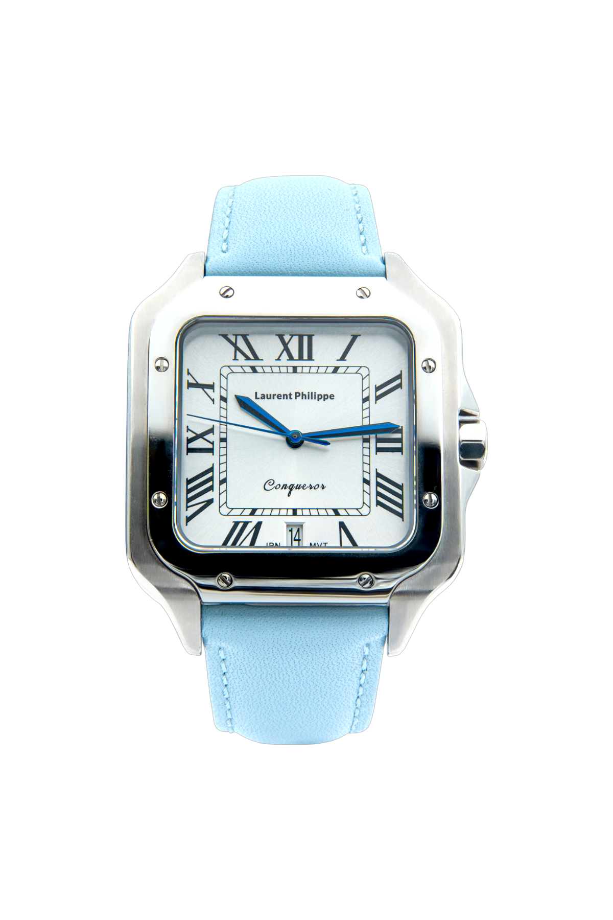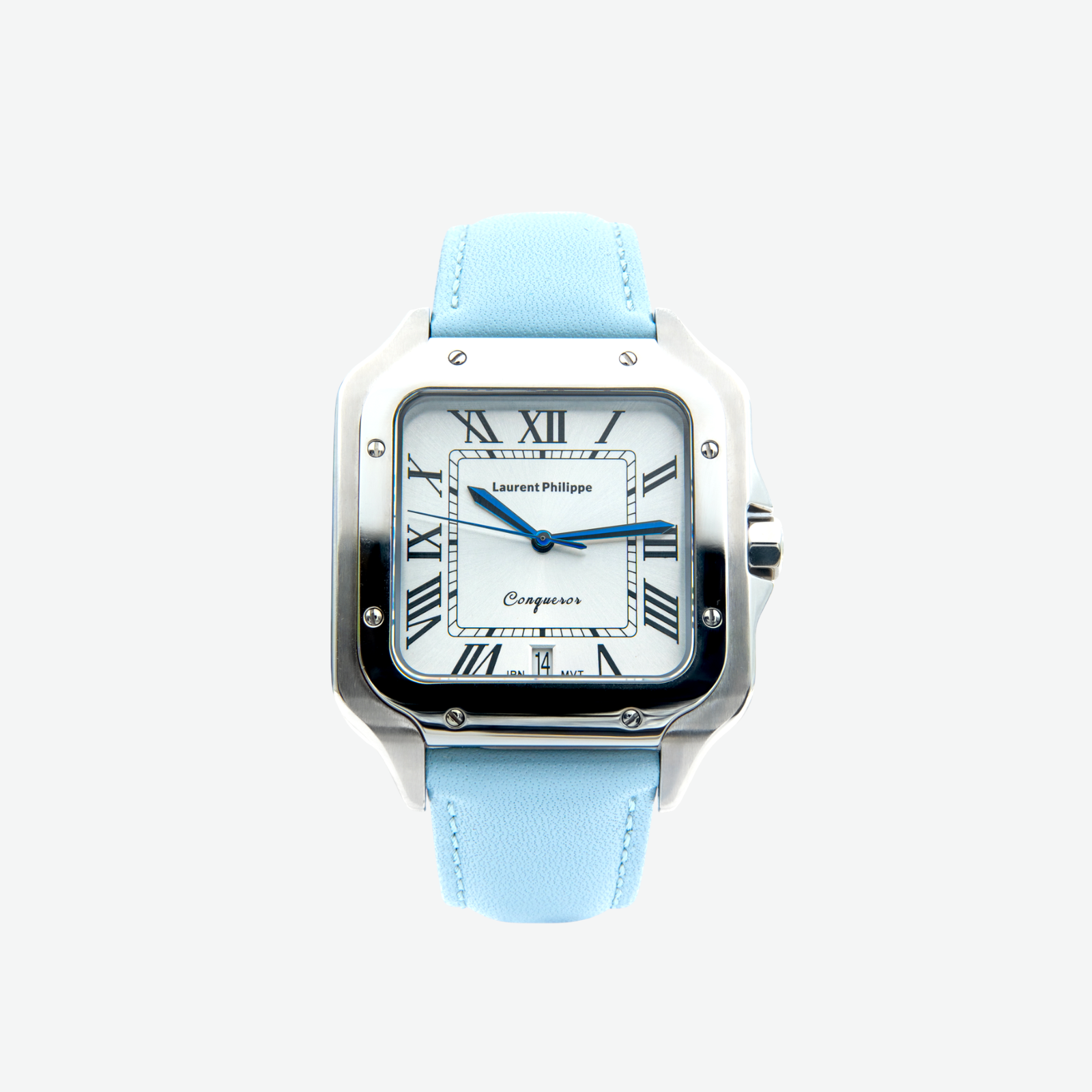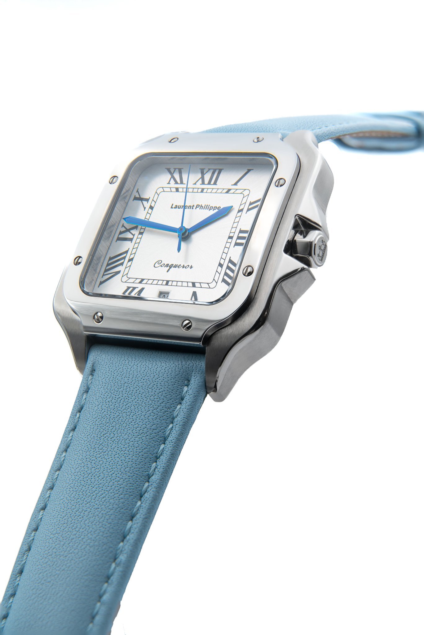 Luxury watch with white dial, stainless steel case, and bold light-blue leather strap — a statement of confidence, freshness, and irresistible style.