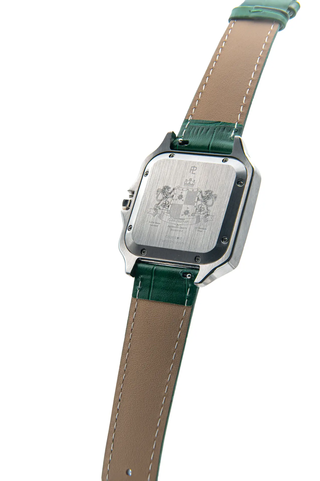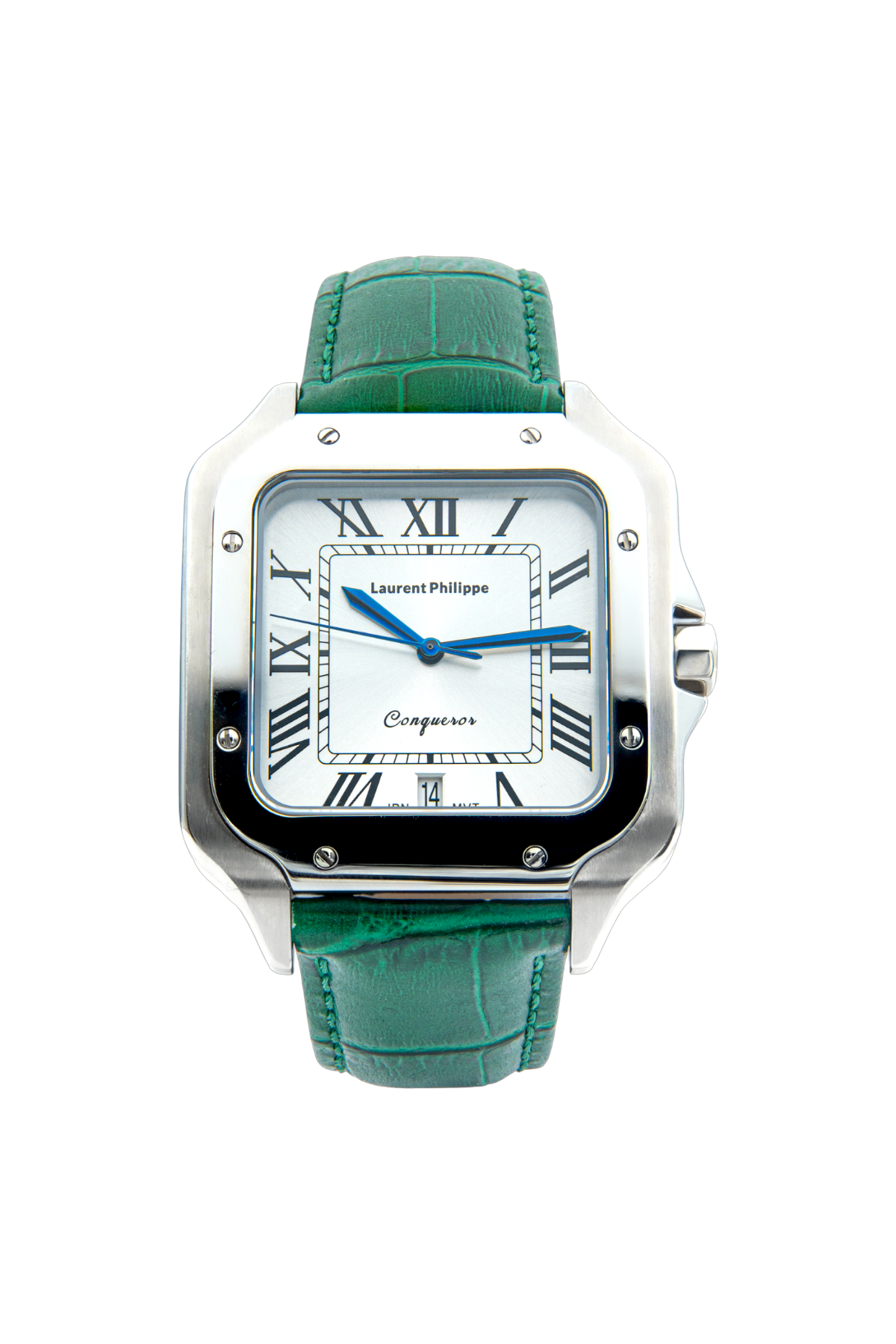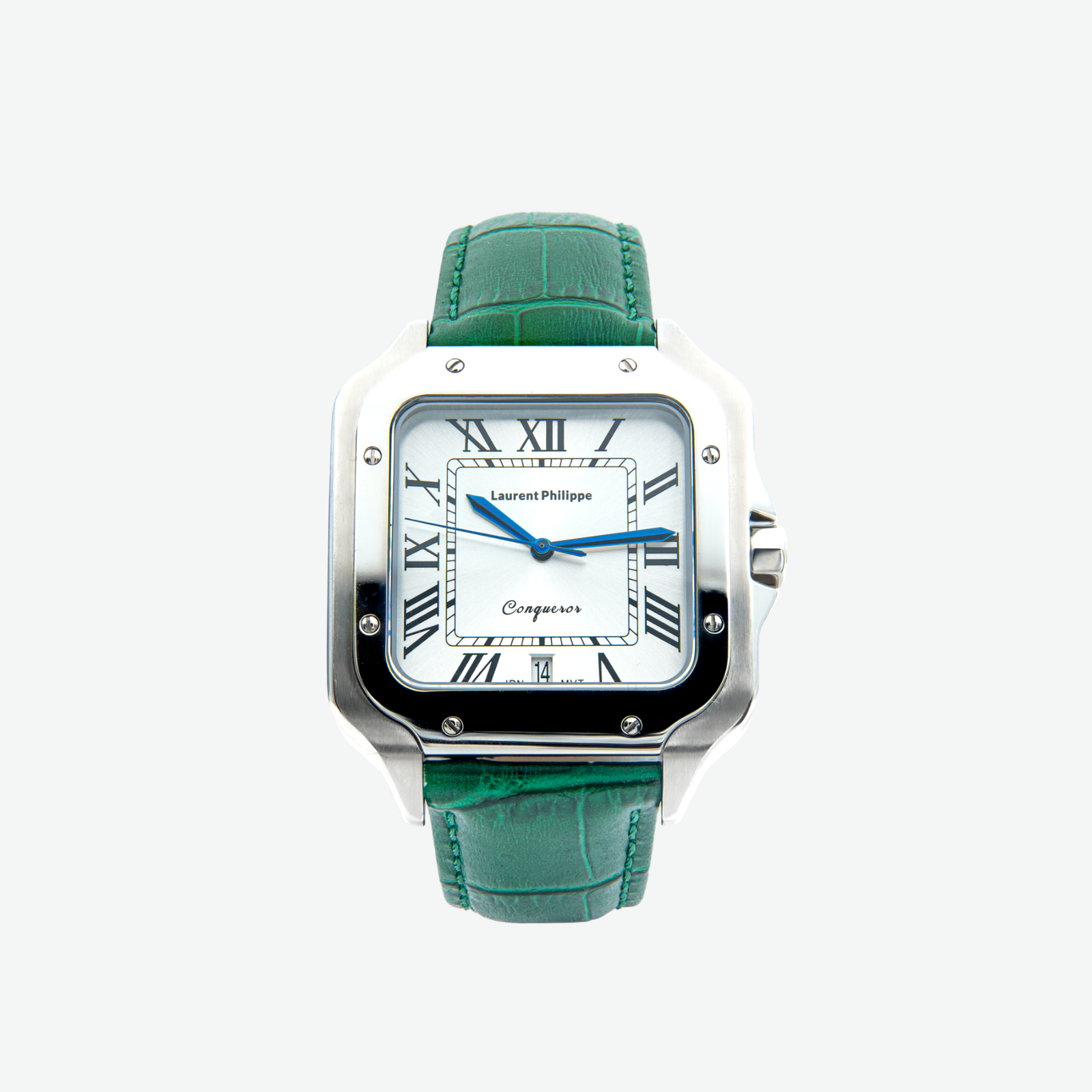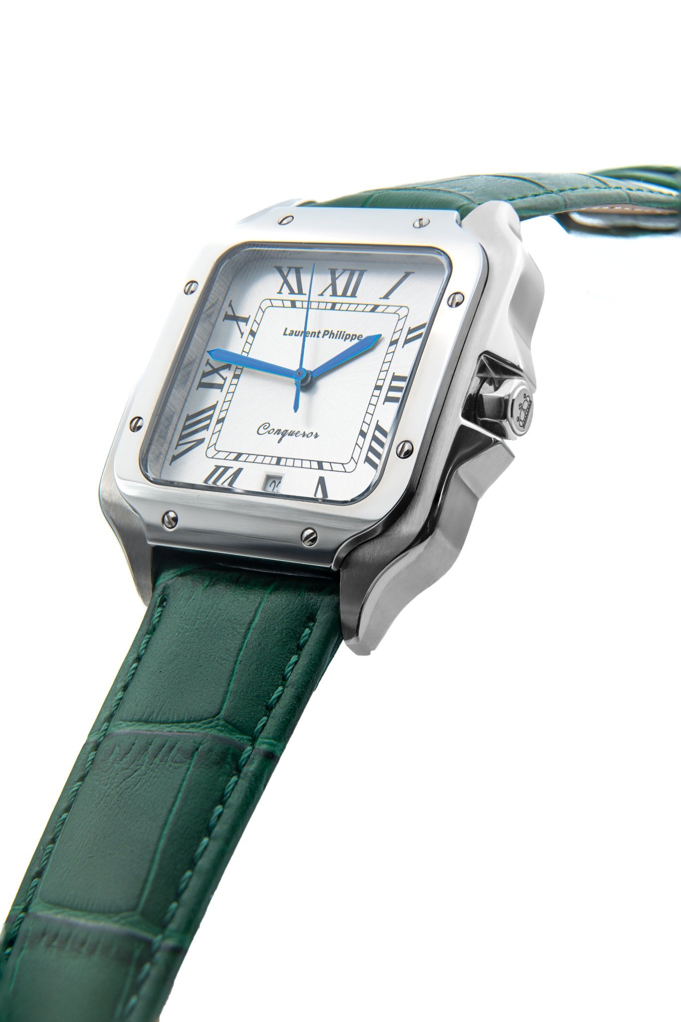 Luxury watch with white dial, stainless steel case, and handcrafted deep green leather strap — a bold fusion of rarity, sensuality, and timeless intensity.