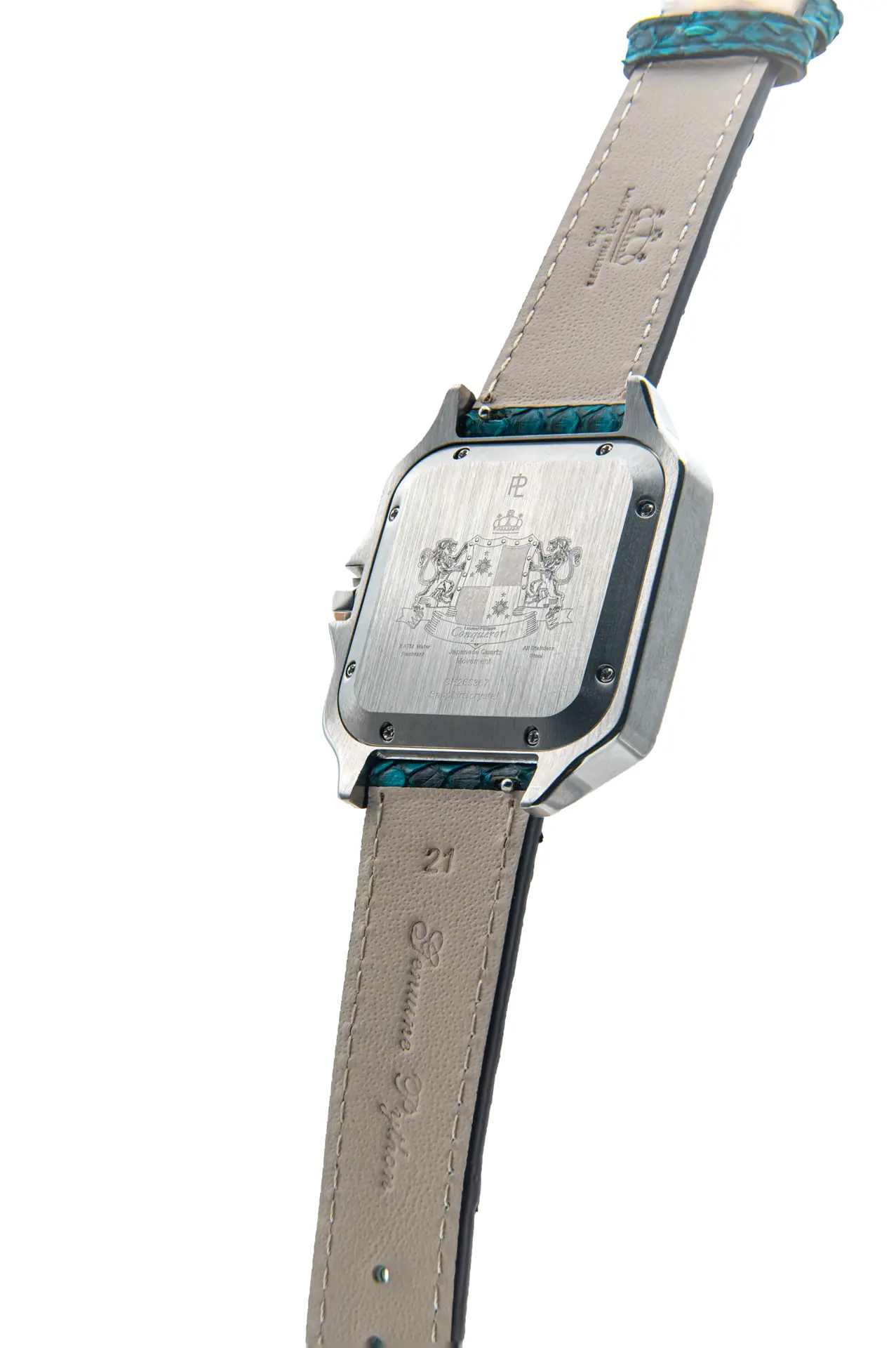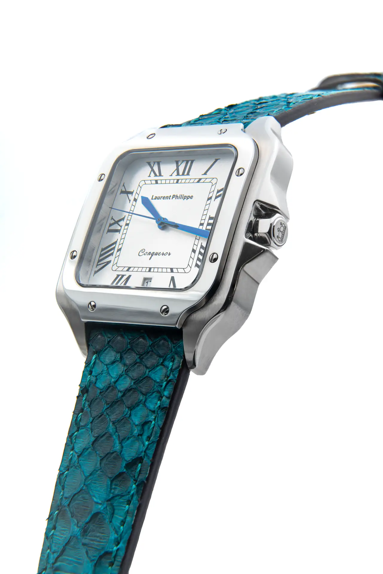 Luxury steel watch with white dial and handcrafted cyan-blue python leather strap — a bold contrast of clarity and instinctual power.