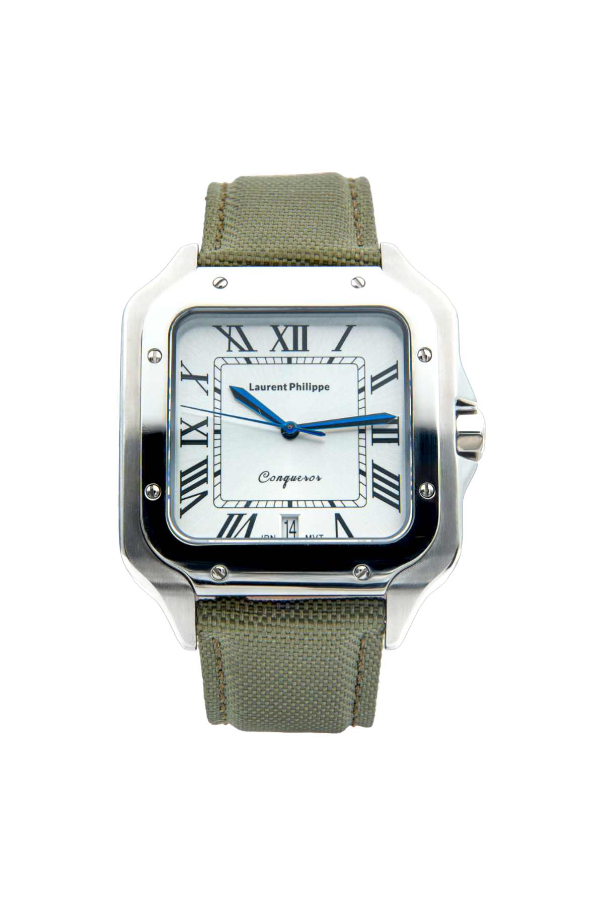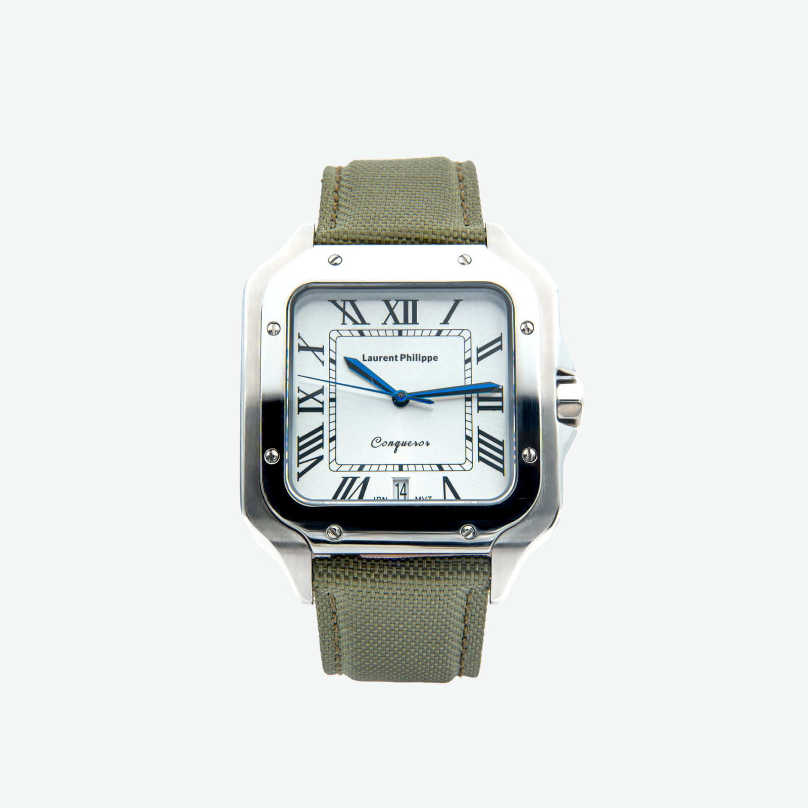 Luxury watch with white dial, stainless steel case, and handcrafted olive green textile strap — a refined union of discipline, texture, and clarity.