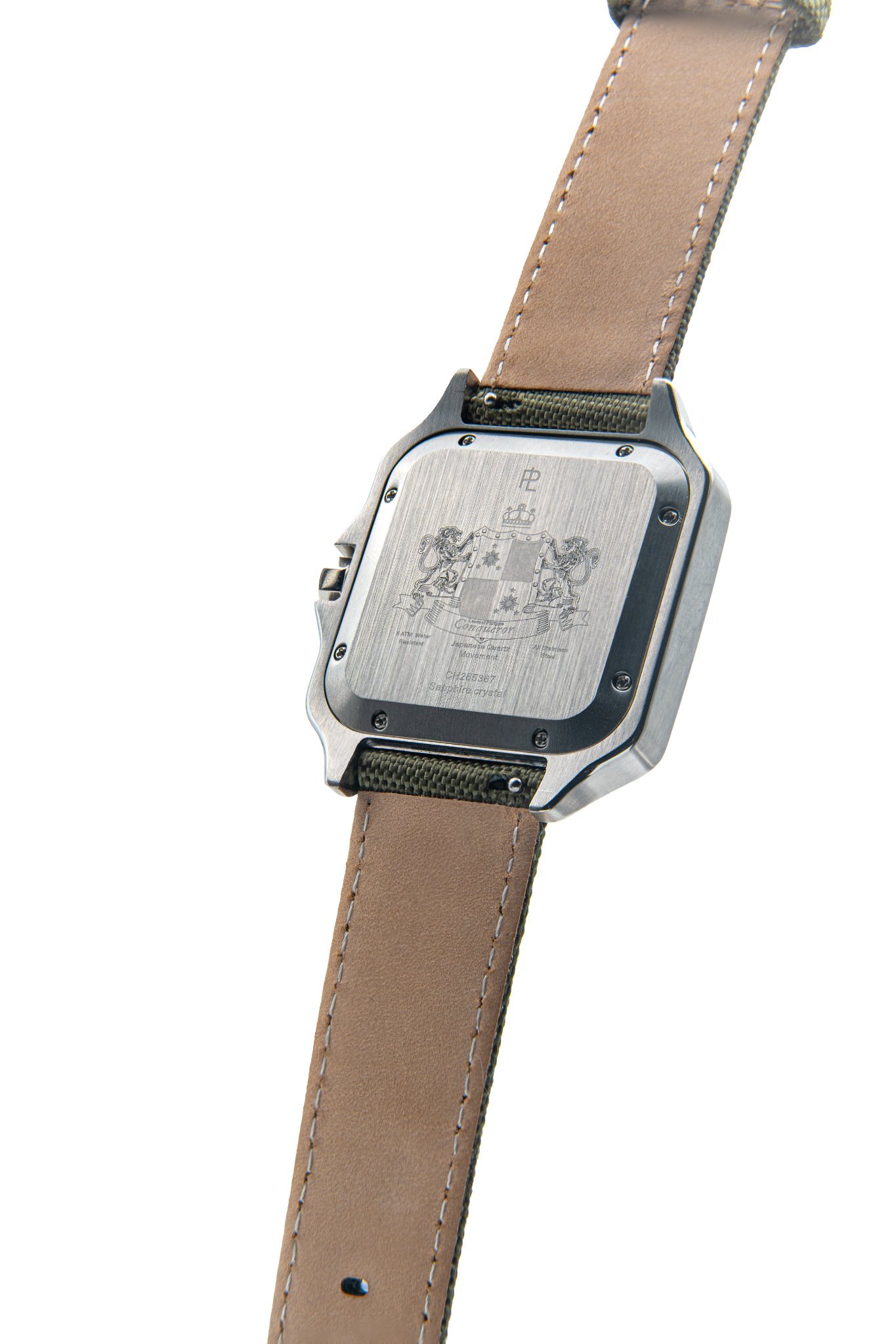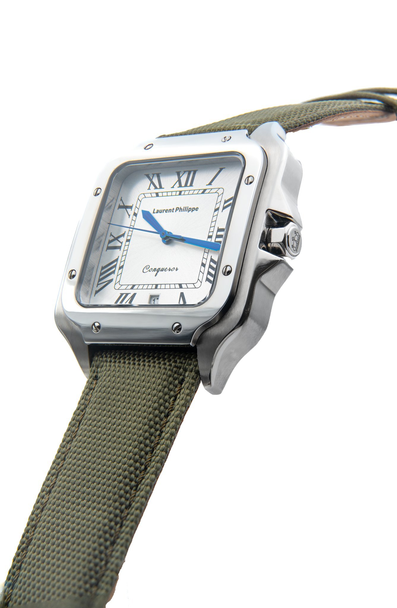This edition combines the crisp white dial with a polished stainless steel case in a composition of strength and restraint. The Verde Armato strap — crafted from durable olive-green textile — evokes a quiet force, reminiscent of classic military aesthetics and grounded elegance. Defined by balance and texture, it carries the watch with silent authority and purpose.