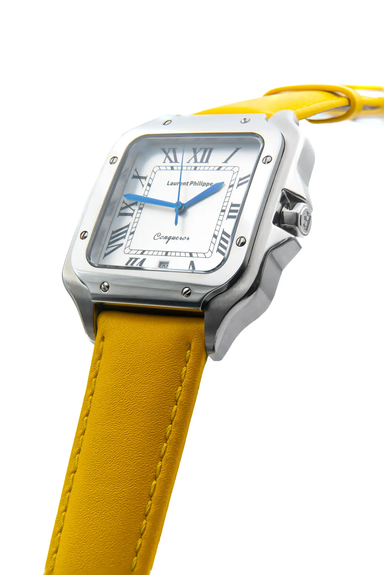 Luxury steel watch with white dial and yellow cow leather strap — a daring mix of clean design and untamed personality.