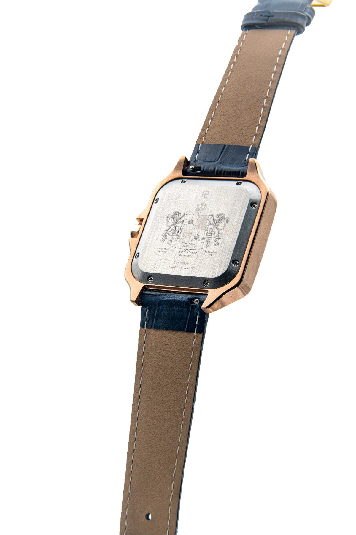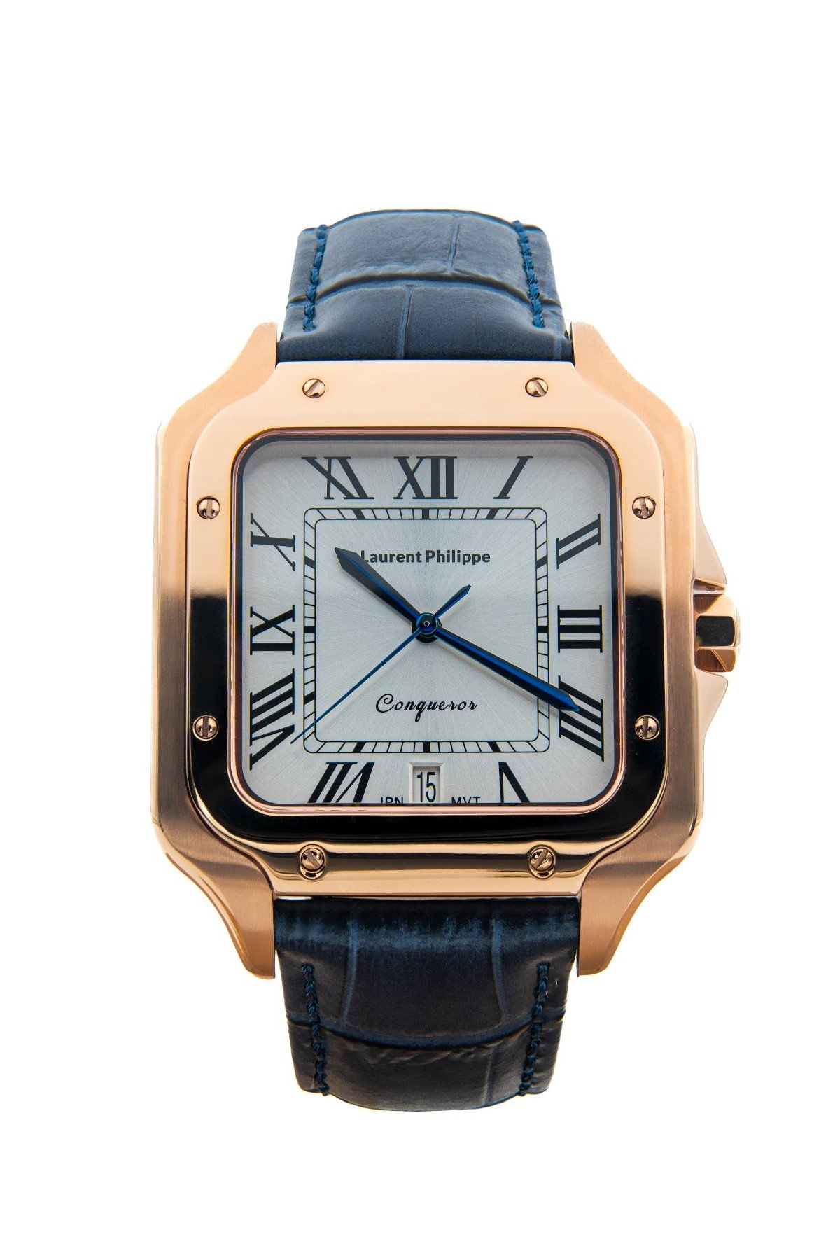 Rose gold watch with white dial and deep blue cow leather strap — refined, magnetic, and instinctively bold.