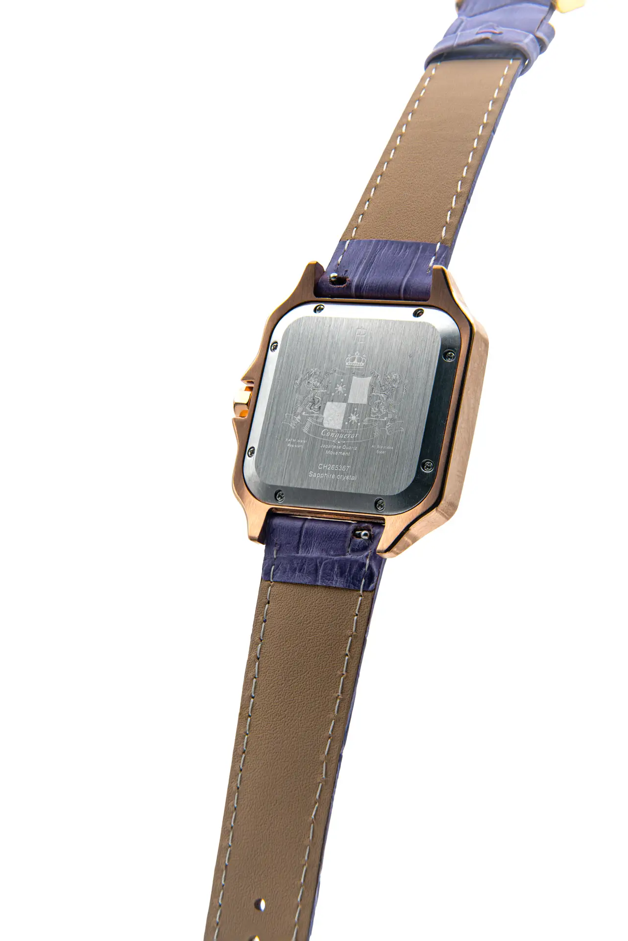 Encased in rose gold, the dial remains stark and balanced — classical Roman numerals, white satin finish, and blue hands with sharp intent. The Orchidée Nocturne strap, handcrafted from cow leather in a deep violet tone, introduces an unusual tension — rich in color, yet cold in attitude. It’s a presence that doesn’t soften — it defines.
