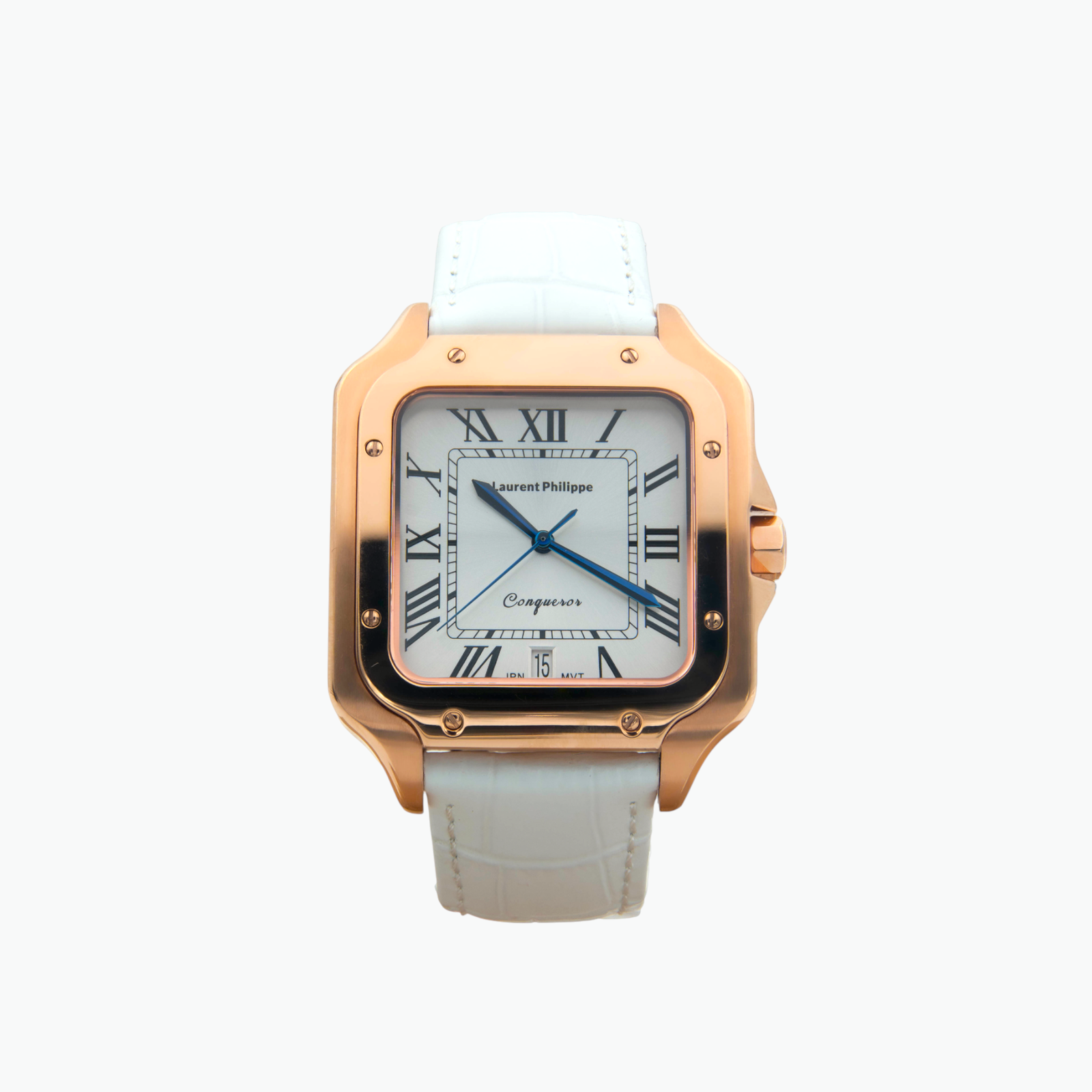 Rose gold watch with white dial and white cow leather strap — bold, immaculate, and unapologetically refined.