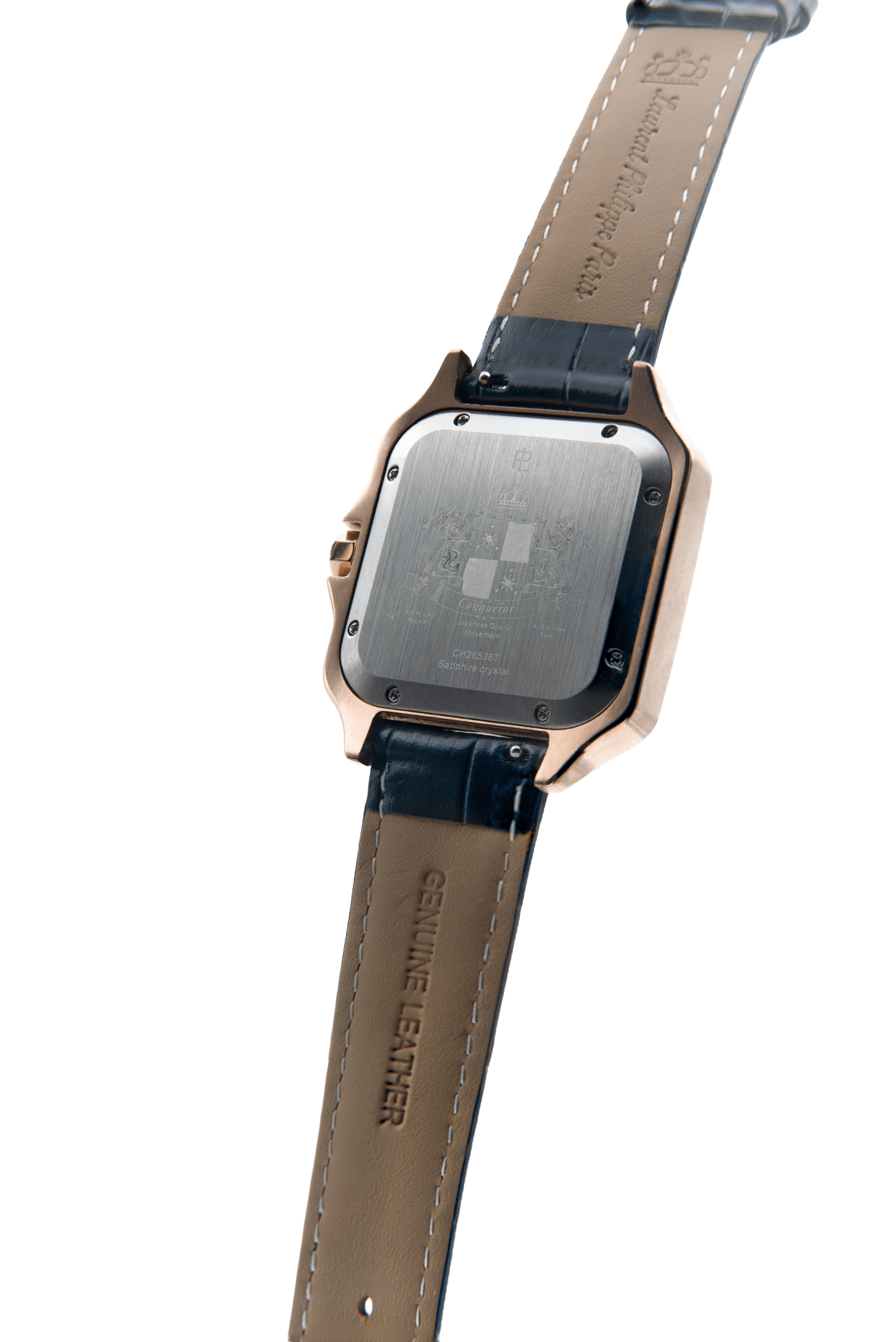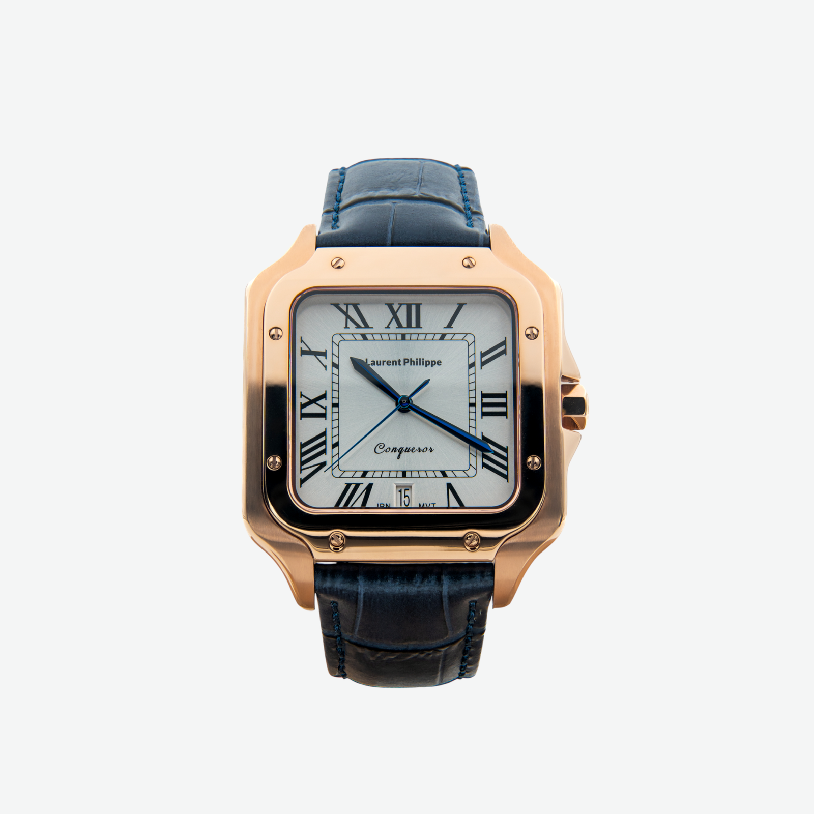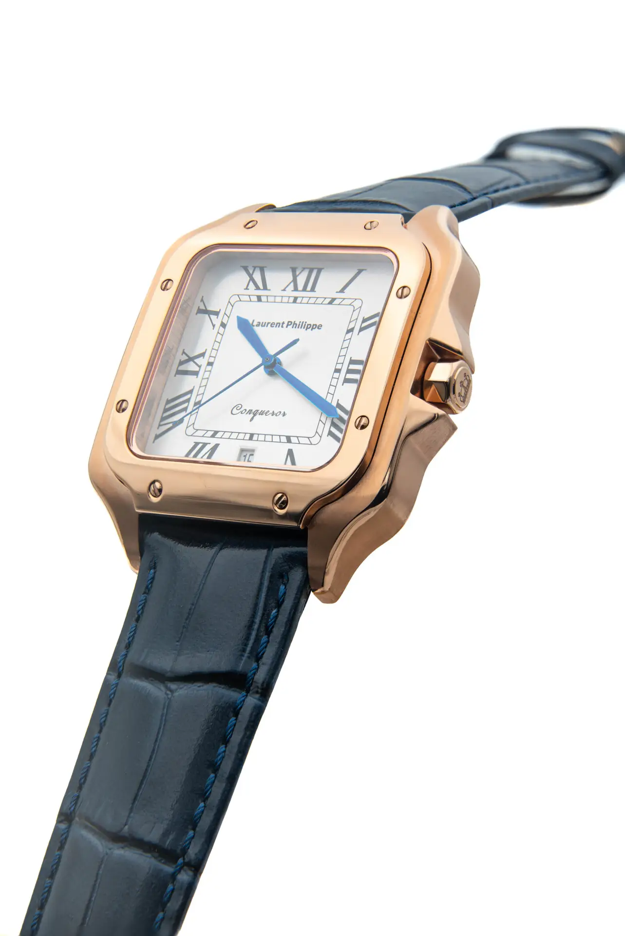 Rose gold watch with white dial and deep blue cow leather strap — bold, sculptural, and unapologetically distinctive.