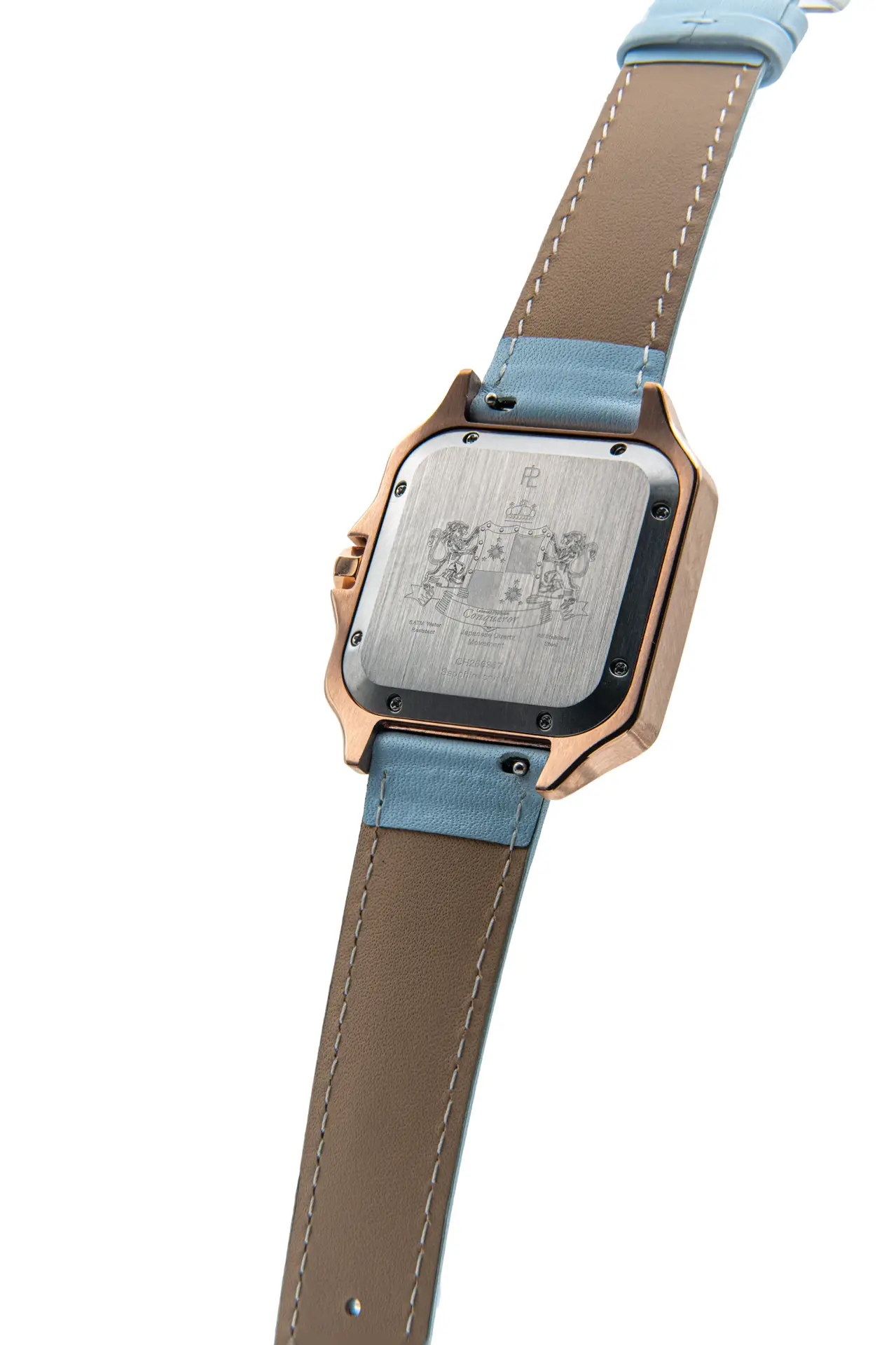 The white dial, framed in rose gold, holds its form — clean, classical, precise. The Icy Petal strap brings an unexpected twist: handcrafted from cow leather in a pale, cool turquoise. The tone is soft in appearance, but calculated. There’s clarity here, but also control — a presence that keeps its distance while drawing you in.