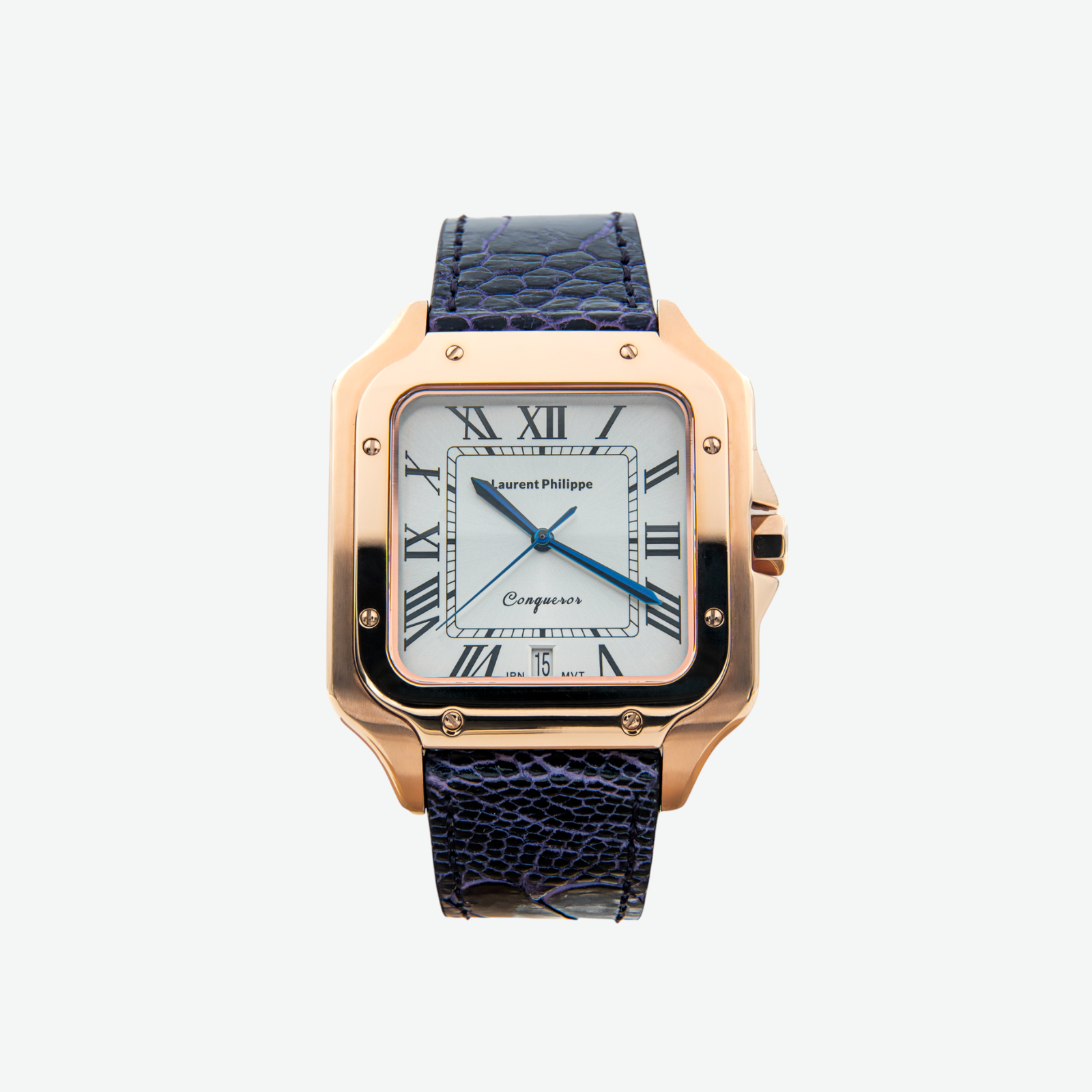 Encased in rose gold, the white dial with Roman numerals and deep blue hands stays controlled, precise. But the Mystic Pearl strap shifts the tone — handcrafted from exotic ostrich leather dyed in a dark violet-black with subtle pearl-like reflections. The surface is textured, the presence enigmatic. A configuration built not for clarity, but for tension — and that’s where its power lies.