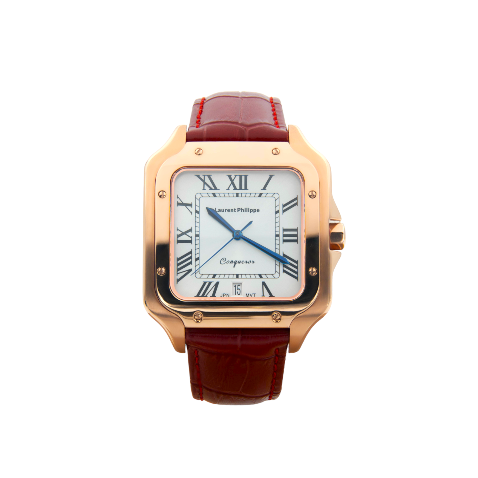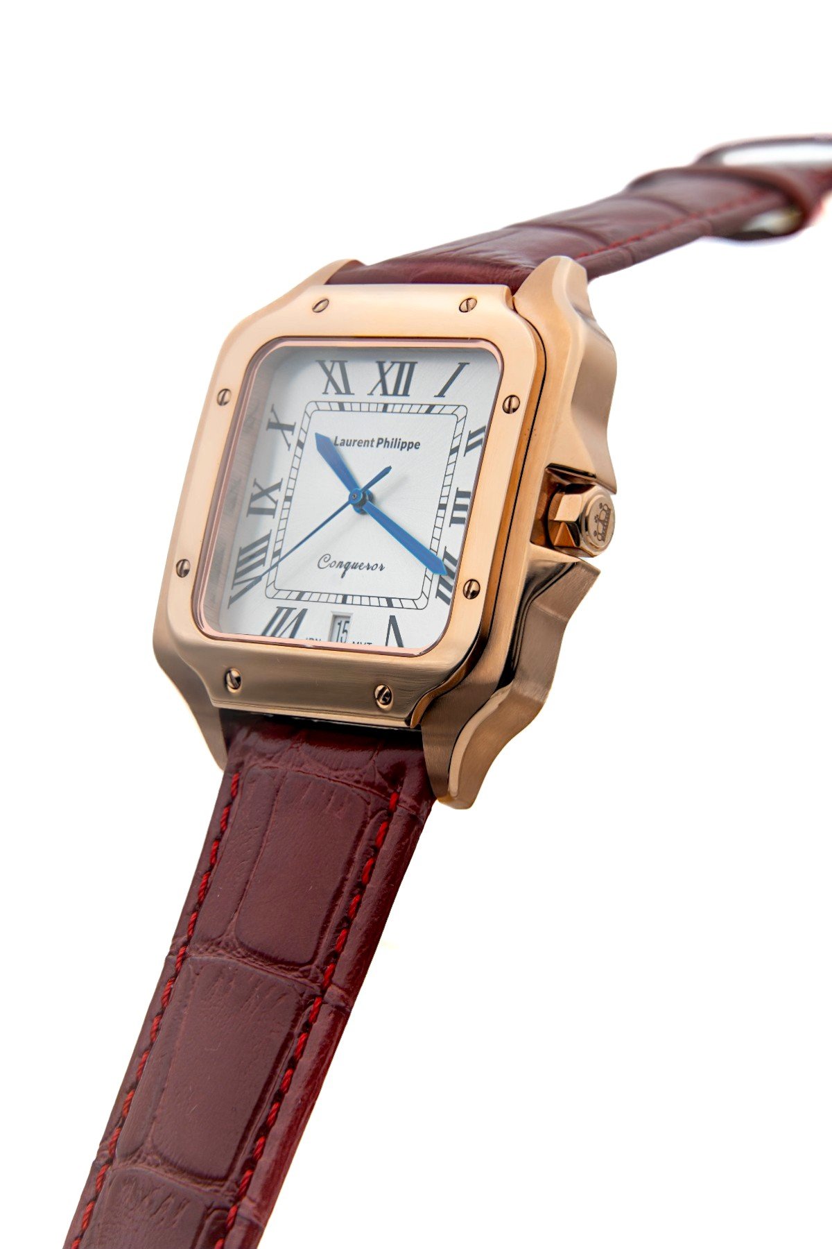 Rose gold watch with white dial and crimson cow leather strap — refined, assertive, and intensely charismatic.