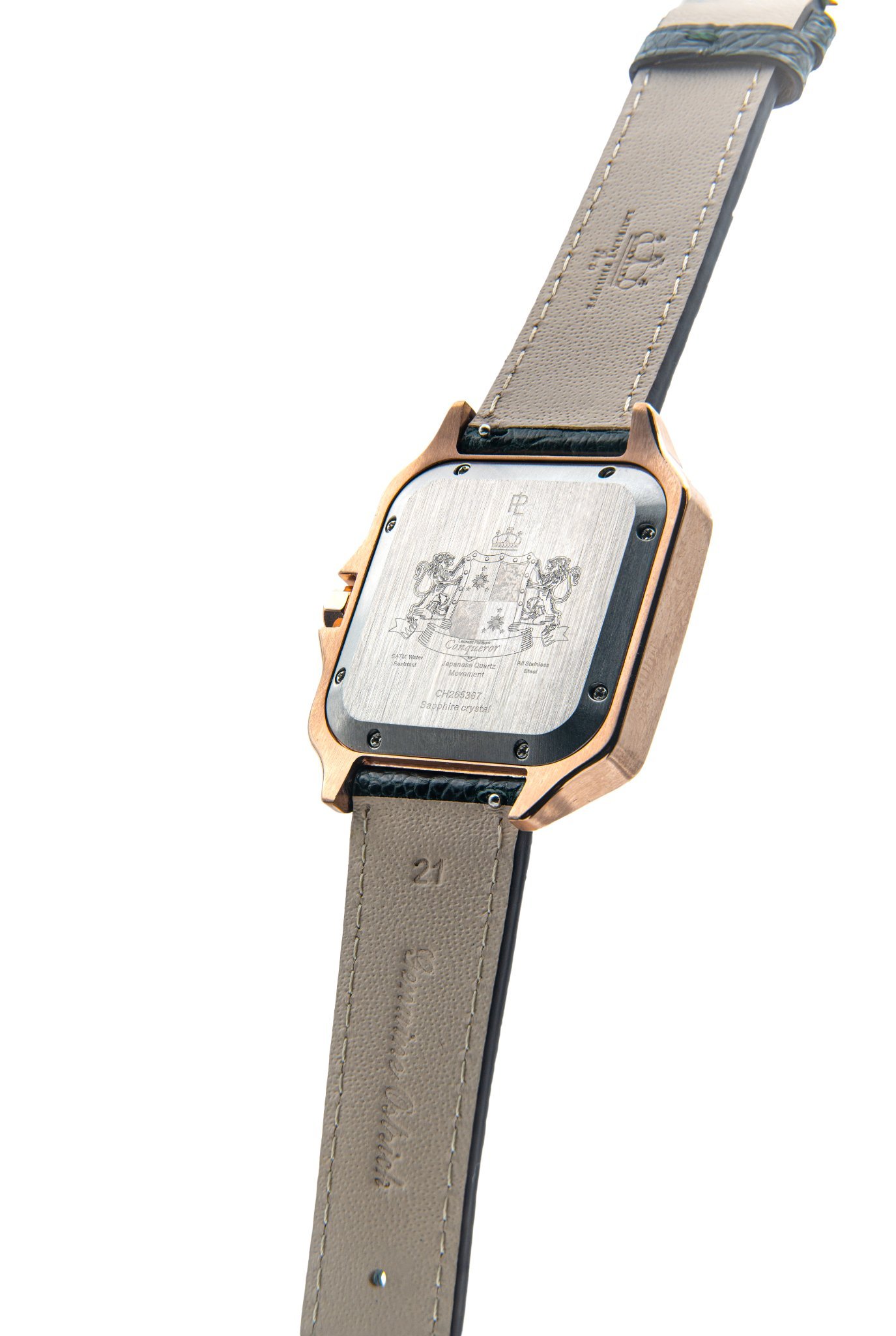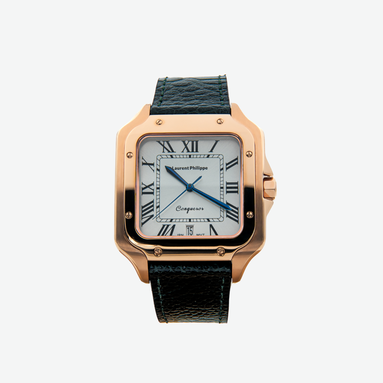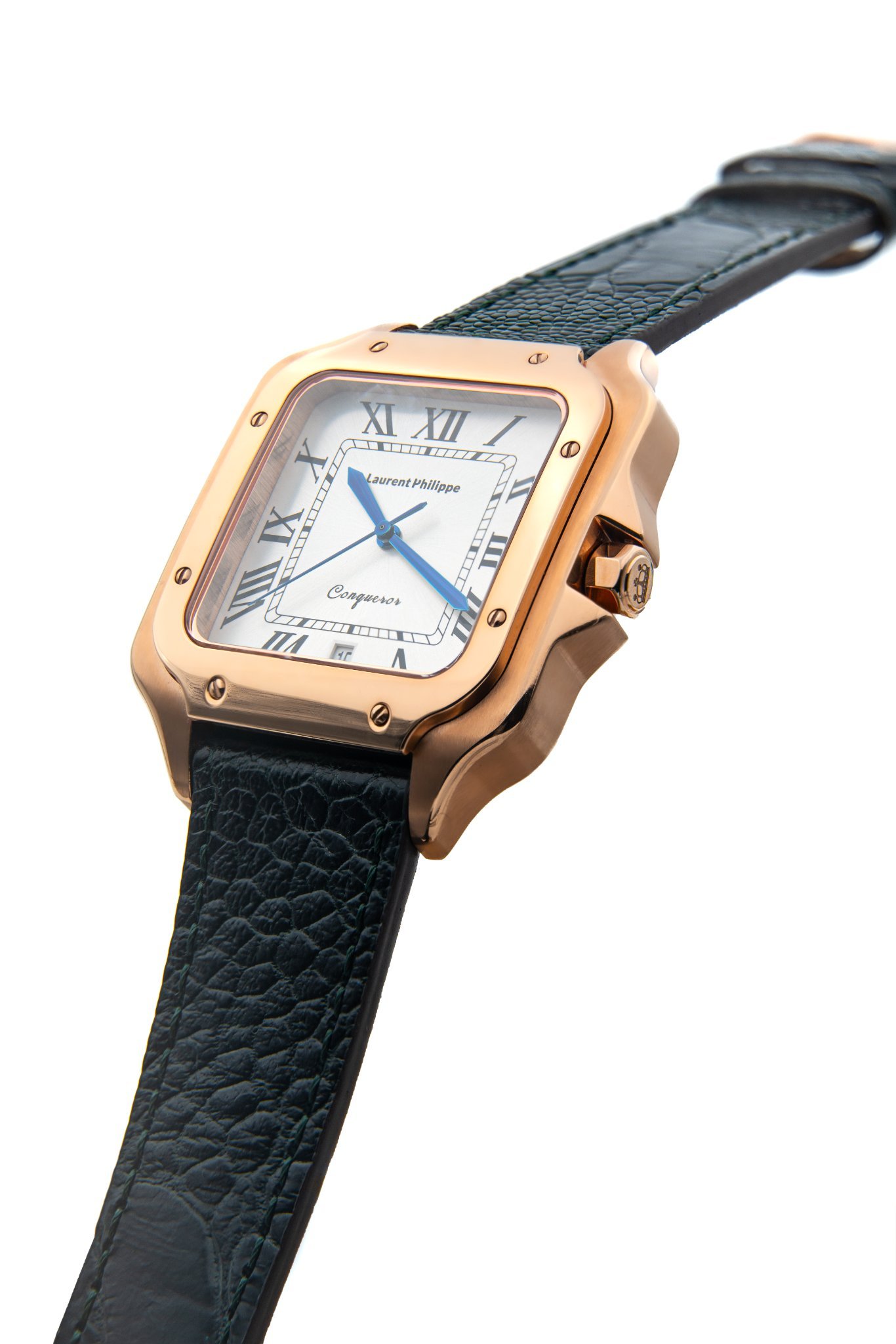 Rose gold watch with white dial and dark green ostrich leather strap — bold, structured, and visually grounded.