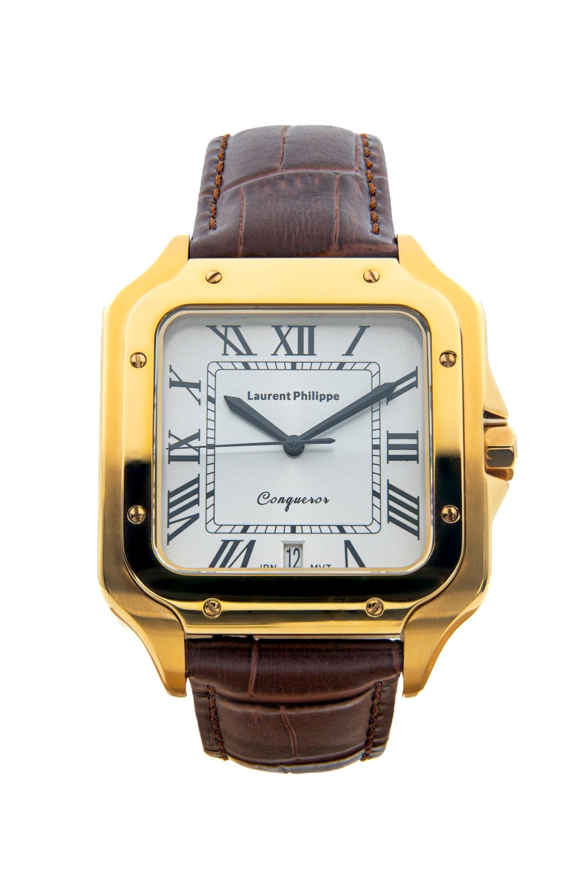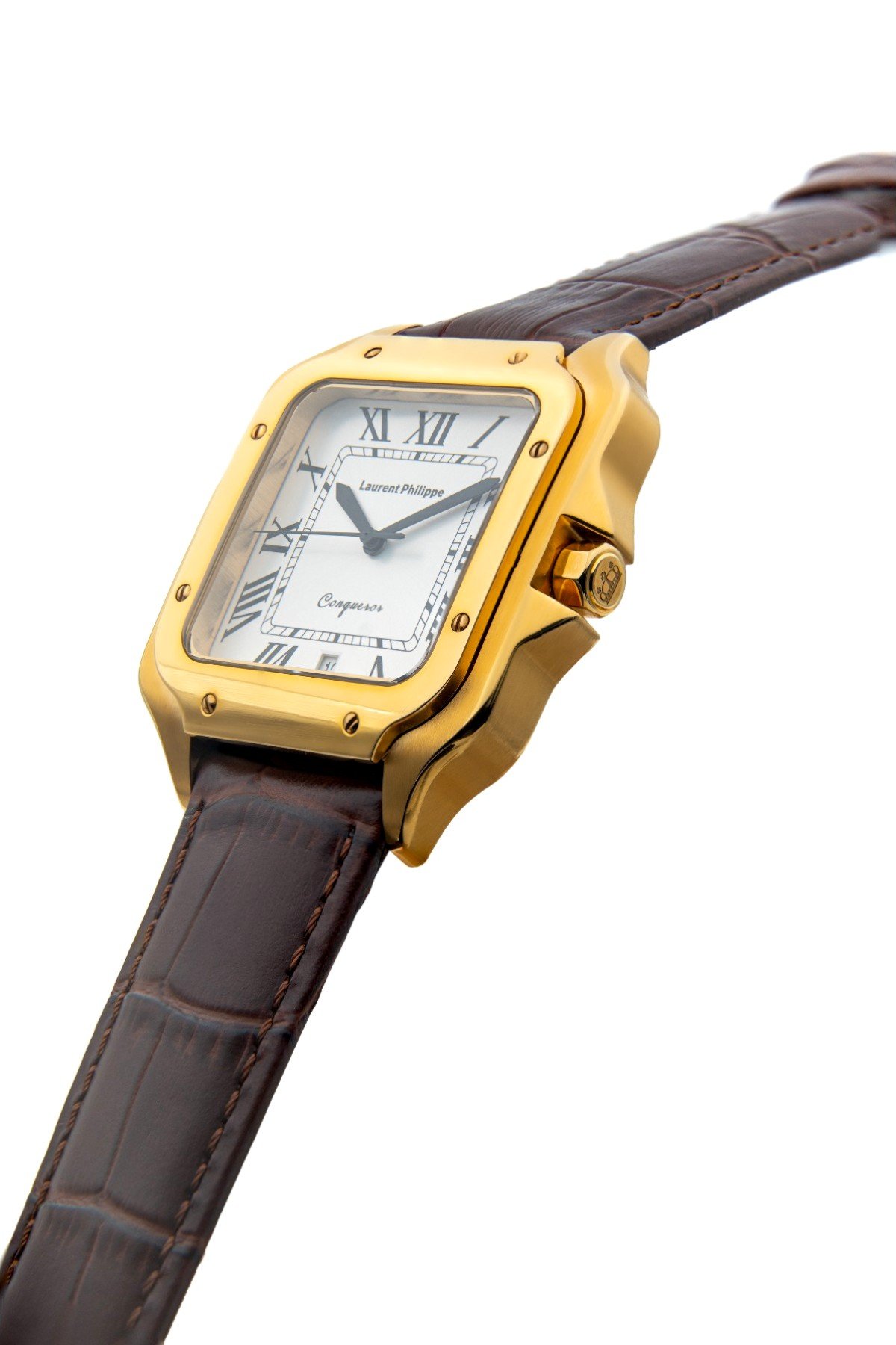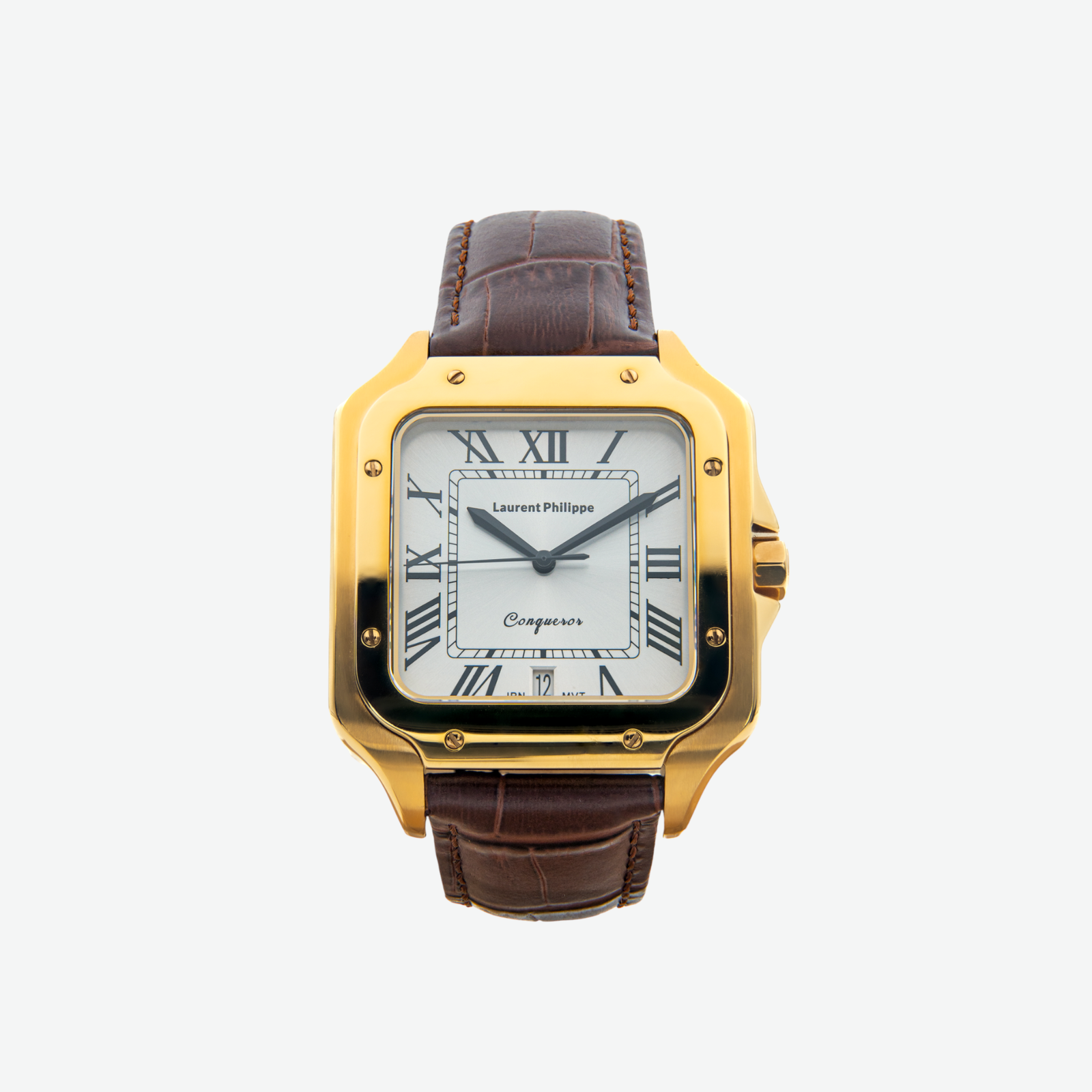 Gold-tone watch with glossy white dial and dark brown cow leather strap — aristocratic, structured, and steeped in noble refinement.