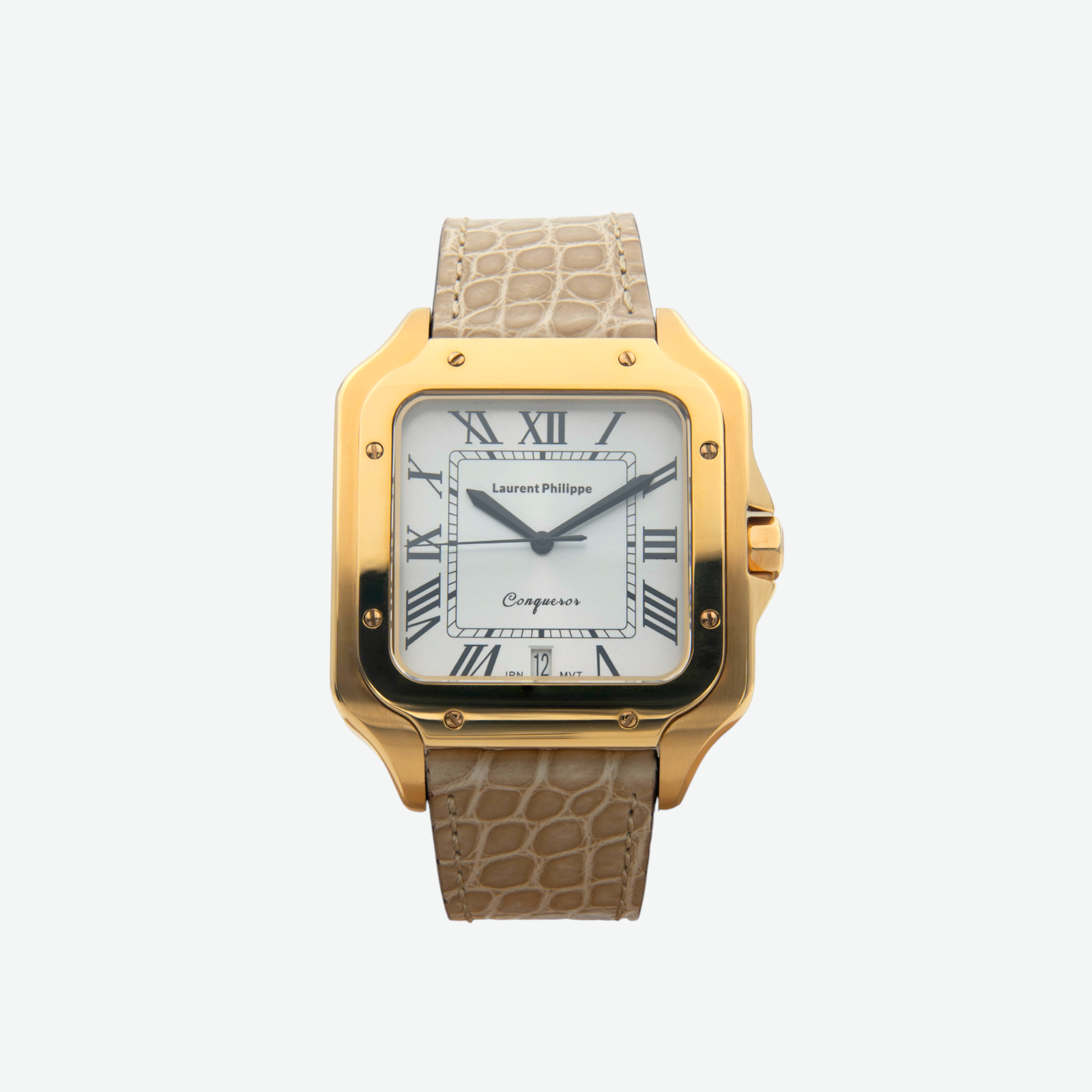 Gold-tone watch with glossy white dial and beige crocodile leather strap — rare, serene, and sculpted like a pearl in the desert.